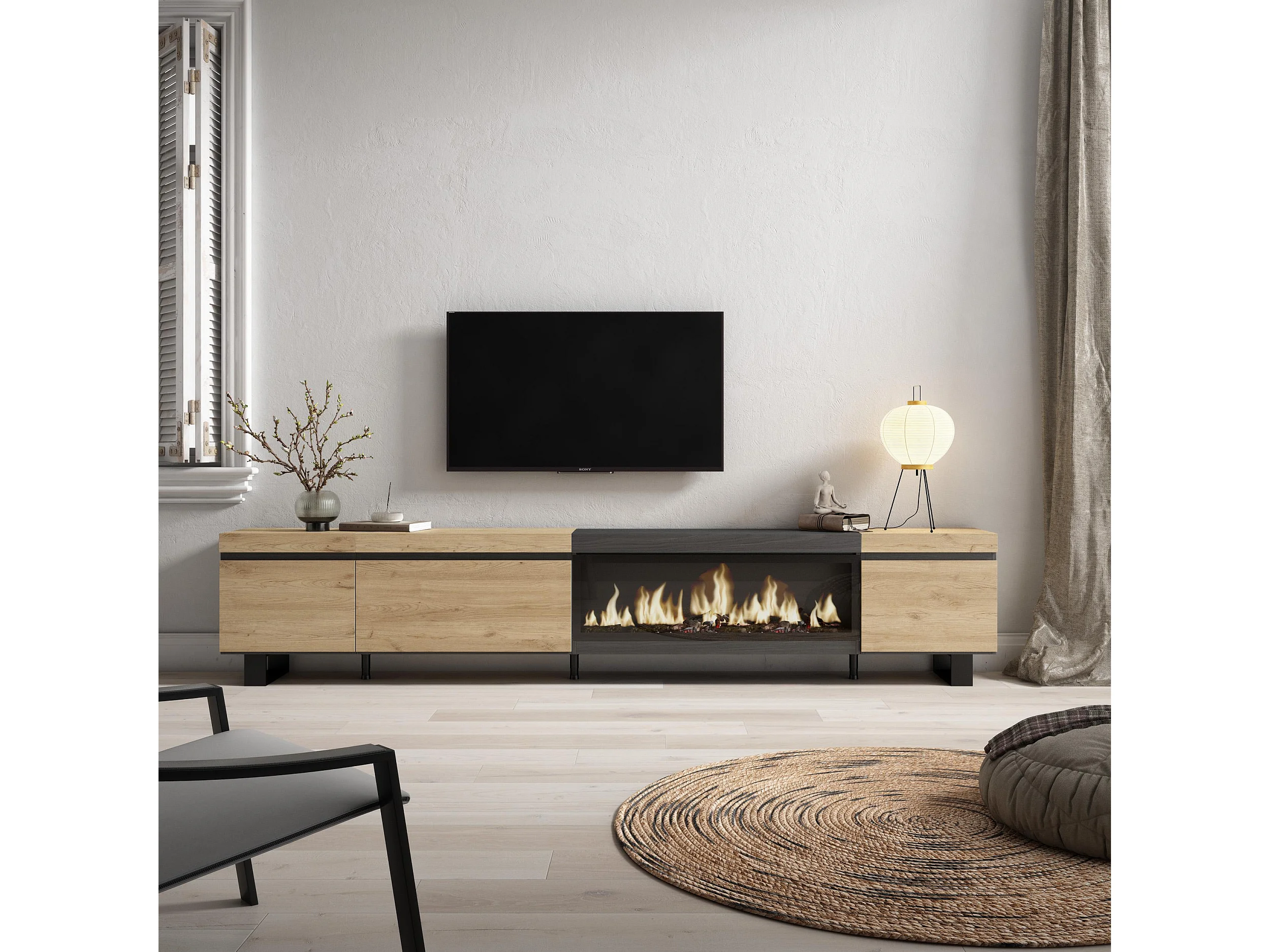 Meuble TV, Banc Télé, 288x35x57 cm, TV grand format, Cheminée électrique XXL, Design industriel, Chêne et noir