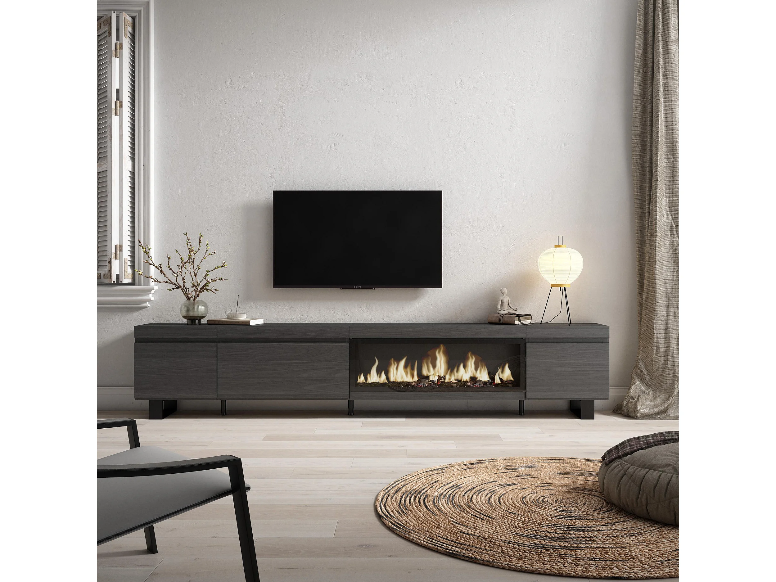 Meuble TV, Banc Télé, 288x35x57 cm, TV grand format, Cheminée électrique XXL, Design industriel, Noir