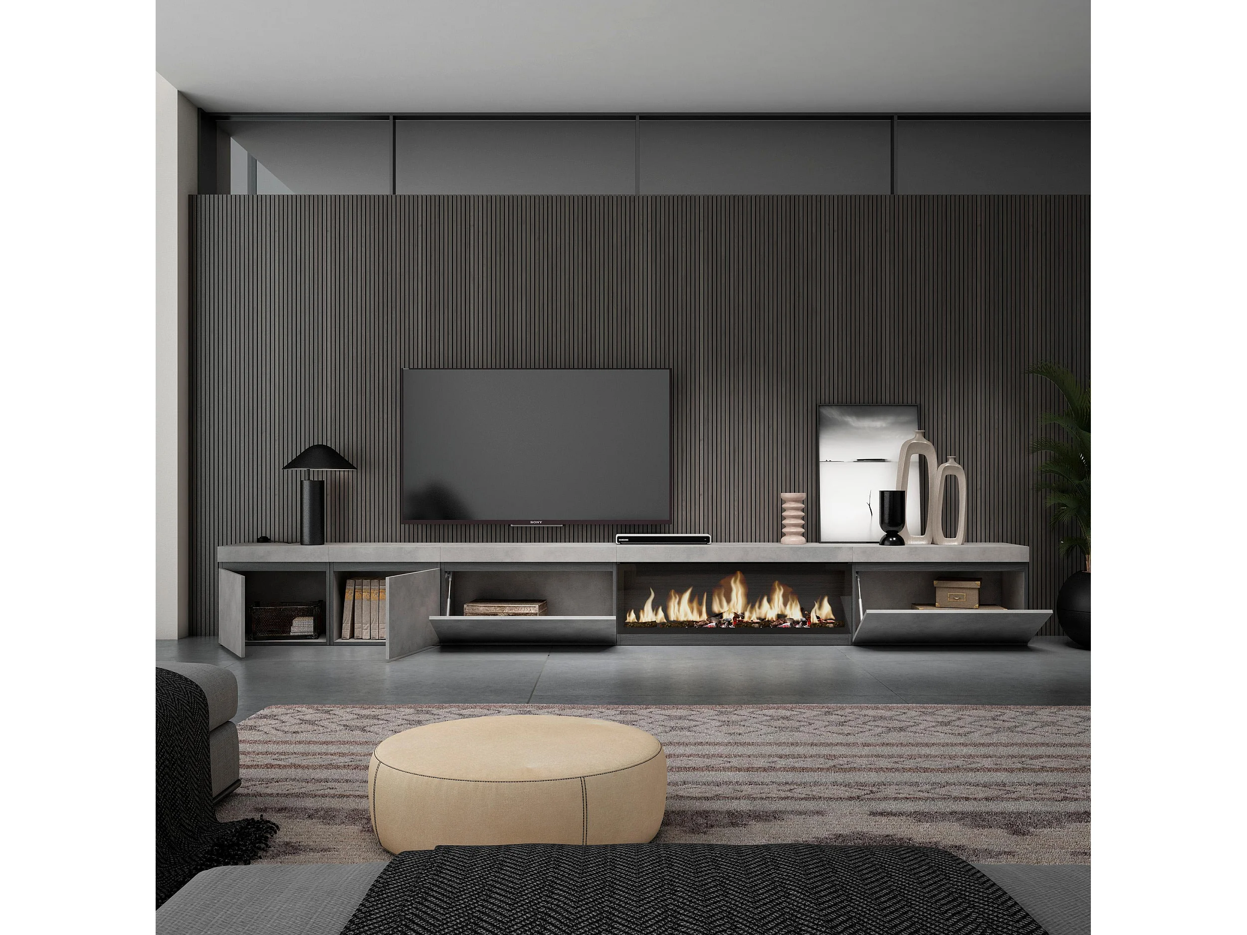 Meuble TV, Banc Télé, 368x35x45, Cheminée électrique XXL, Ciment