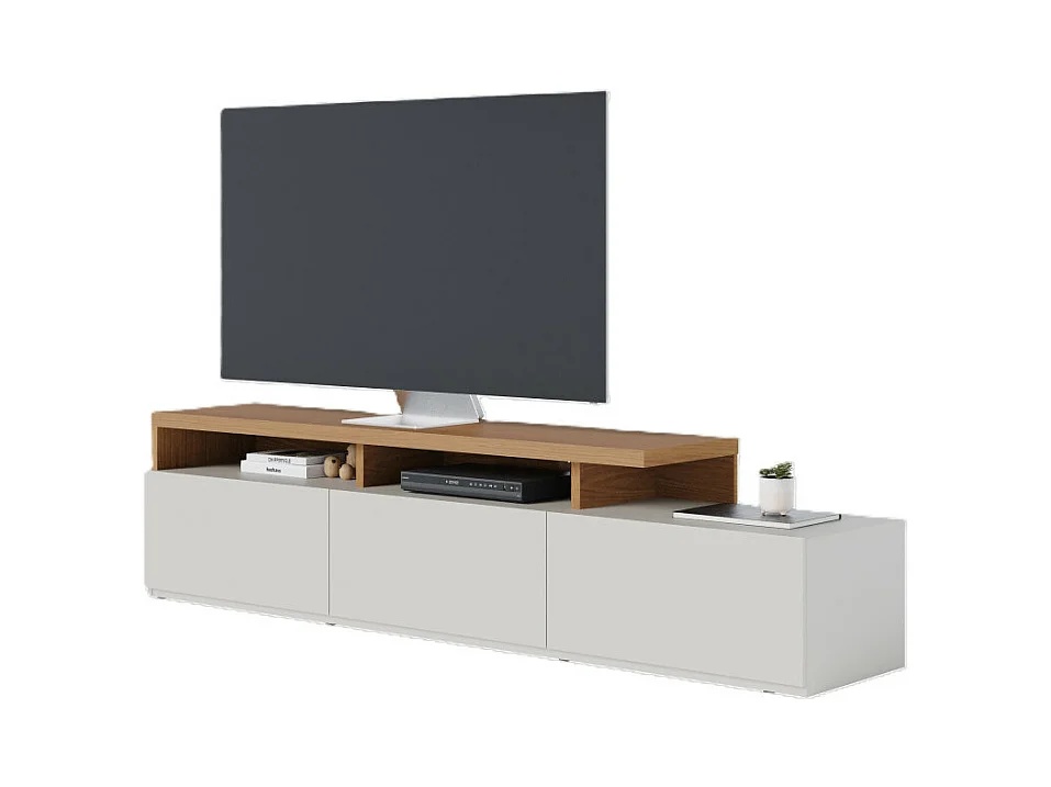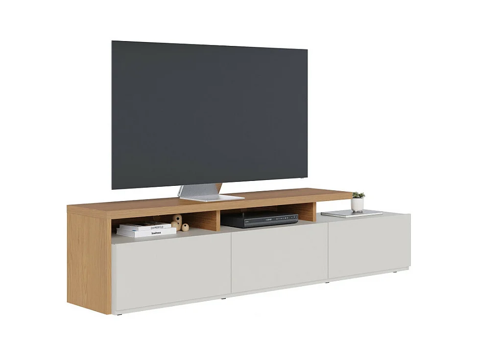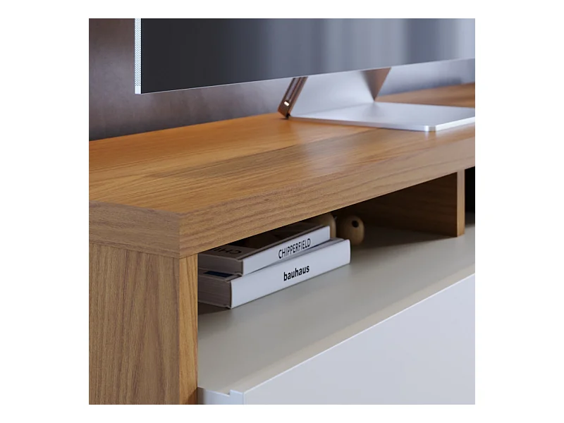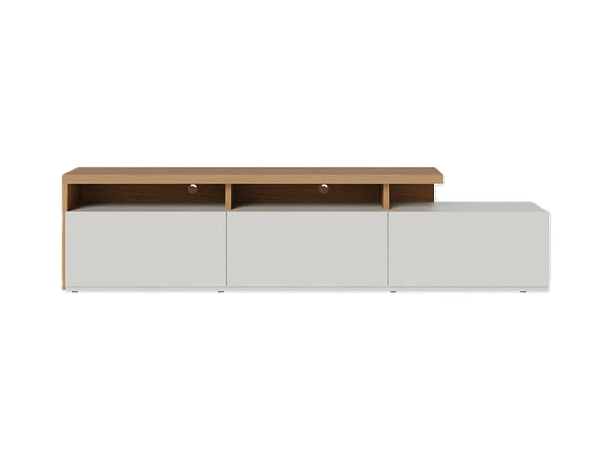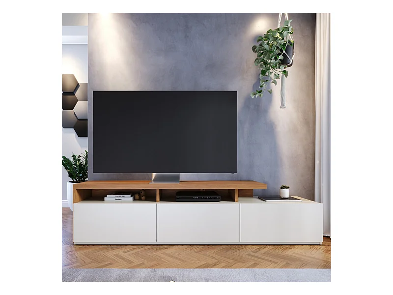 Meuble TV Bar 70 Pouces Chêne et Blanc 3 Portes 6 Niches L 210 H 50.6 P 45.3 cm
