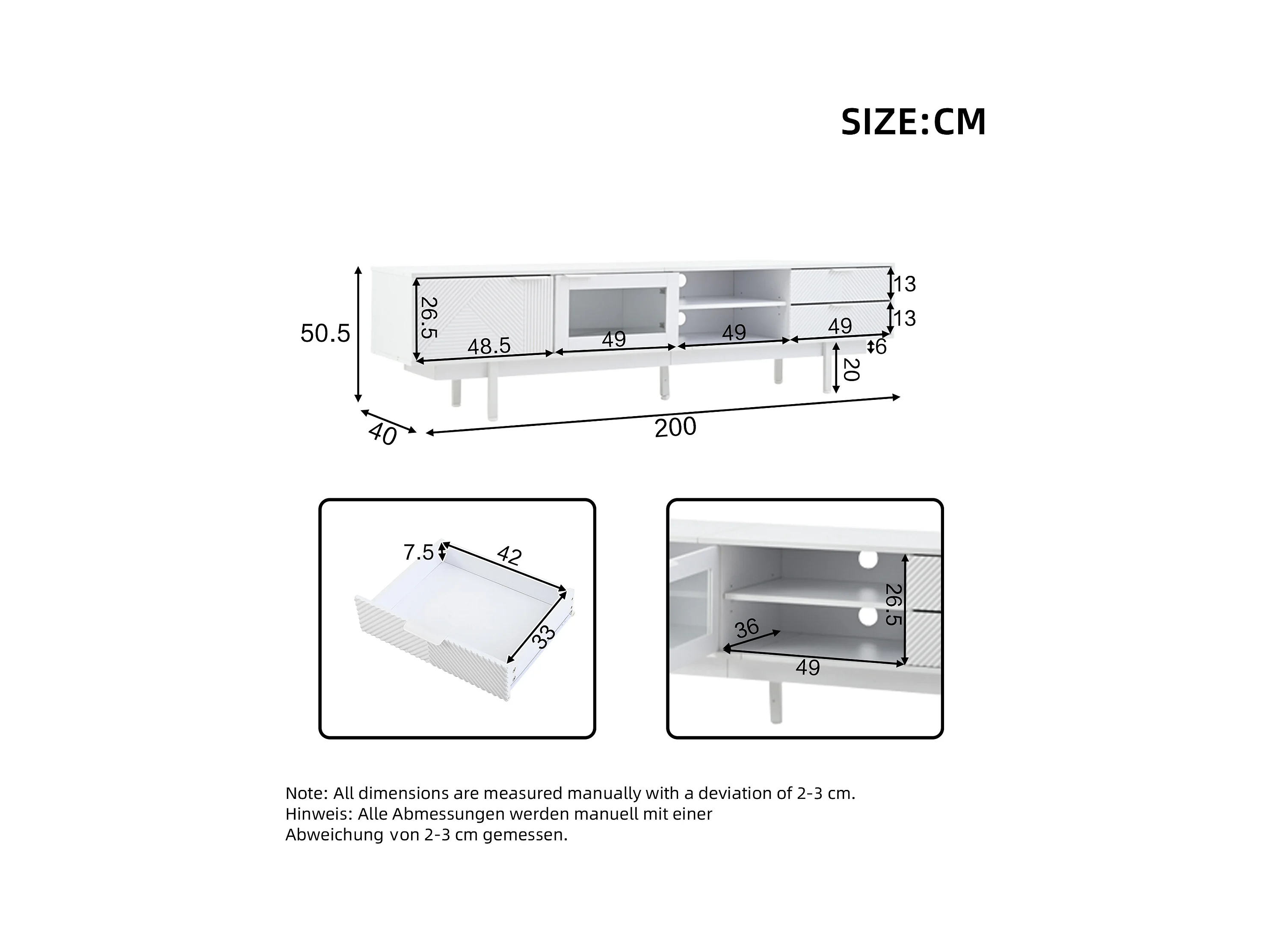 Meuble TV bas, 200 cm de long, avec 2 portes, 2 tiroirs, pour salle à manger, salon, Blanc