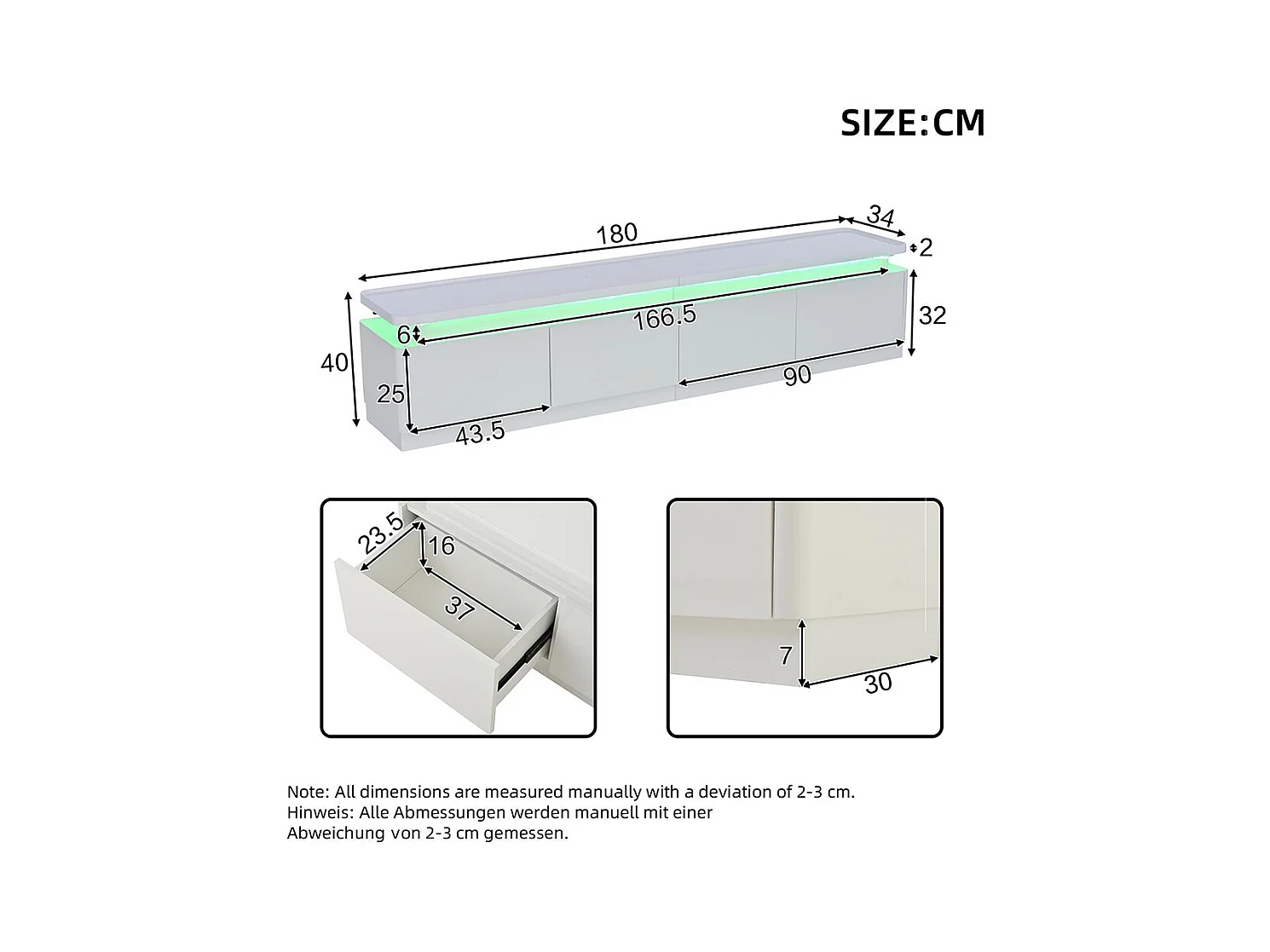 Meuble bas TV moderne 180 cm avec LED – meuble haut pour télévision avec tiroirs et étagères, caisson blanc mat, façades blanc brillant