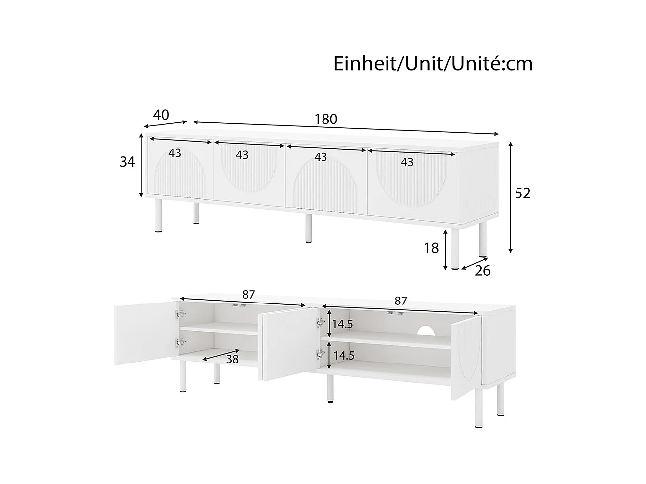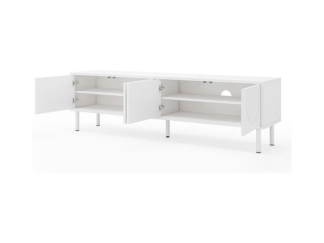 Meuble TV blanc avec 2 compartiments ouverts et 5 portes - 180x38x46 cm