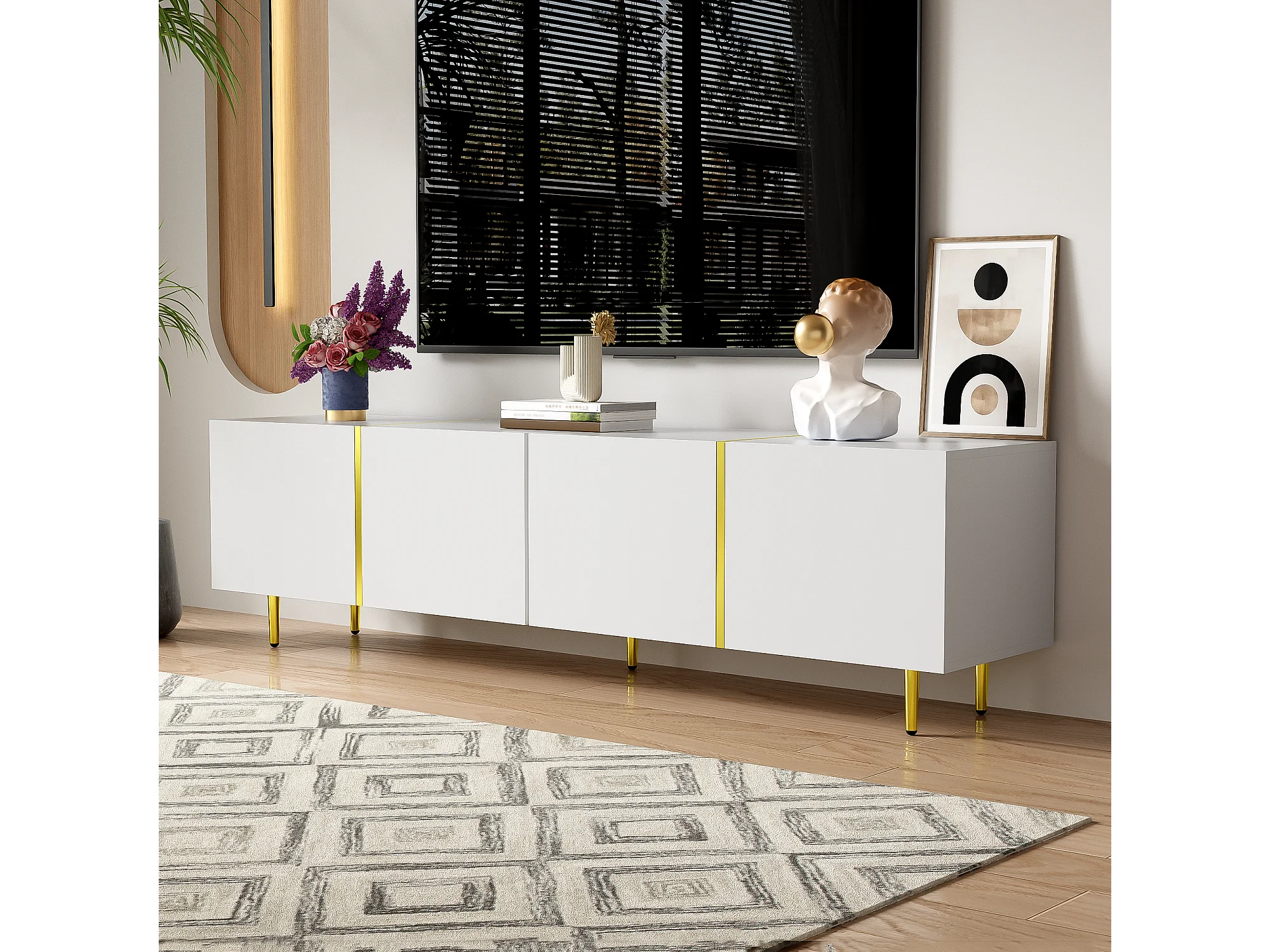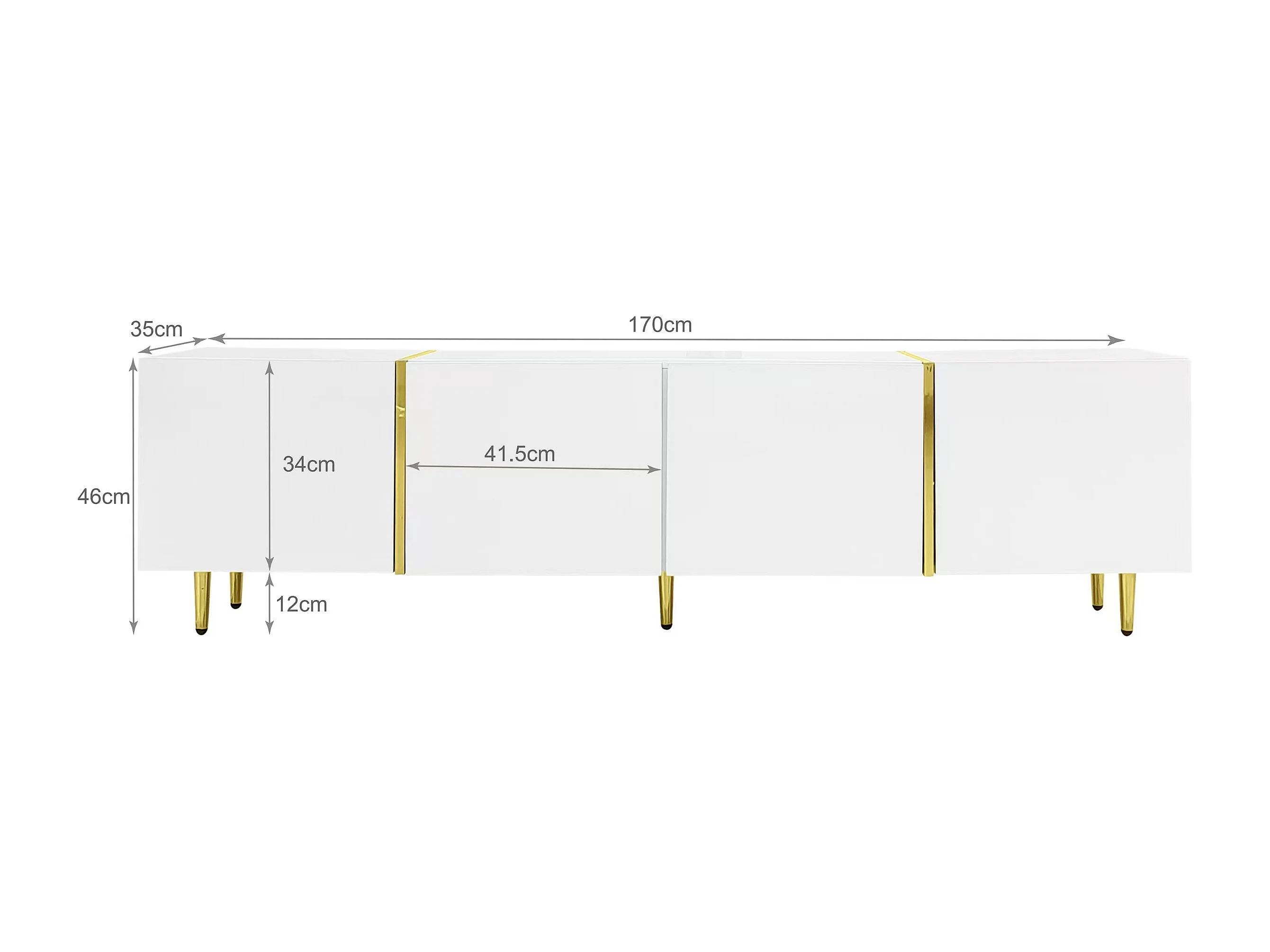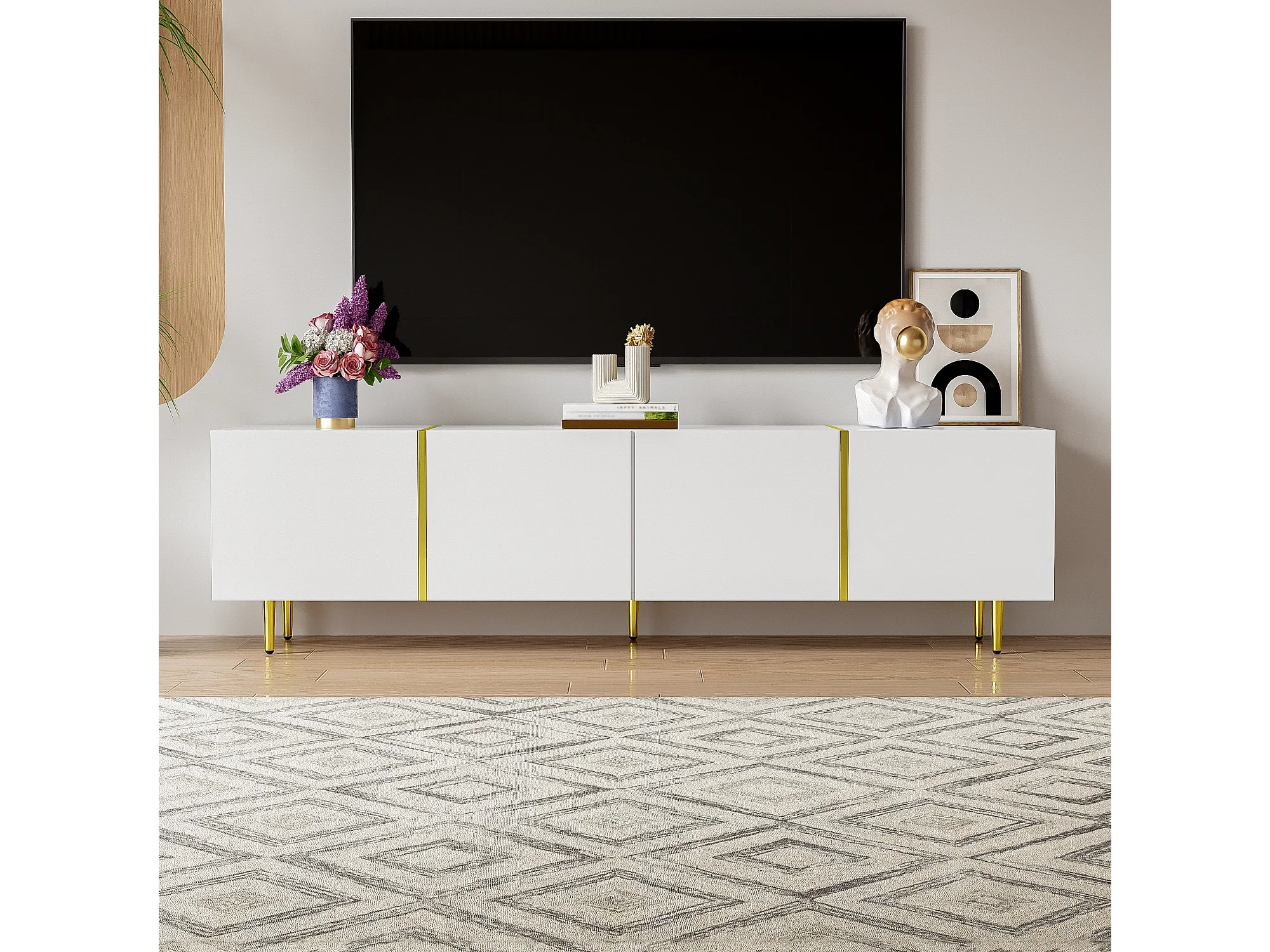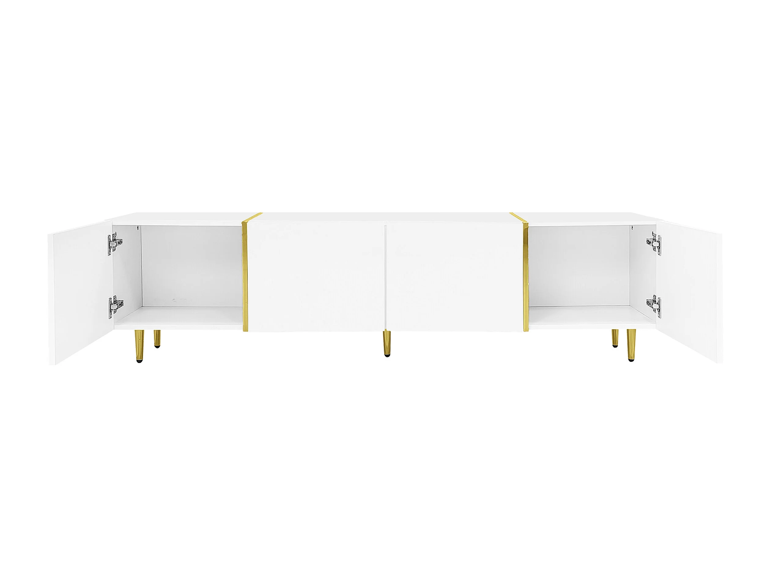 Meuble TV Blanc, Banc TV avec 4 Portes, Meuble Télé de Salon avec Lignes Dorées, 170x35x46cm