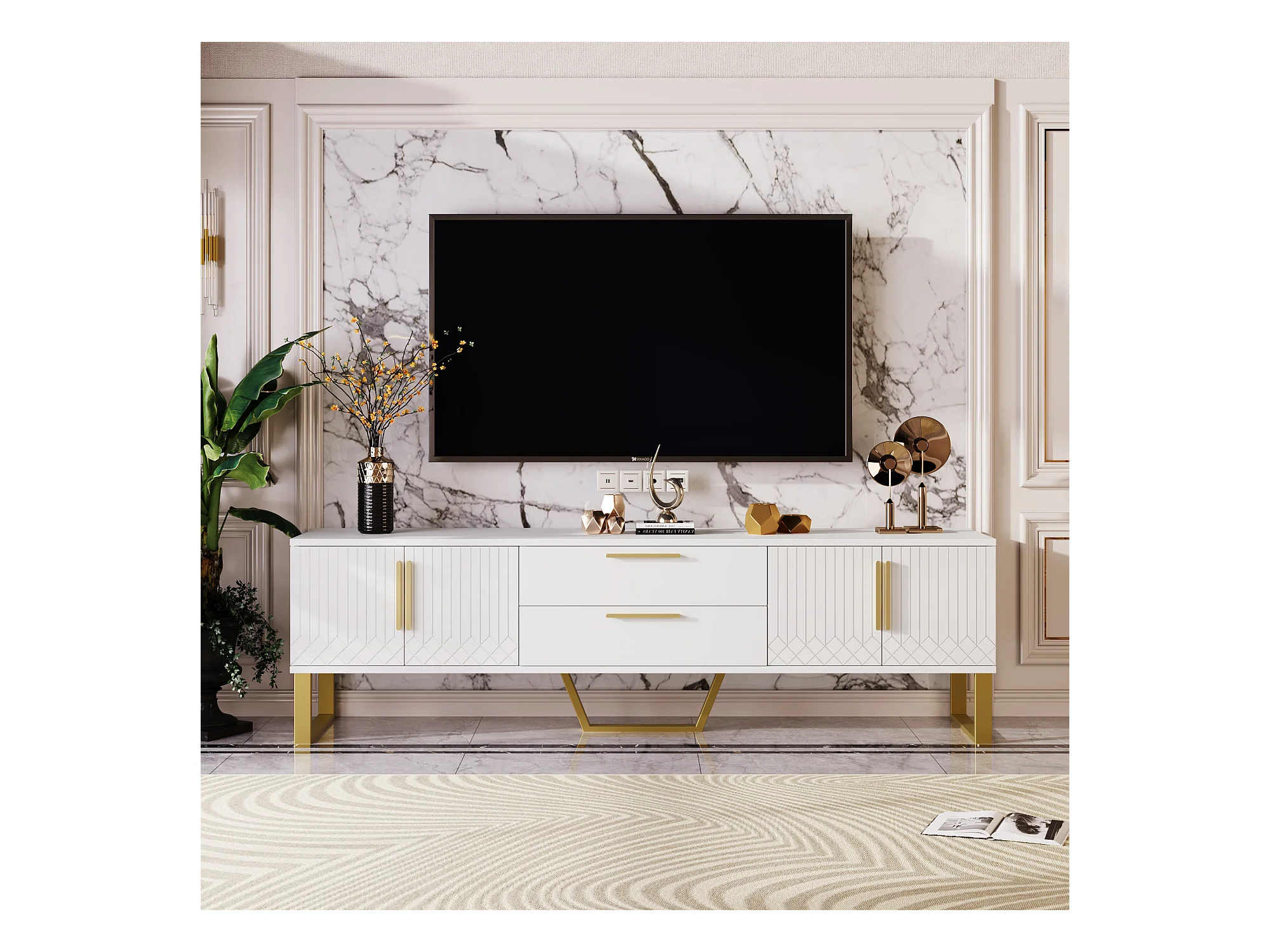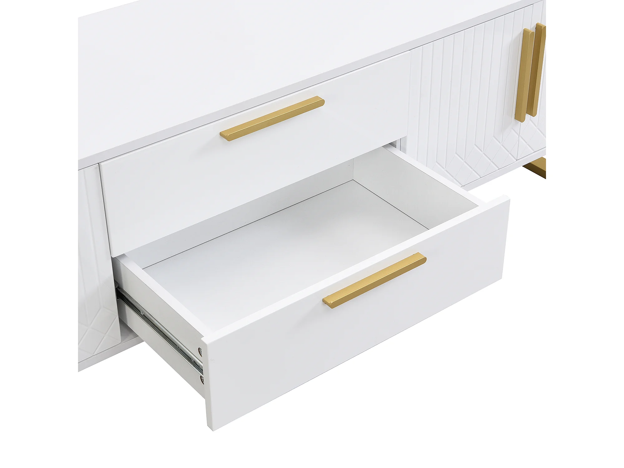 Meuble TV blanc brillant motif gravé avec poignées et pieds dorées 170*40*53cm YAURNUD WHITE