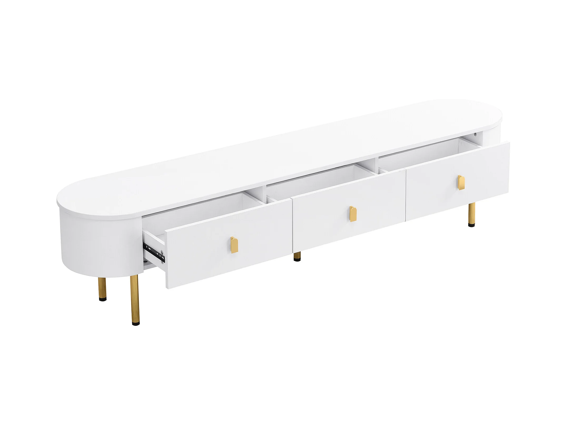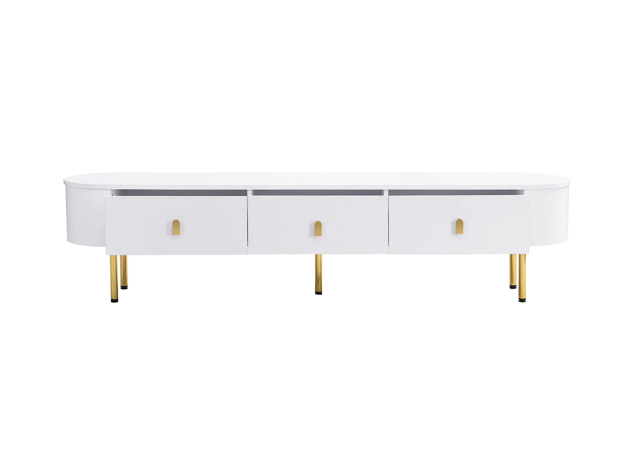 Meuble TV blanc - Meuble TV de salon avec 3 tiroirs de rangement - poignées et pieds dorés