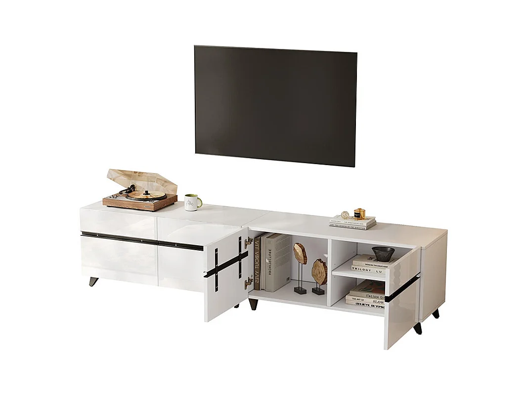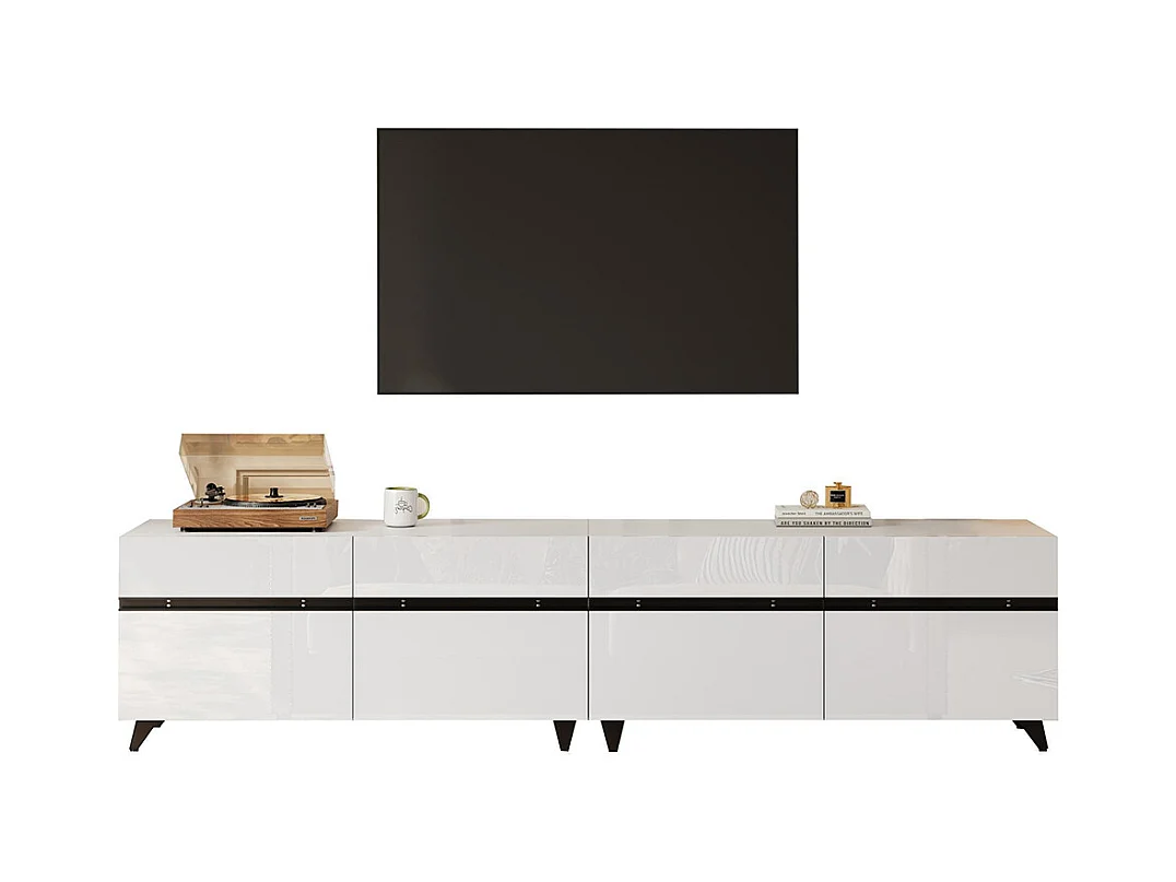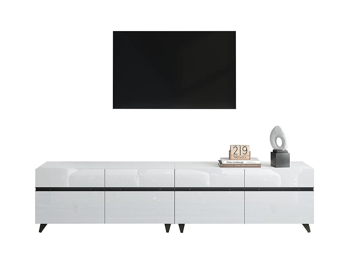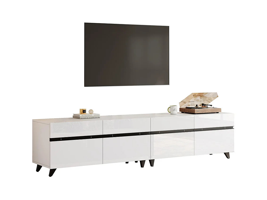 Meuble TV bas armoire blanche brillante pieds noirs portes tiroirs simples
