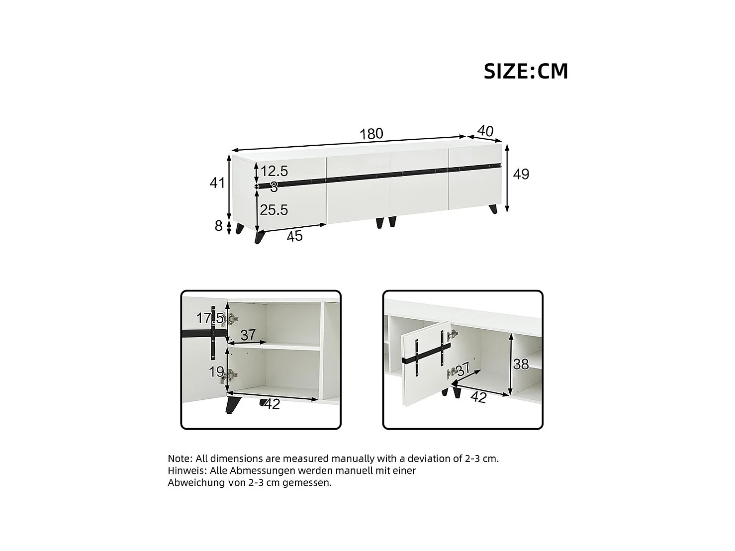 Meuble TV bas moderne - 180 x 40 x 52 cm - avec 4 portes – design minimaliste - MDF - blanc