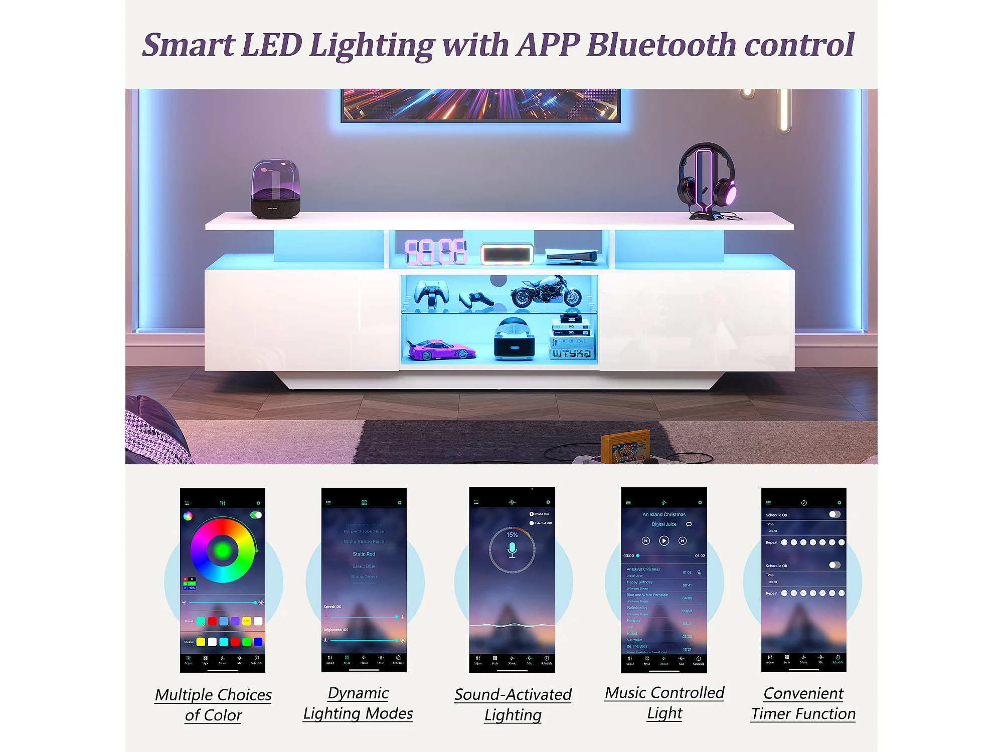 Meuble TV moderne 240x39x35 cm panneau lumineux LED variable - Blanc