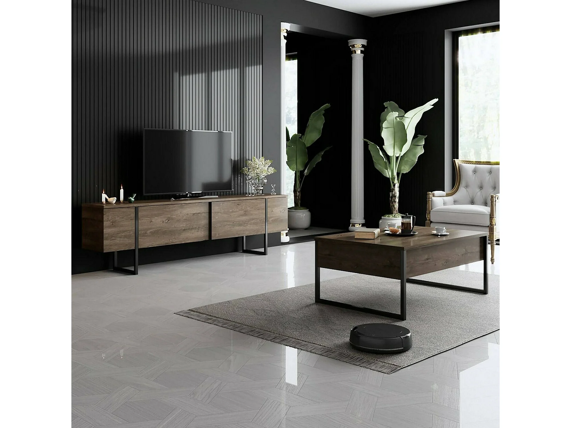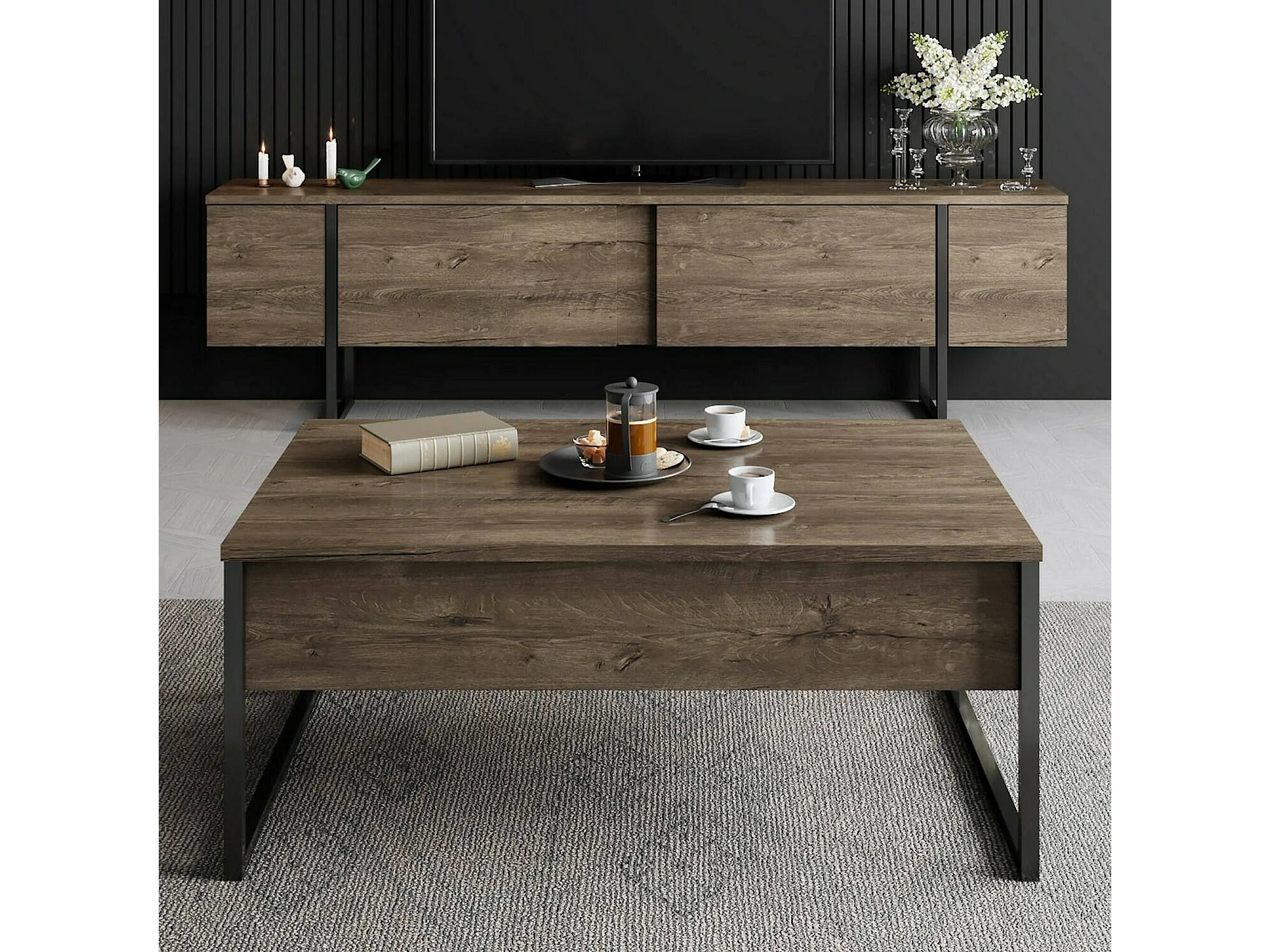 Meuble TV Centaurus, Buffet de salon, Armoire basse pour TV, Base murale de rangement, 180x30h50 cm, Noyer et Noir