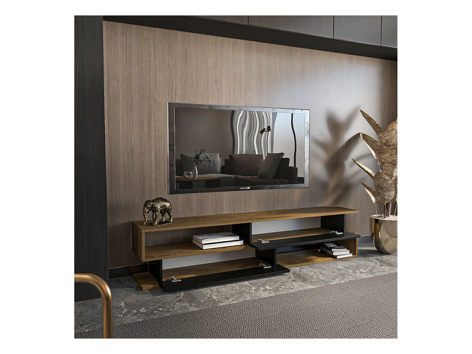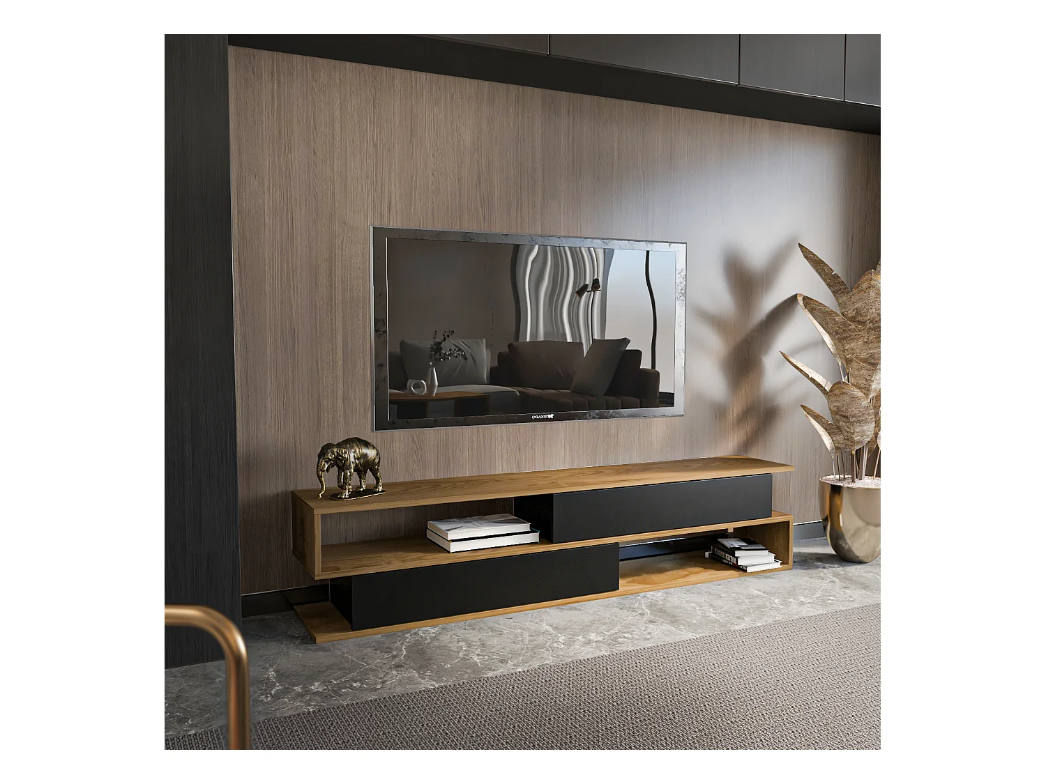 Meuble TV Cortez de 160 cm avec 2 armoires et 2 niches (Oud et Noir)