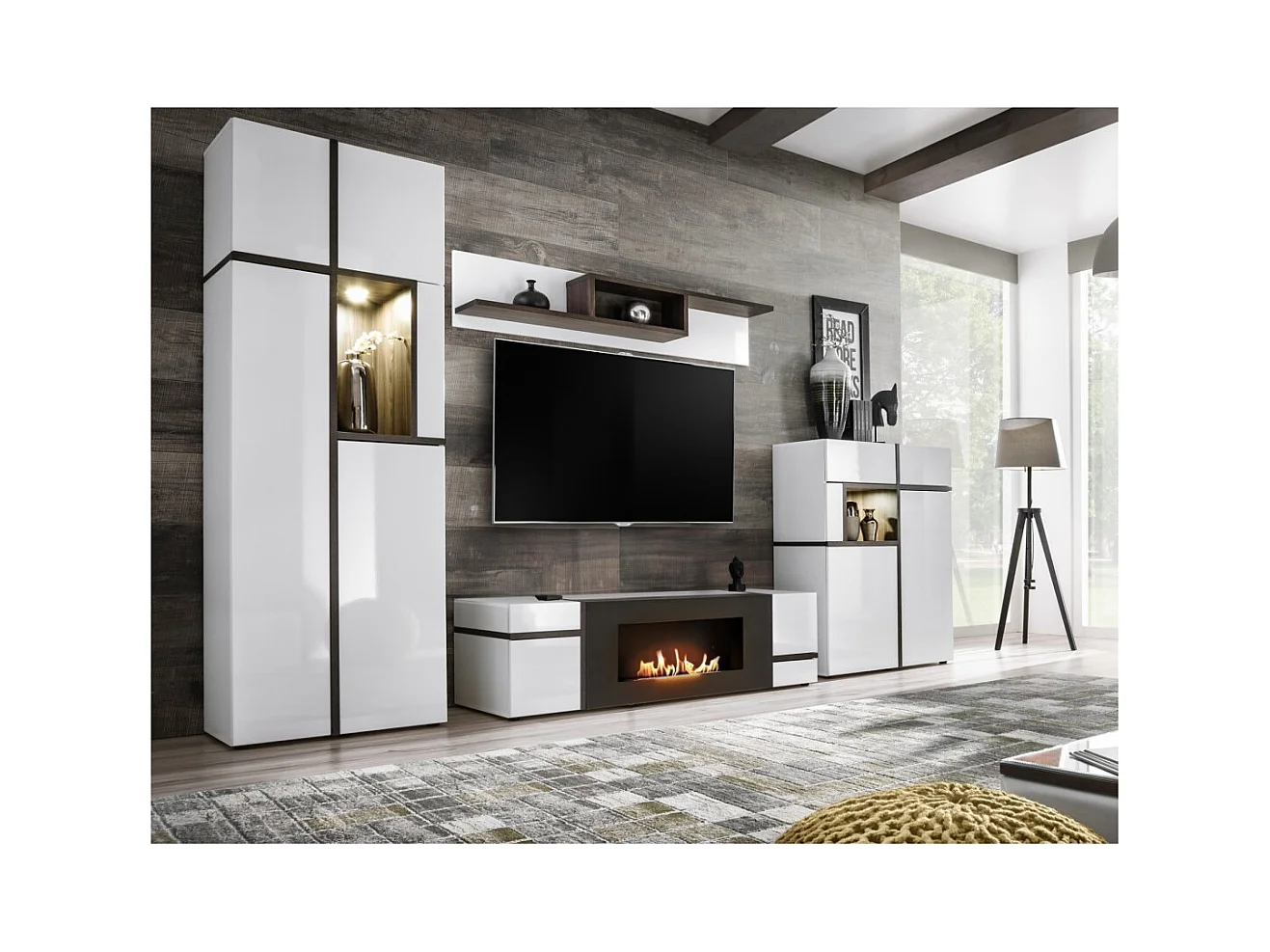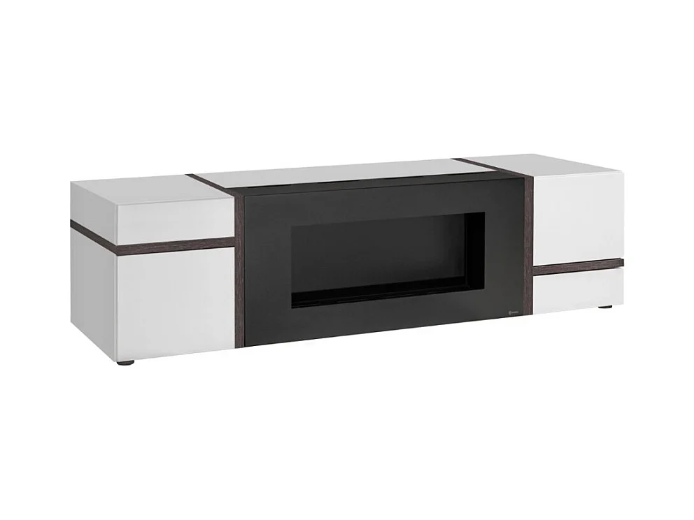 Meuble TV CRISS avec cheminée bio-éthanol – Blanc brillant – L150 cm
