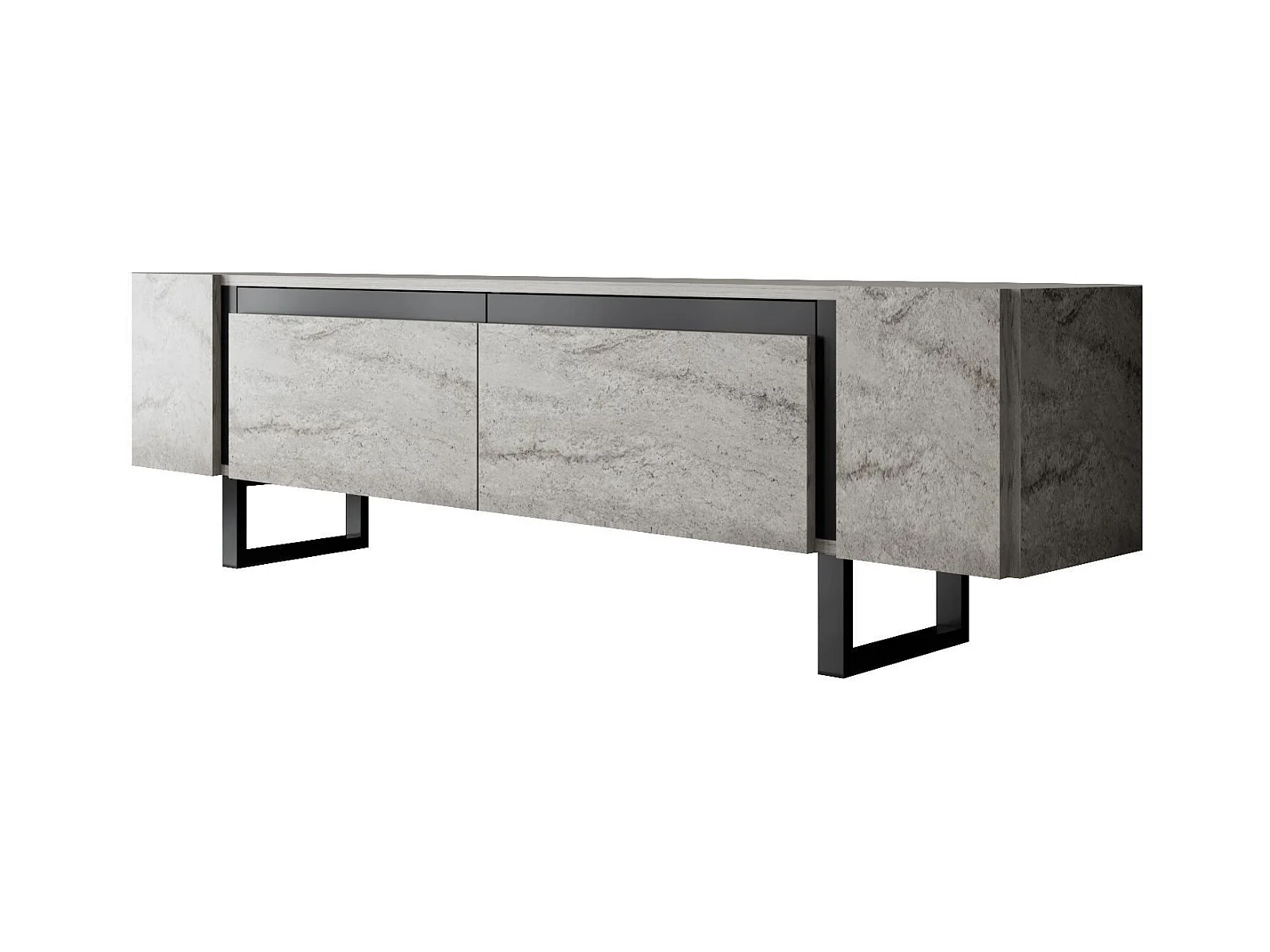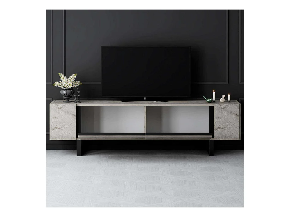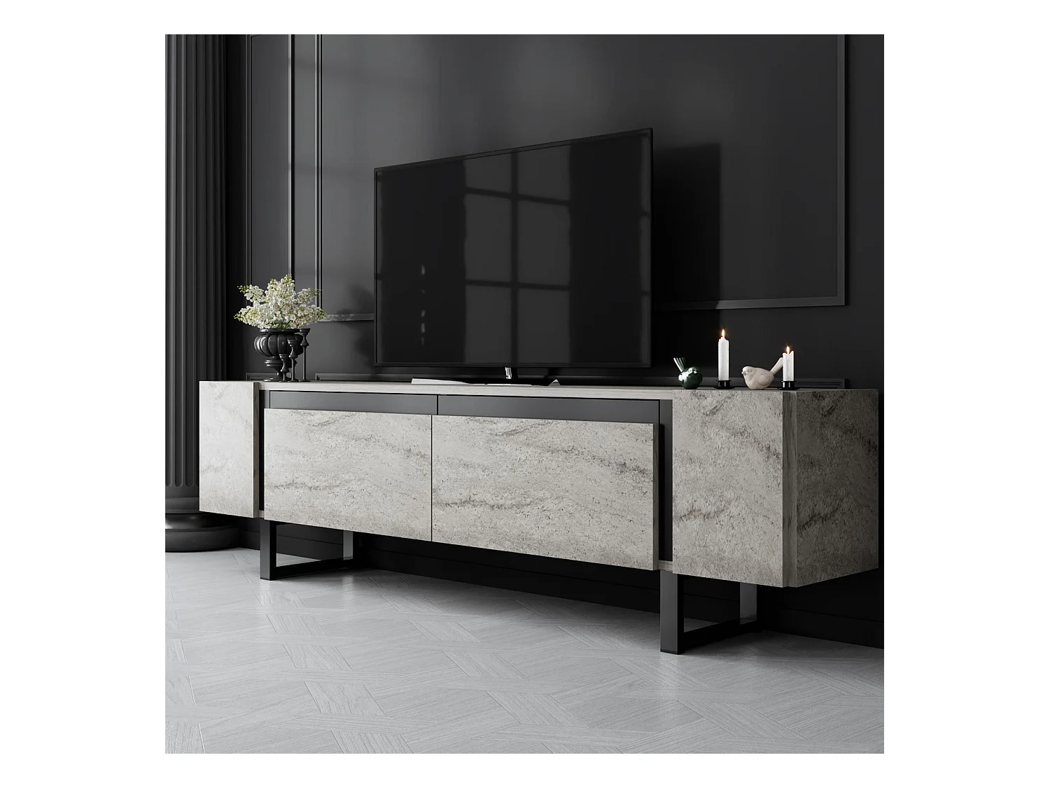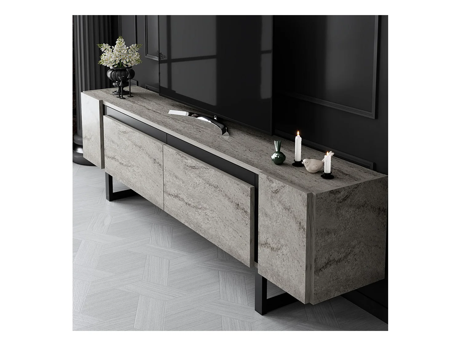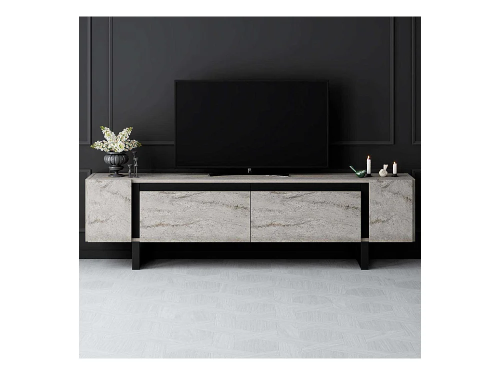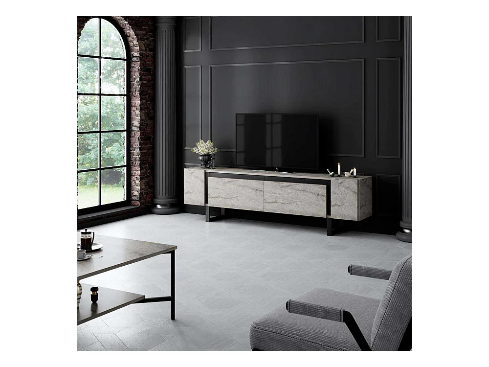 Meuble Tv design 2 portes basculantes Merany L180cm Bois Effet travertin beige et Métal Noir