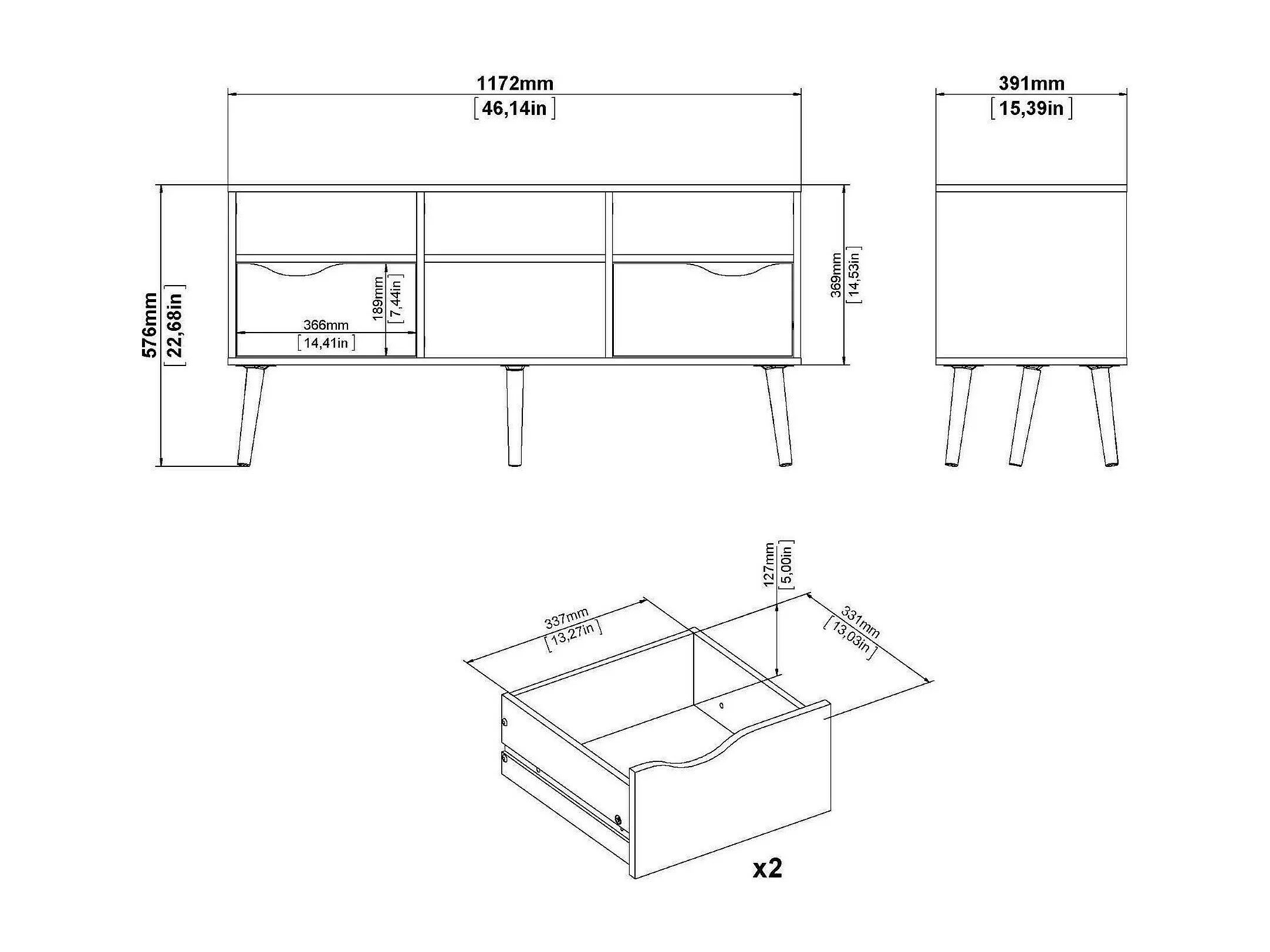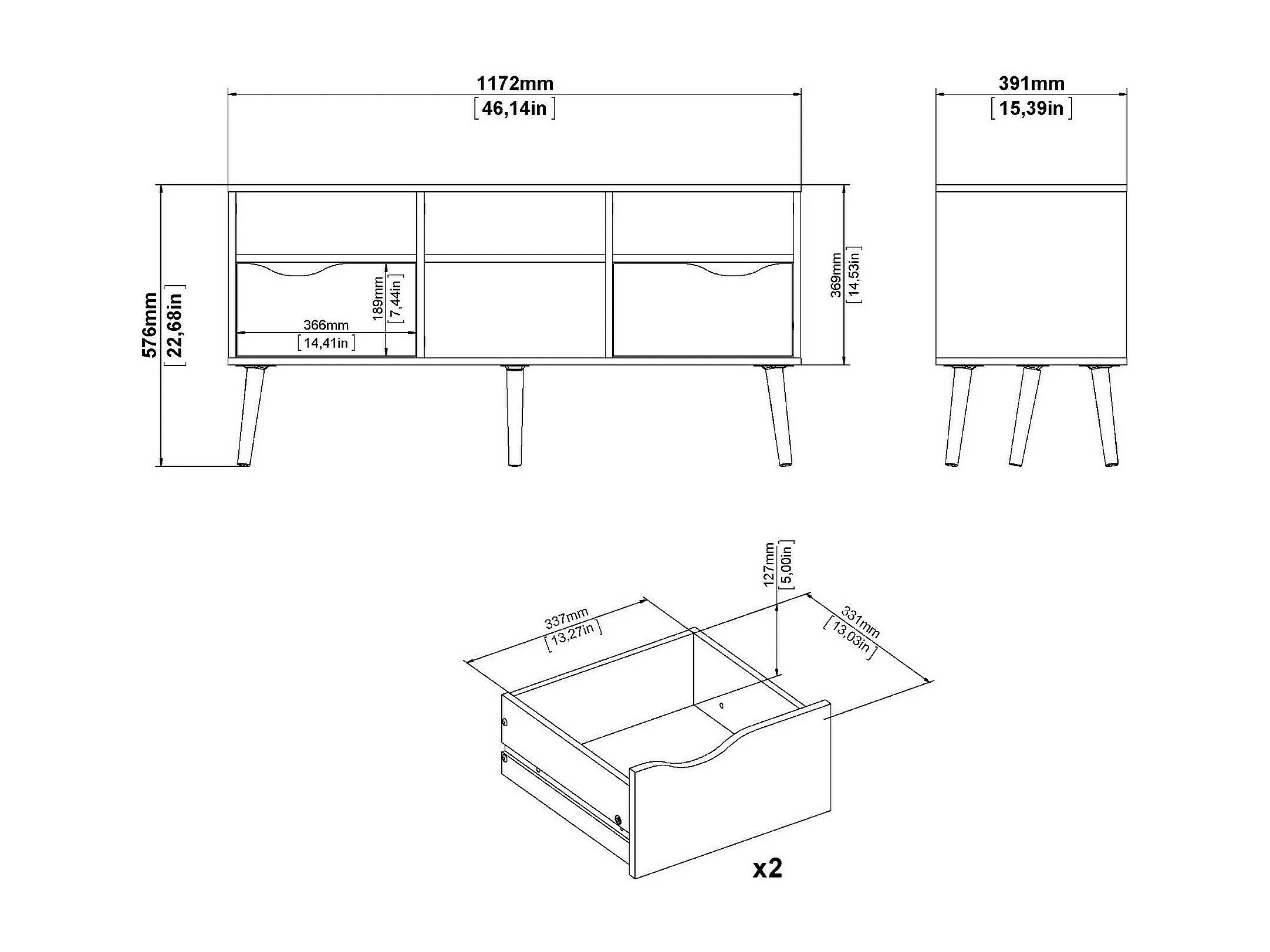 Meuble TV Dtesse, Buffet de salon, Armoire basse pour TV, Base murale de rangement, 117x39 h57 cm, Blanc et Noir