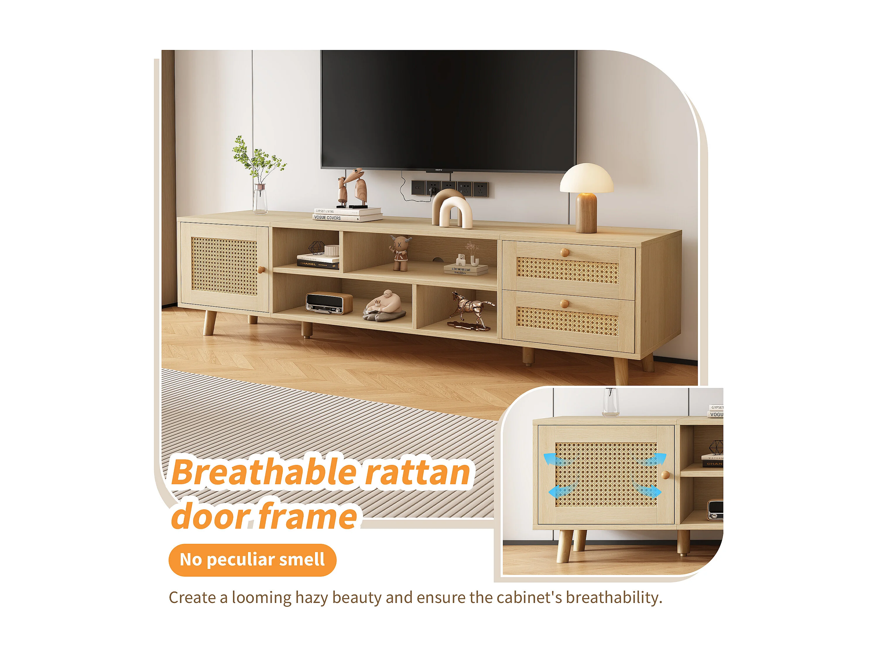 Meuble TV effet bois et rotin avec 2 tiroirs 1 porte et niches de rangement ANIL