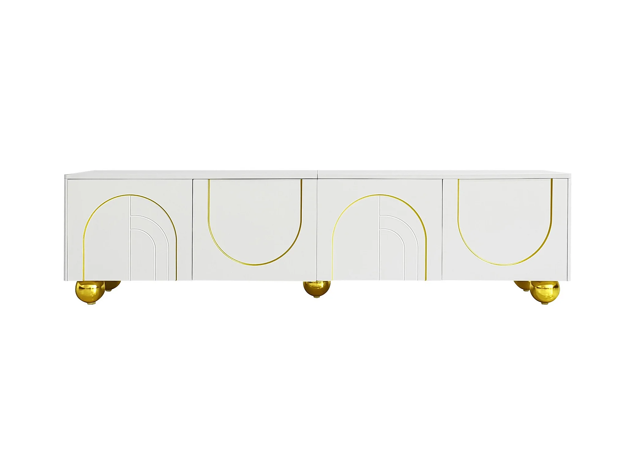 Meuble TV élégant - Meuble TV blanc avec 4 portes texturées - pieds ronds dorés - pour salon et chambre