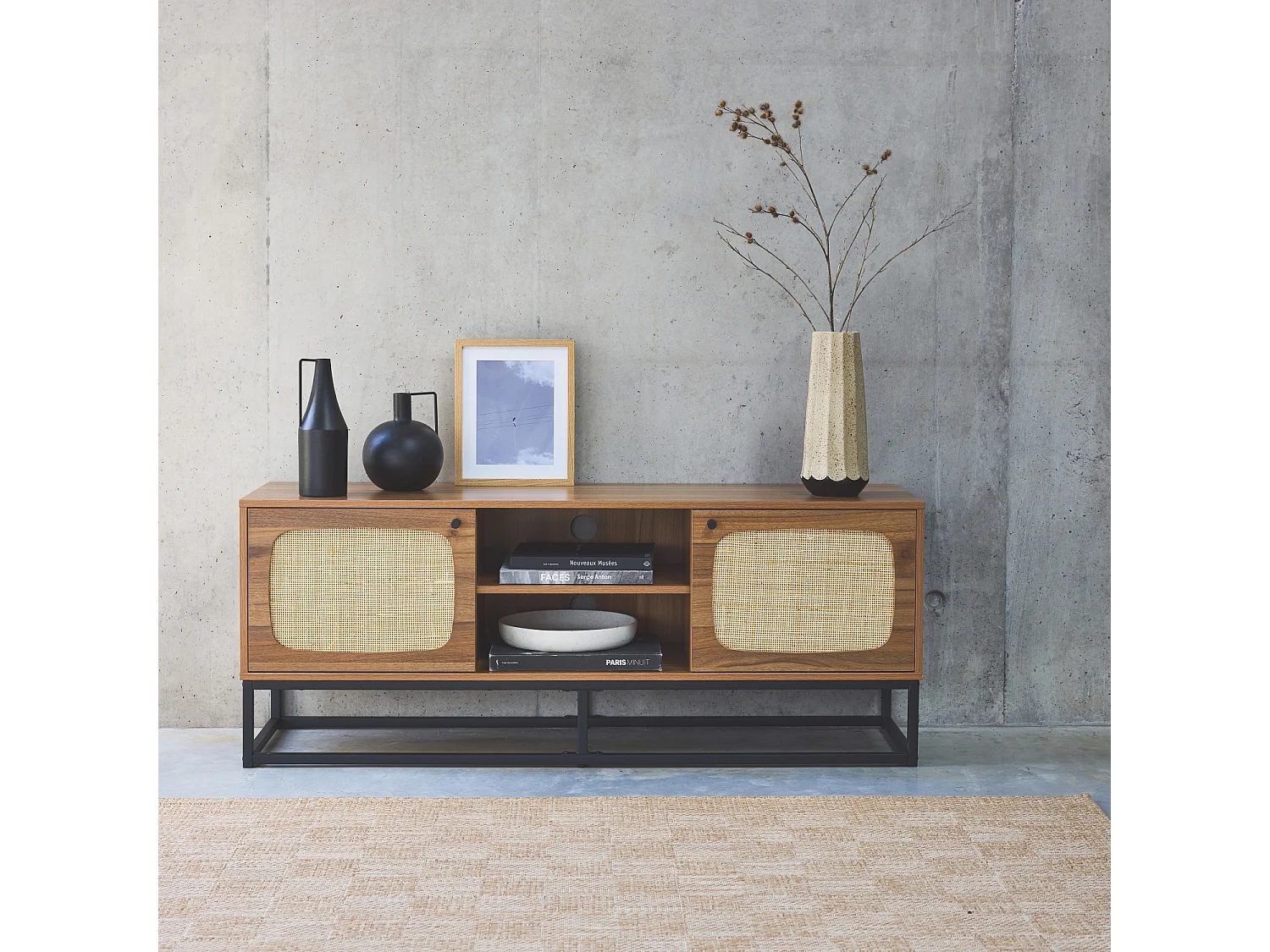 Meuble TV en décor bois et cannage arrondi 140cm. piètement et poignées en métal noir