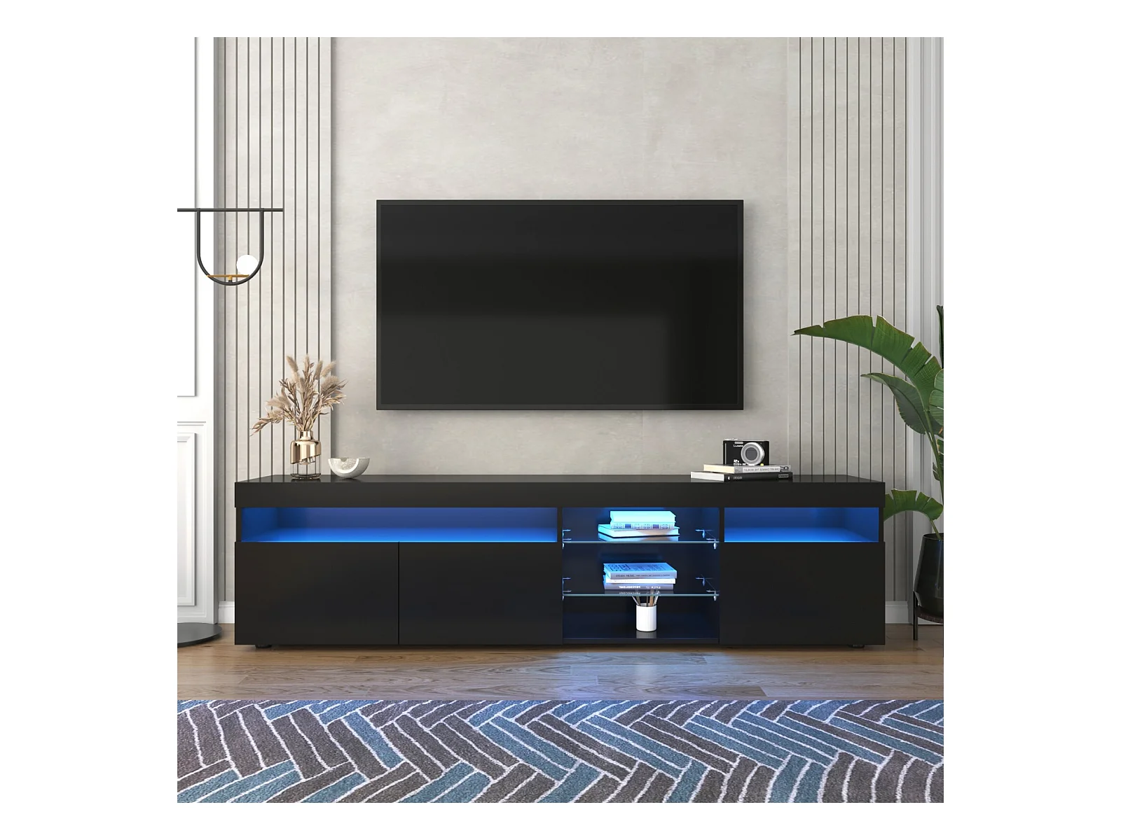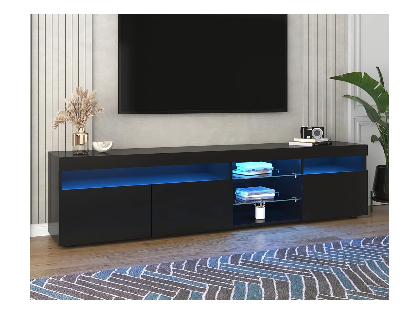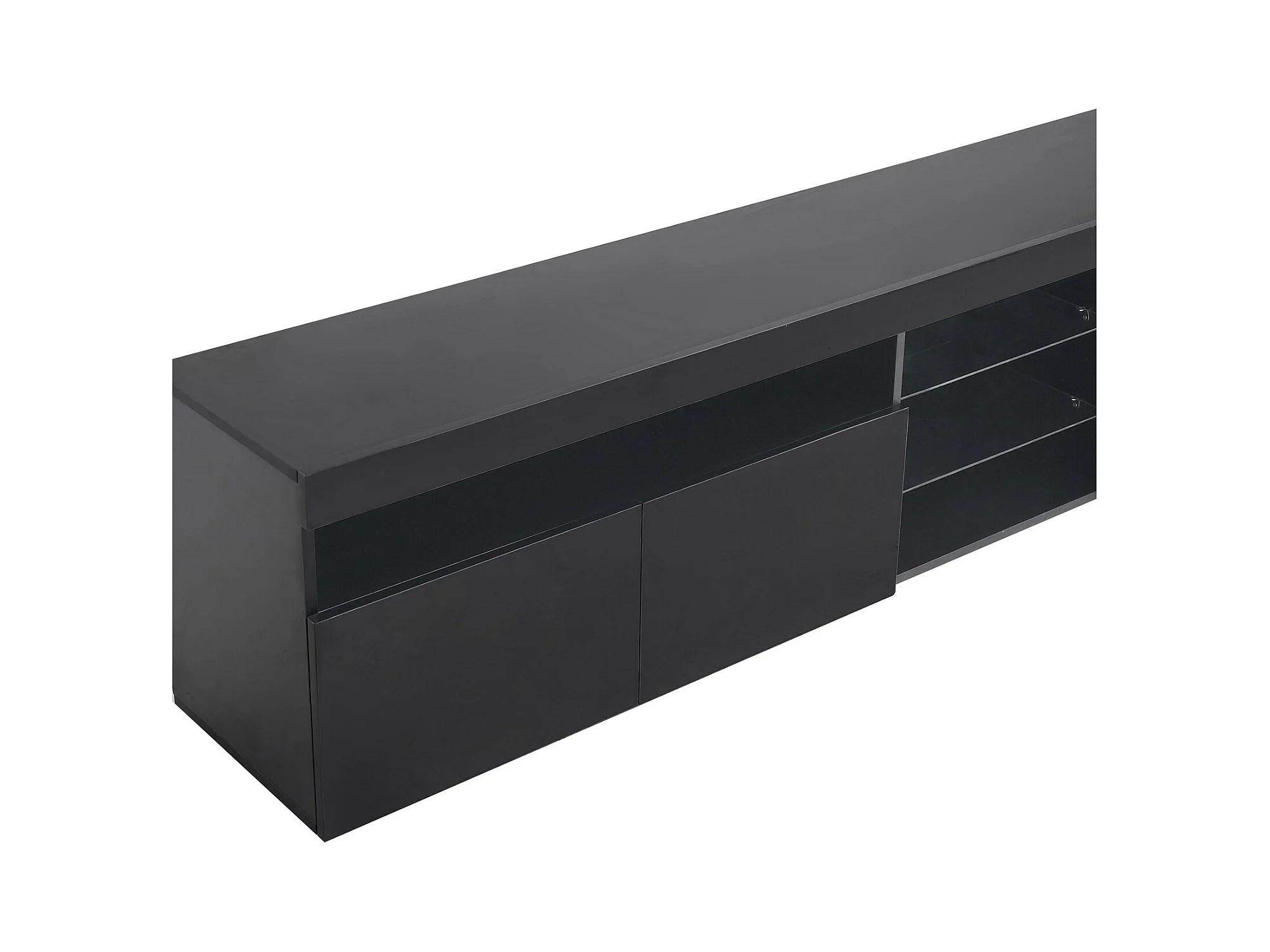 Meuble TV en MDF, avec LED 4 Modes 16 couleurs, 3 portes et 5 niche, Noir, 180x35x45cm