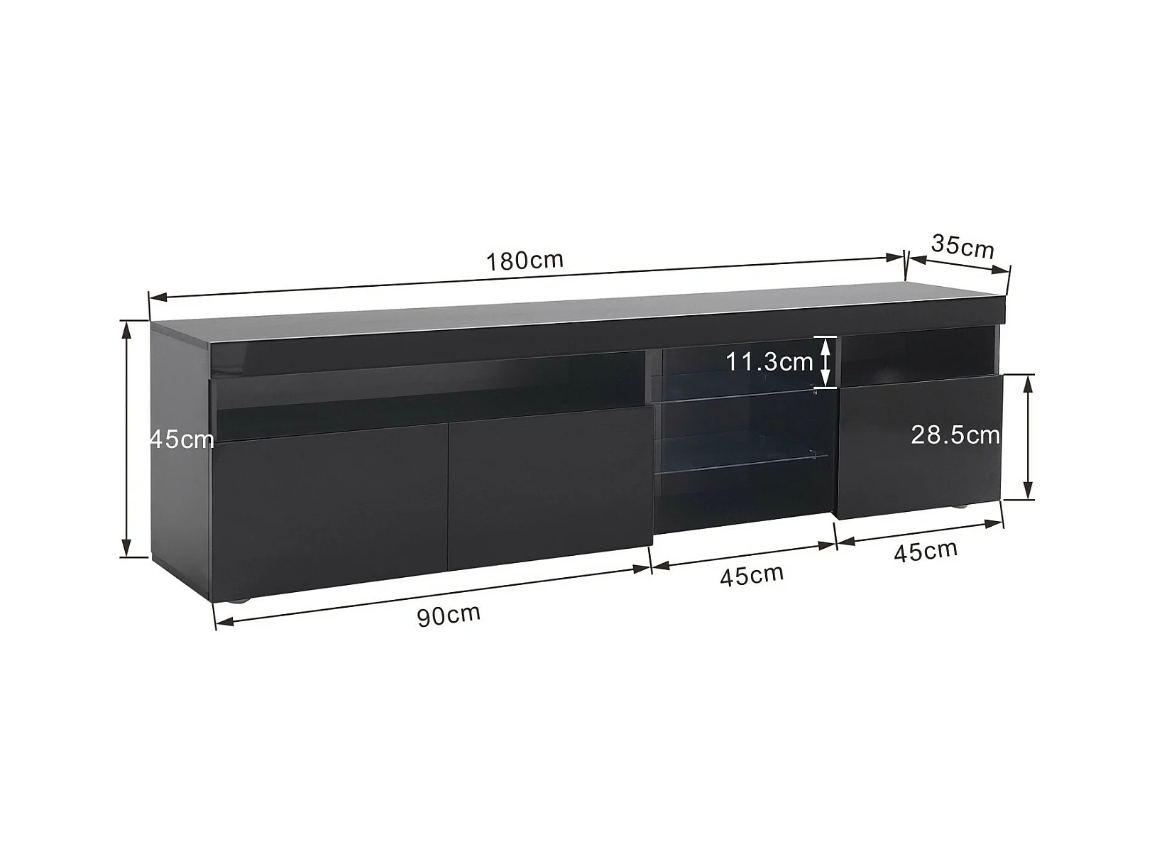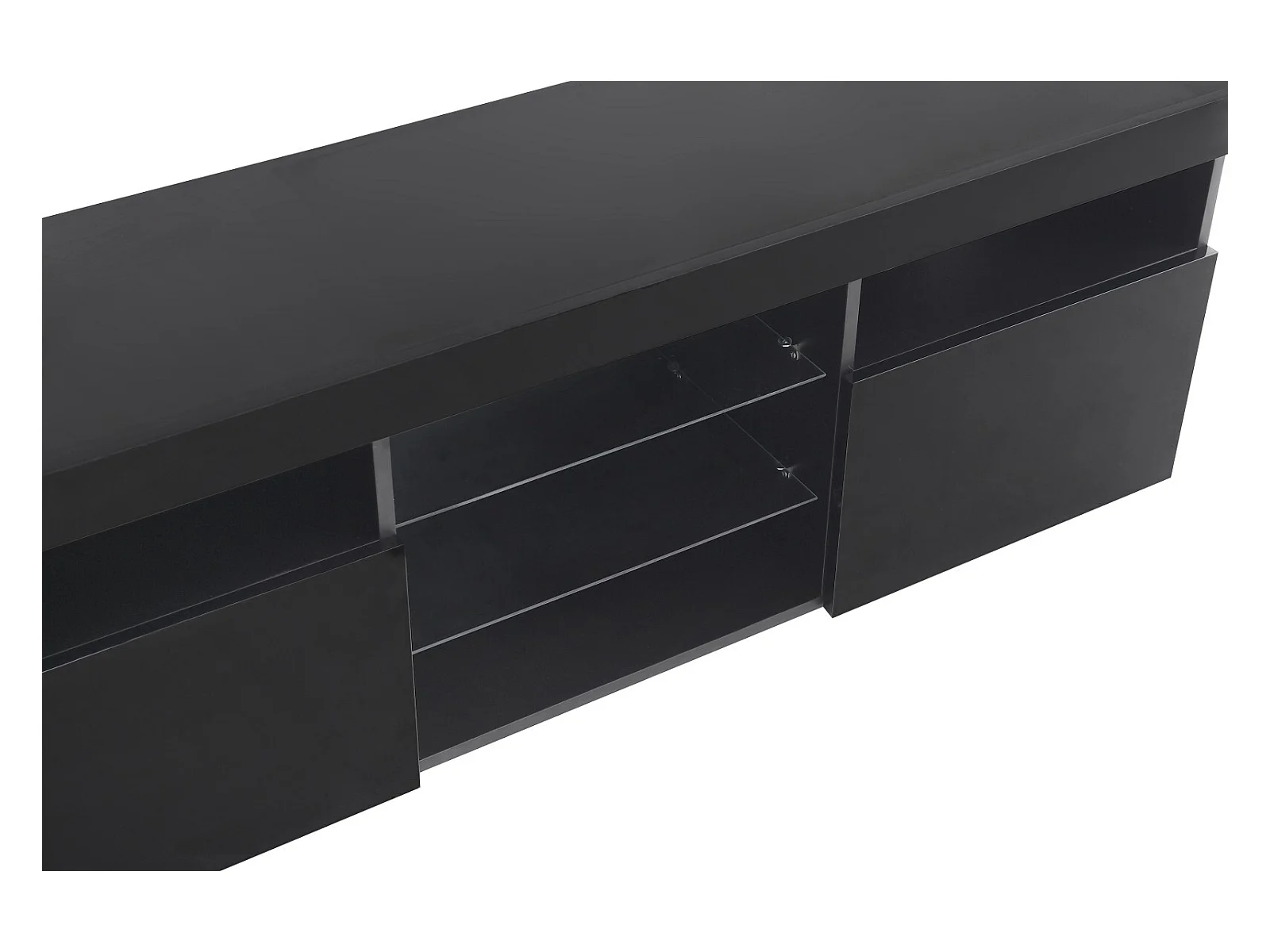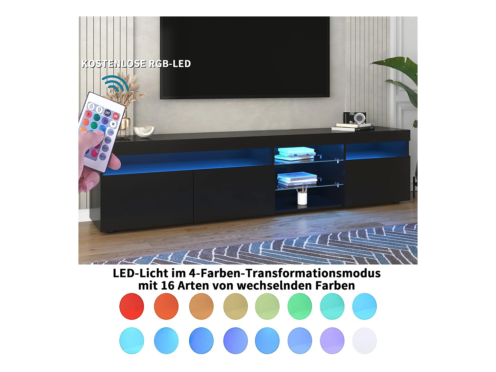 Meuble TV en MDF, avec LED 4 Modes 16 couleurs, 3 portes et 5 niche, Noir, 180x35x45cm
