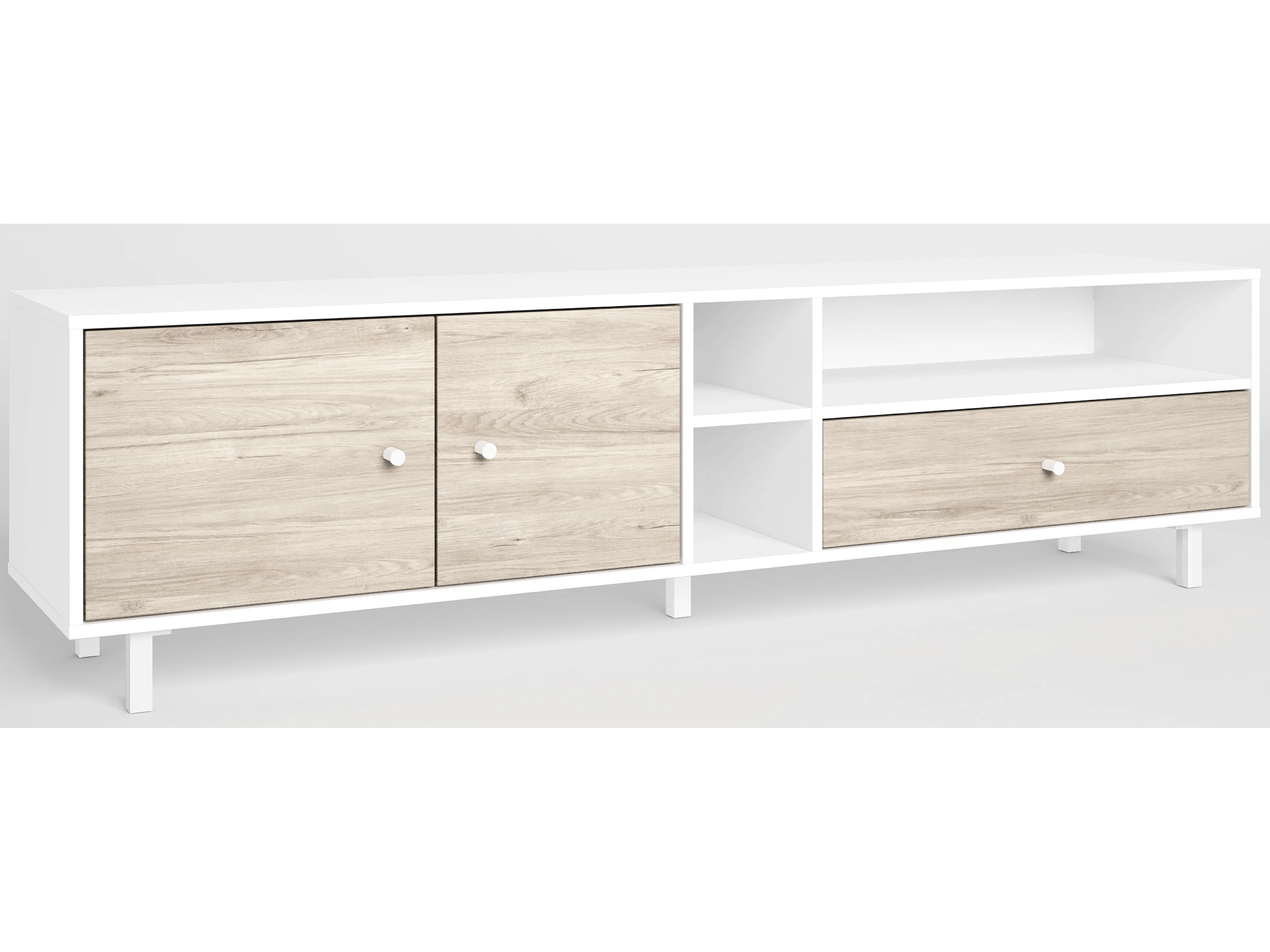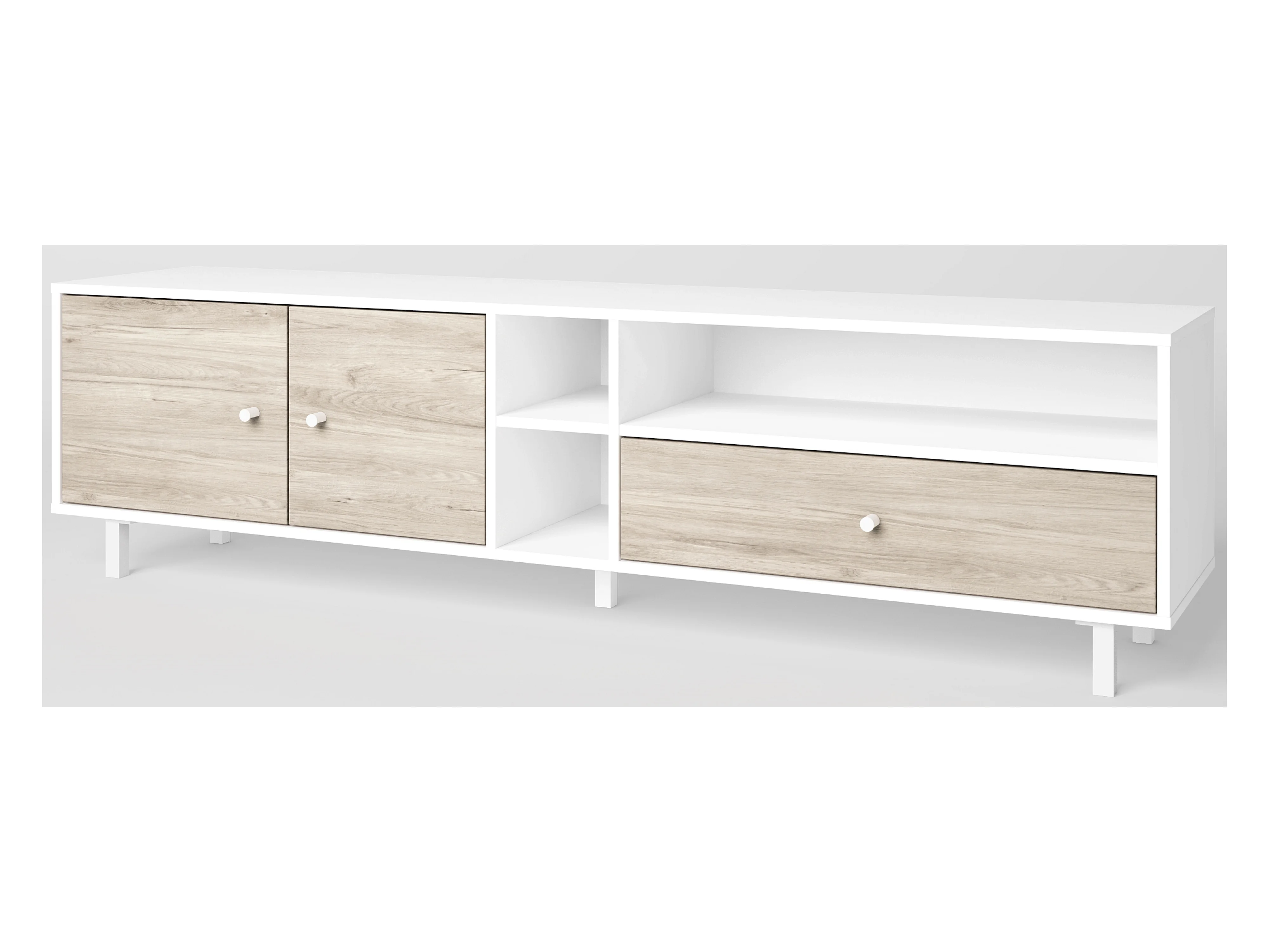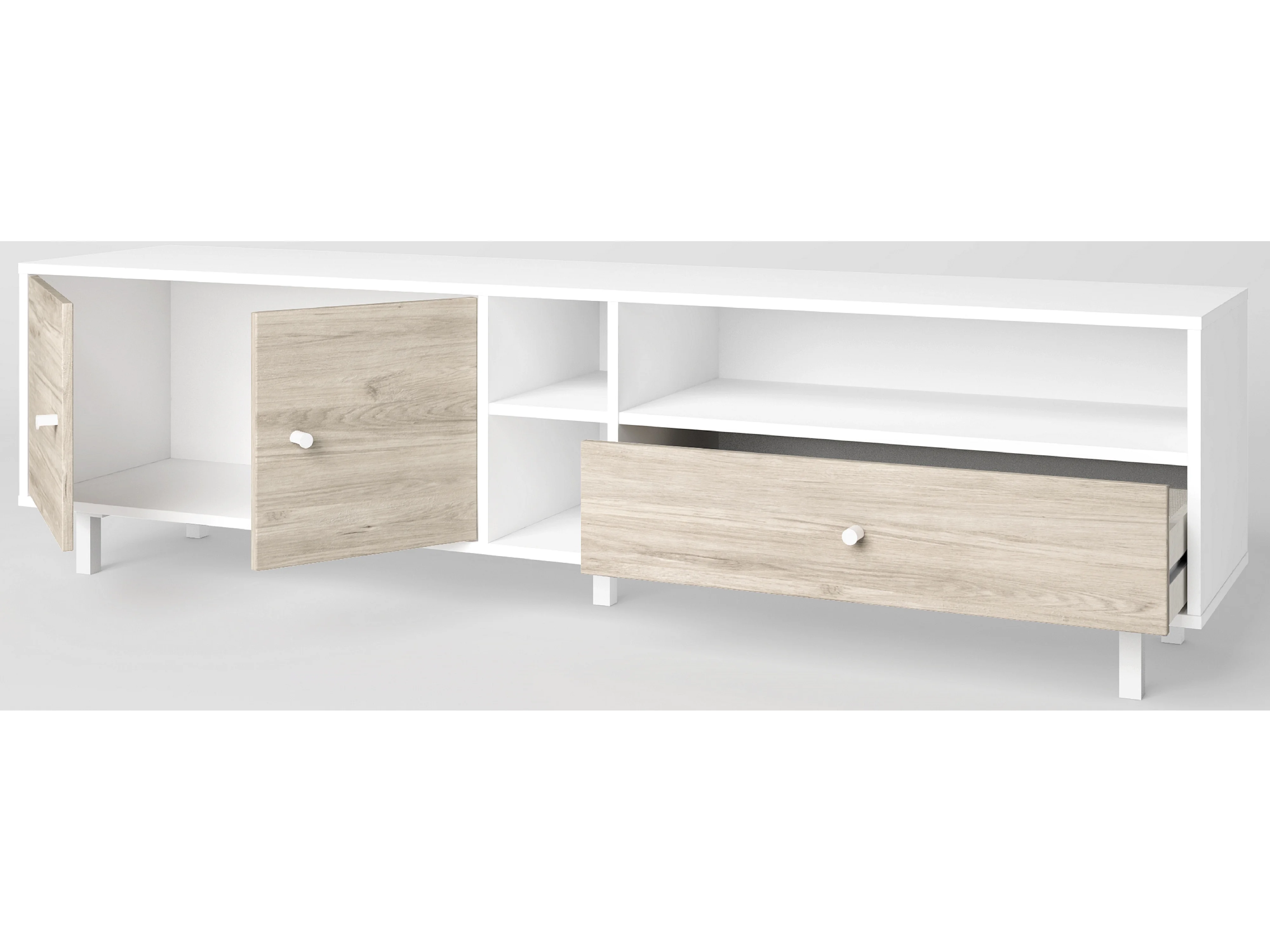 Meuble TV en mélamine blanc / chêne avec pieds en métal, meuble de rangement - Longueur 180 x Profondeur 40 x Hauteur 46.7 cm