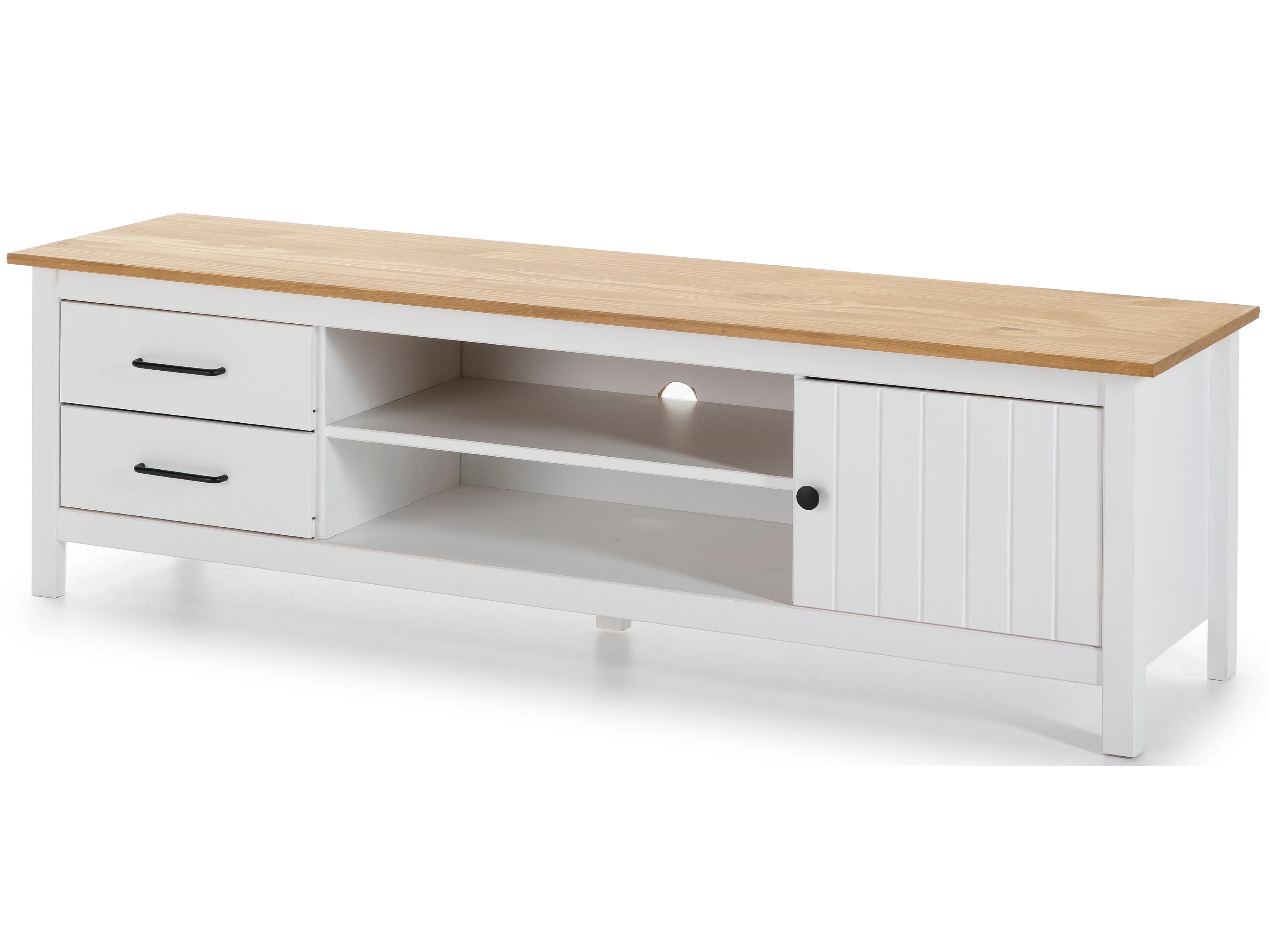 Meuble TV en pin massif décor ciré chêne et blanc, meuble de rangement - Longueur 158 x Profondeur 40 x Hauteur 47 cm
