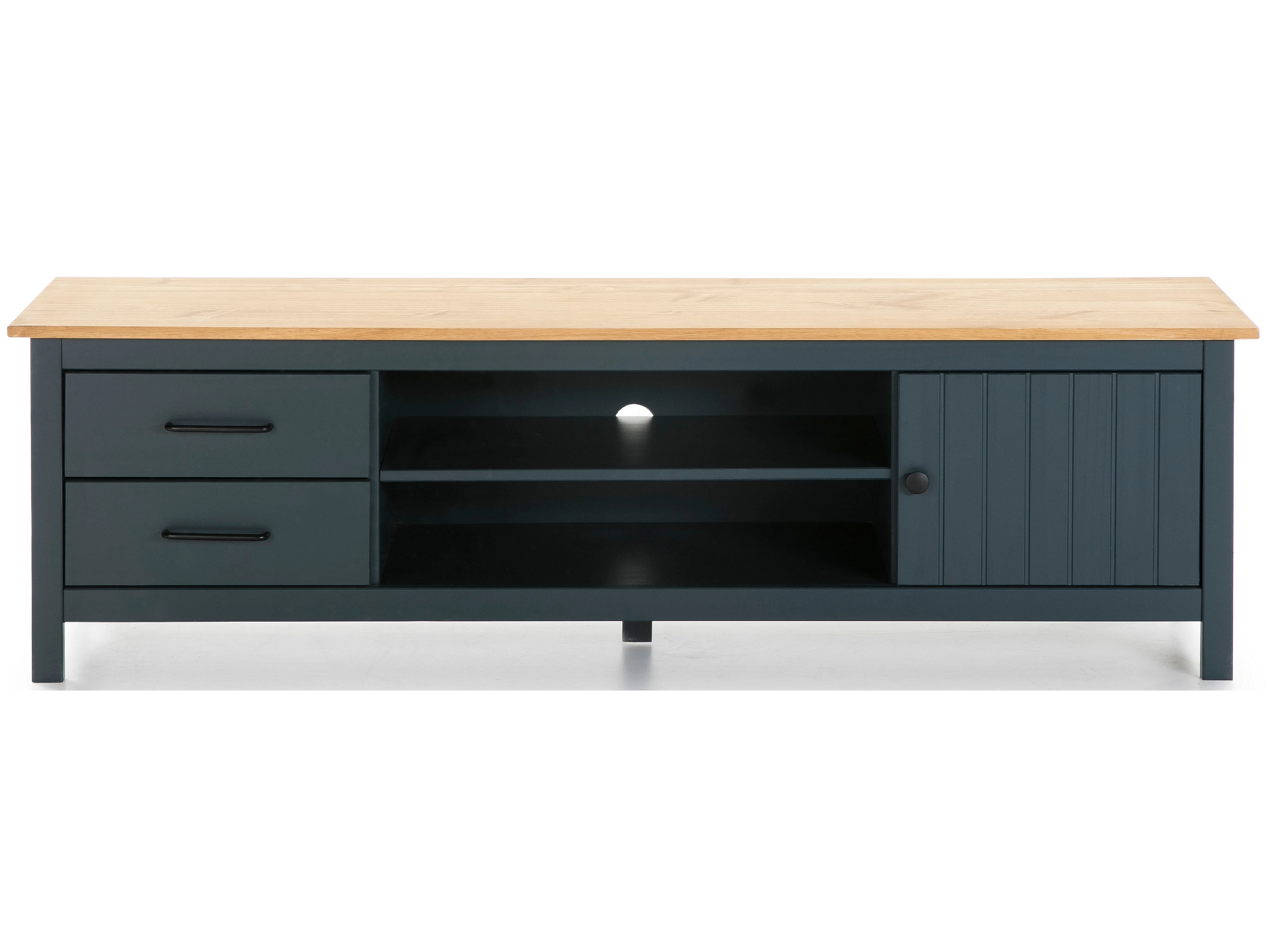 Meuble TV en pin massif décor ciré chêne et bleu, meuble de rangement - Longueur 158 x Profondeur 40 x Hauteur 47 cm