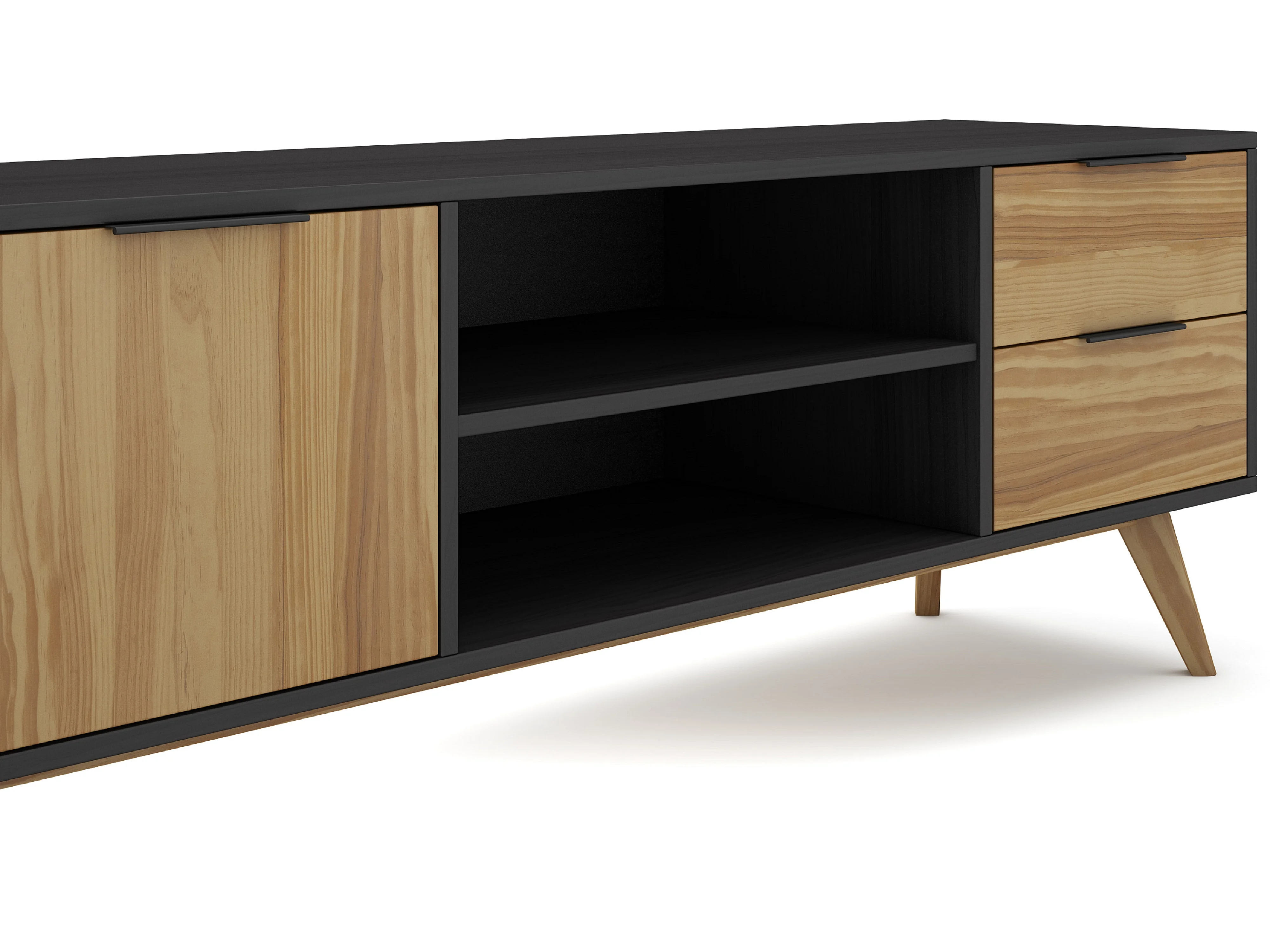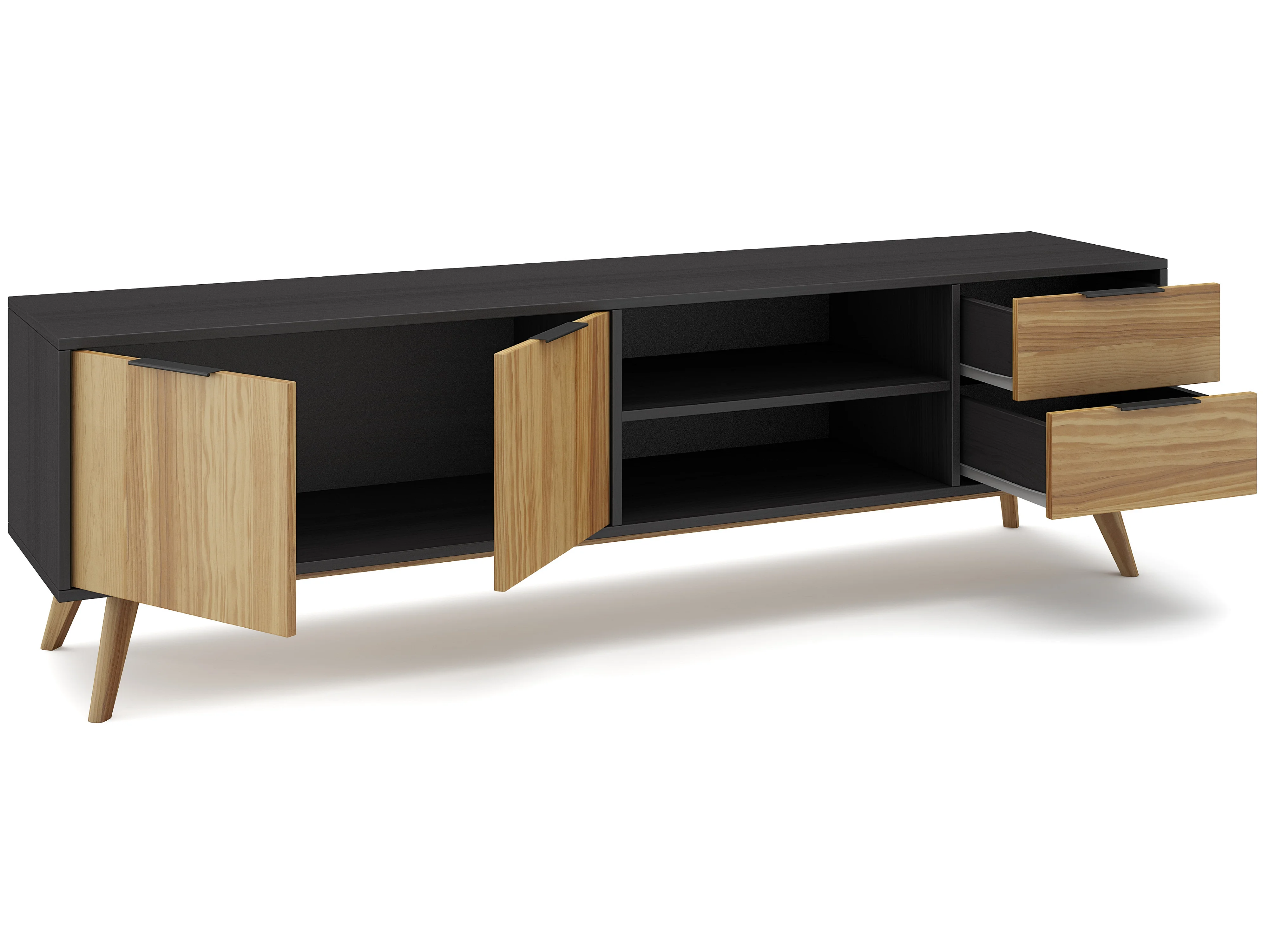 Meuble TV en pin massif décor ciré naturel et noir, meuble de rangement - Longueur 180 x Profondeur 40 x Hauteur 52 cm