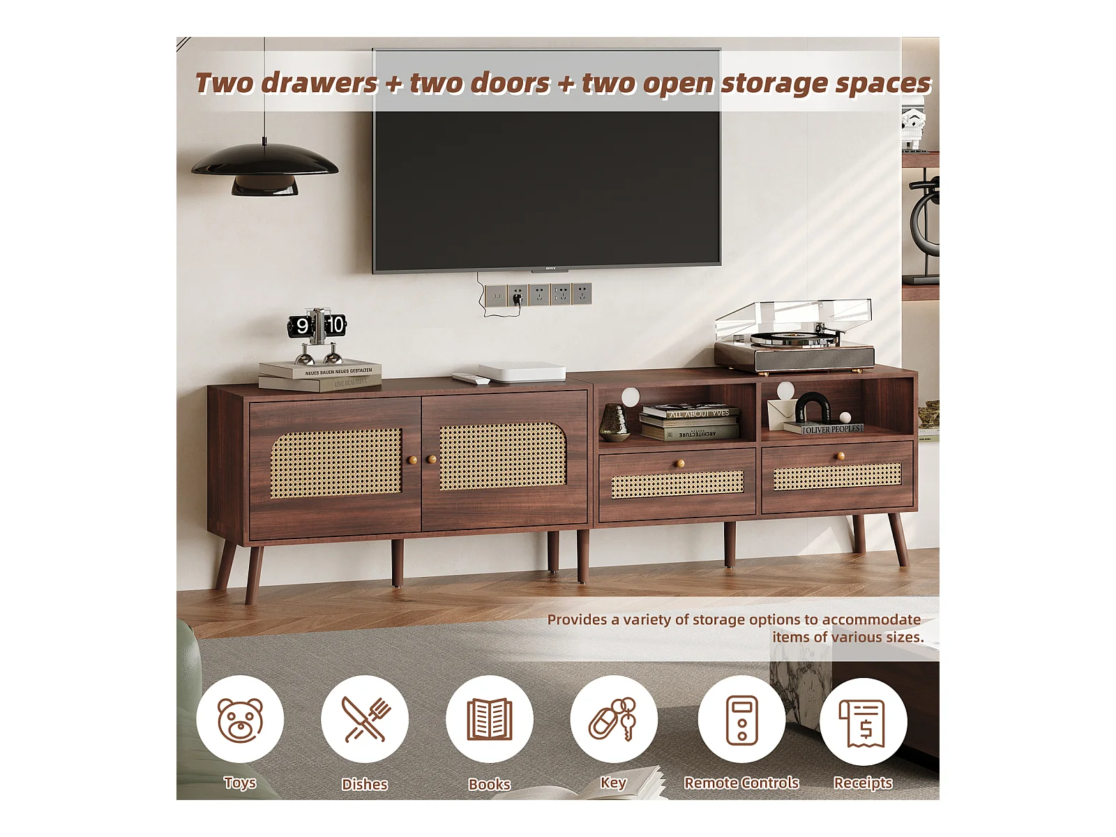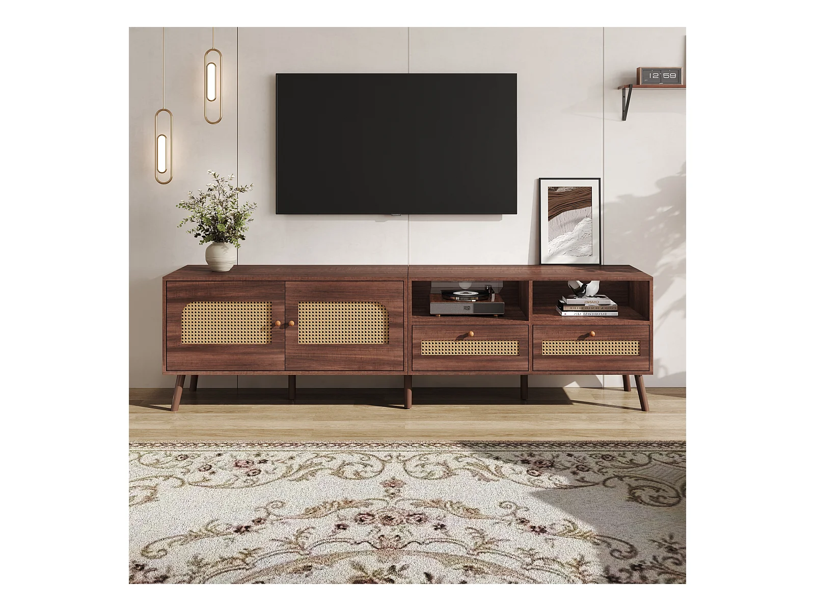 Meuble TV en rotin avec 2 tiroirs, 2 Portes, Meuble TV en Bois, pour TV 80 Pouces, 200 x 37 x 49 cm