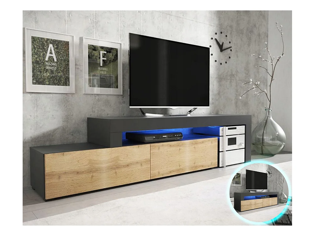 Meuble TV Flex Noir et Bois - LED Inclus - EXTENSIBLE - ANGLE - Industriel