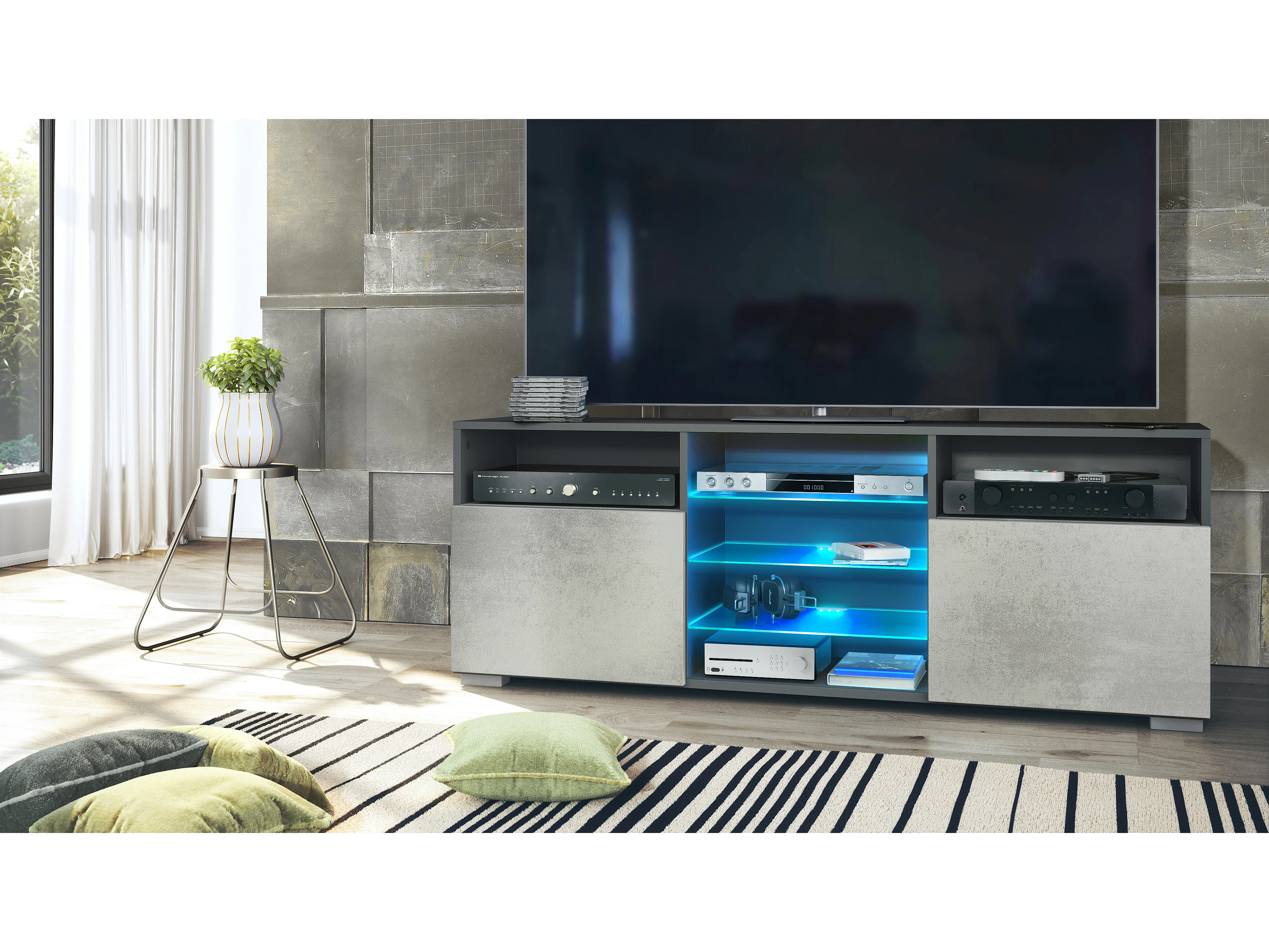 Meuble TV Granada, Lowboard avec 2 portes et 6 compartiments ouverts, corps anthracite mat, façades en aspect béton oxyde avec éclairage LED RVB (146 x 54 x 35 cm)