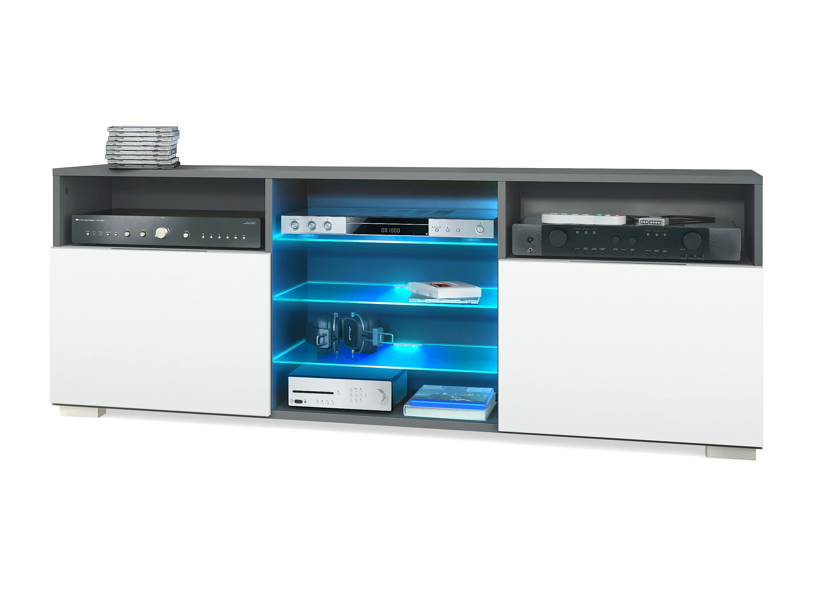 Meuble TV Granada, Lowboard avec 2 portes et 6 compartiments ouverts, corps anthracite mat, façades en blanc mat avec éclairage LED RVB (146 x 54 x 35 cm)