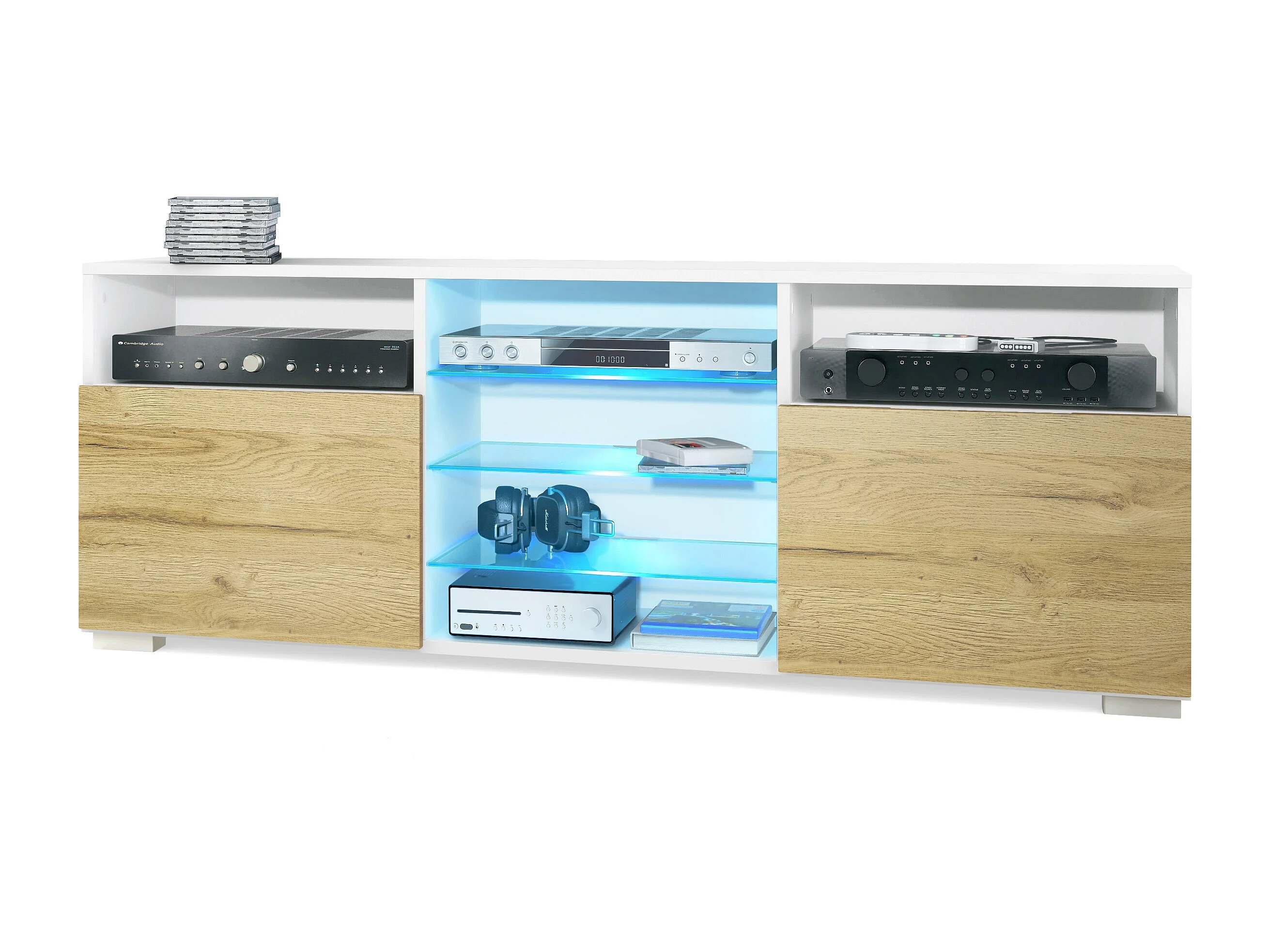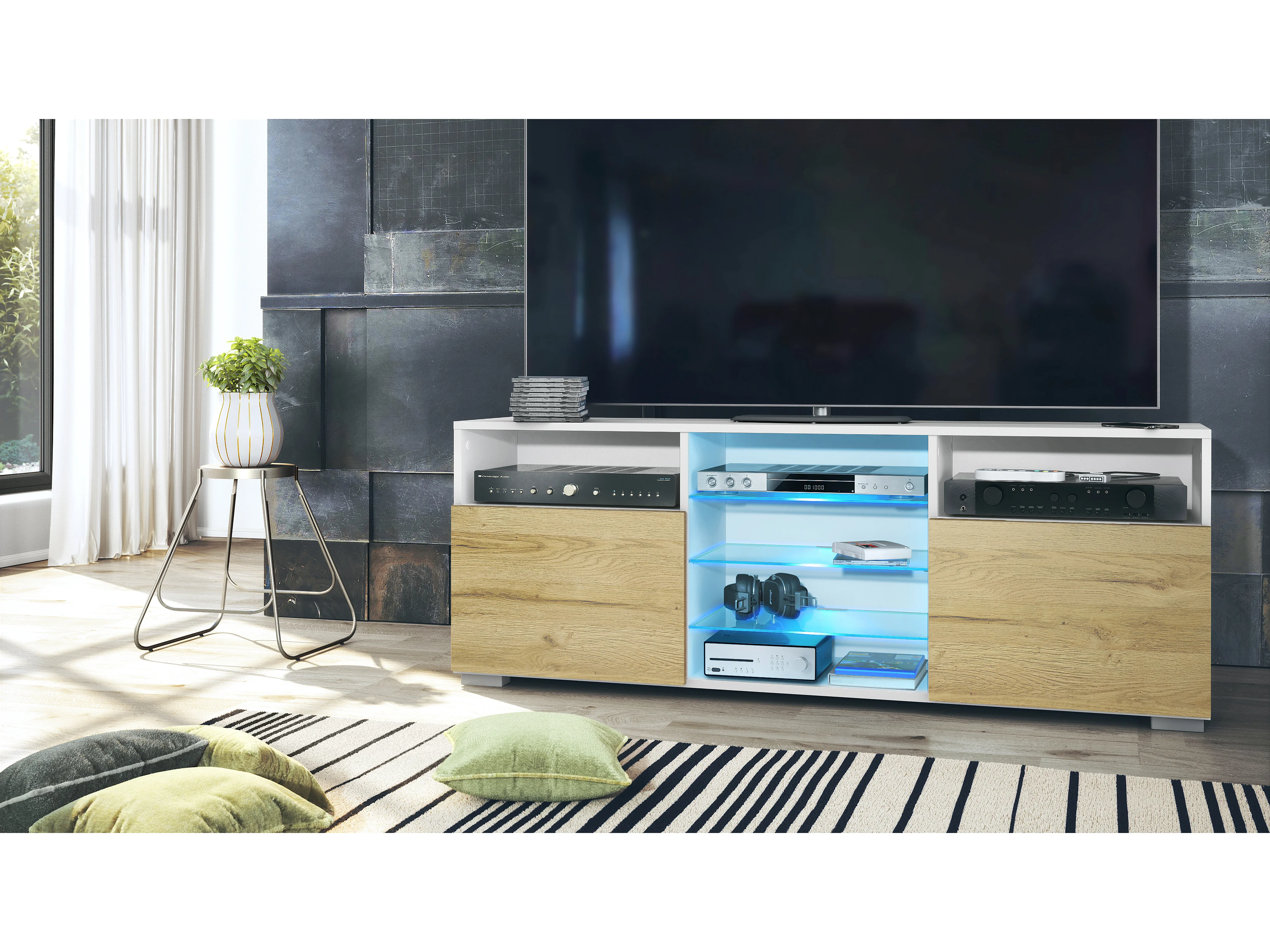 Meuble TV Granada, Lowboard avec 2 portes et 6 compartiments ouverts, corps blanc mat, façades en chêne nature avec éclairage LED RVB (146 x 54 x 35 cm)
