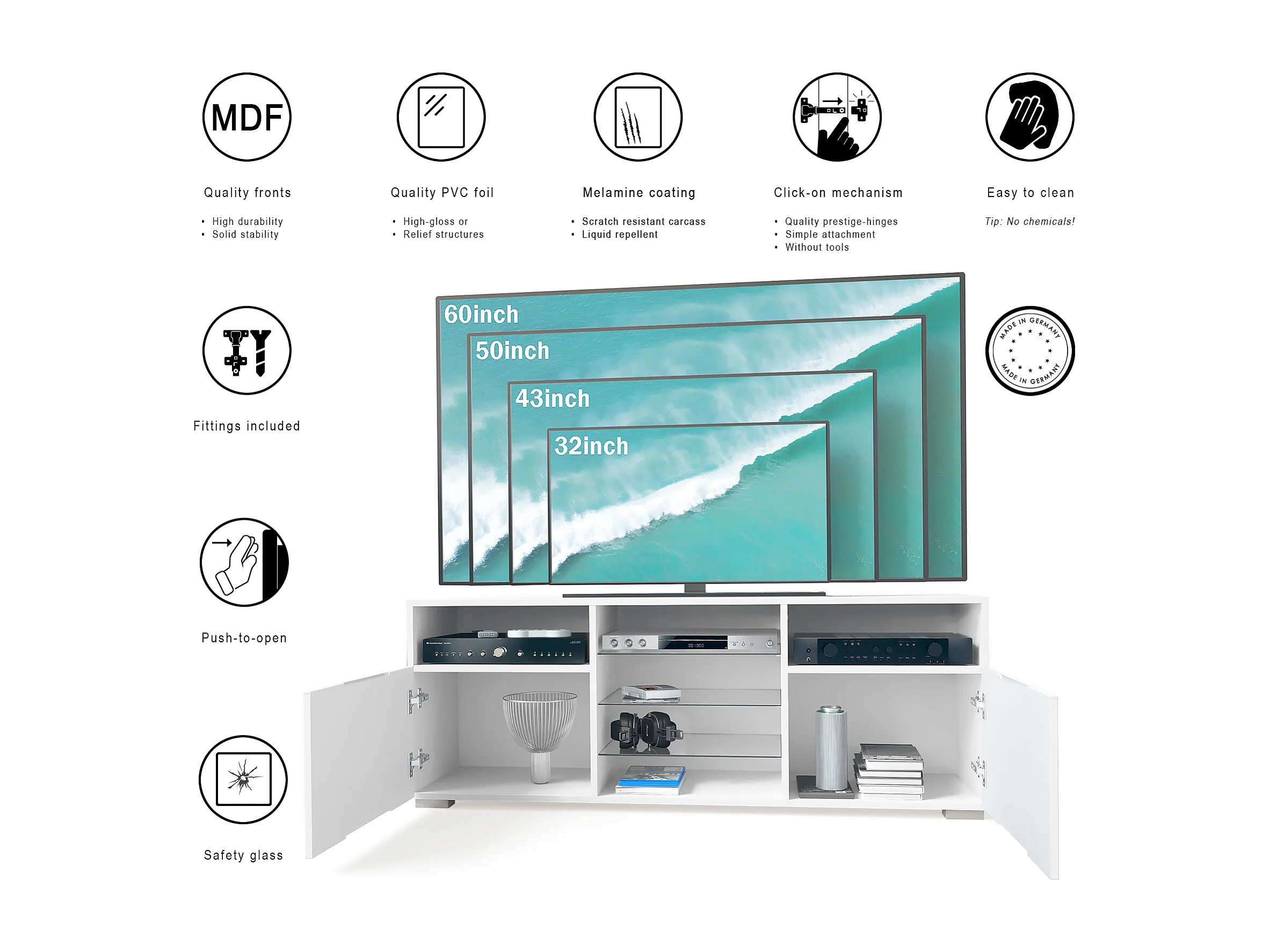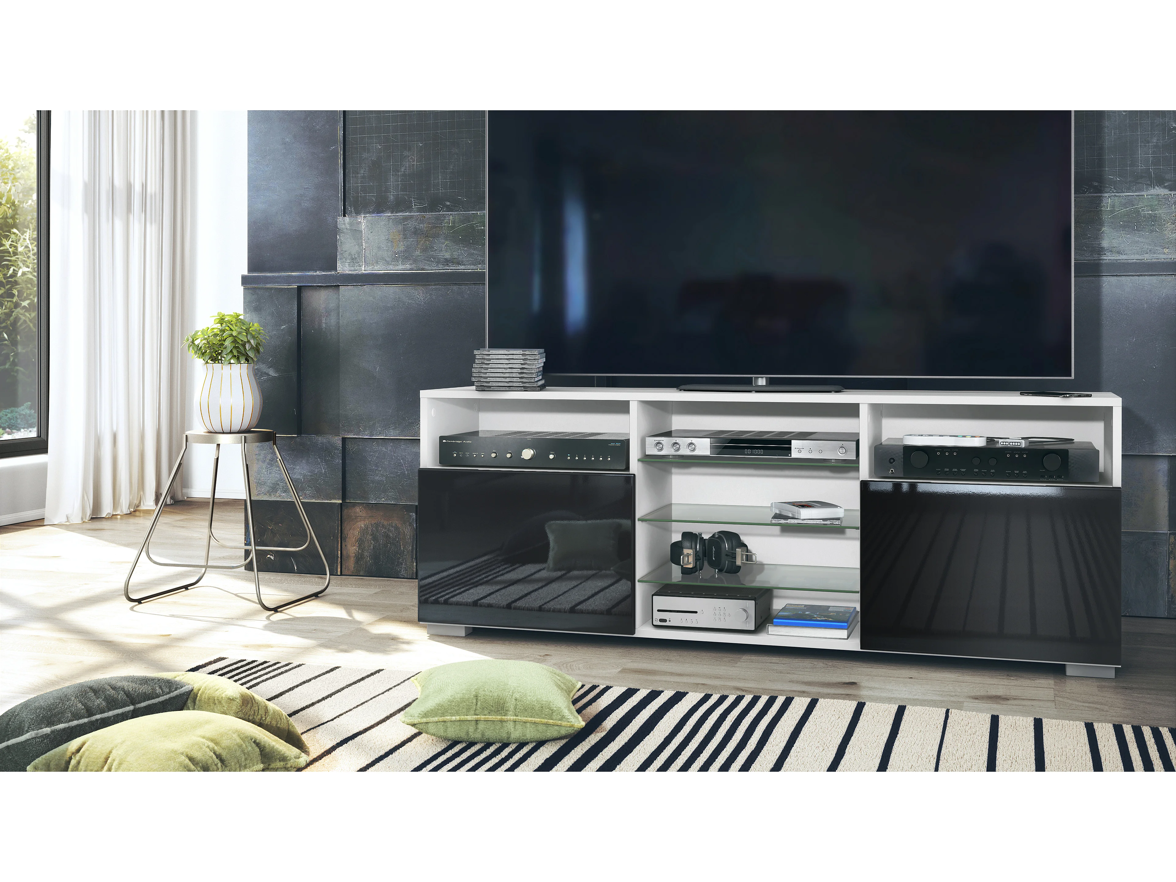 Meuble TV Granada, Lowboard avec 2 portes et 6 compartiments ouverts, corps blanc mat, façades en noir haute brillance (146 x 54 x 35 cm)