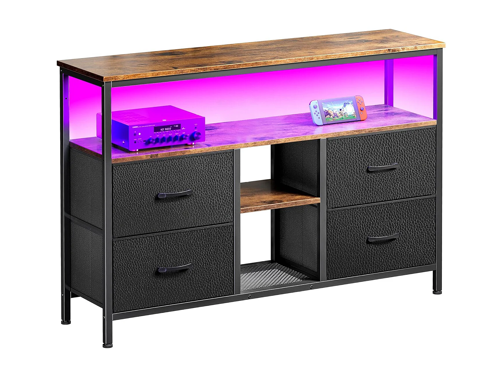 Meuble TV LED 108x30x78cm - 4 tiroirs, 2 compartiments et étagère - tissu cuir et métal noir - Noir