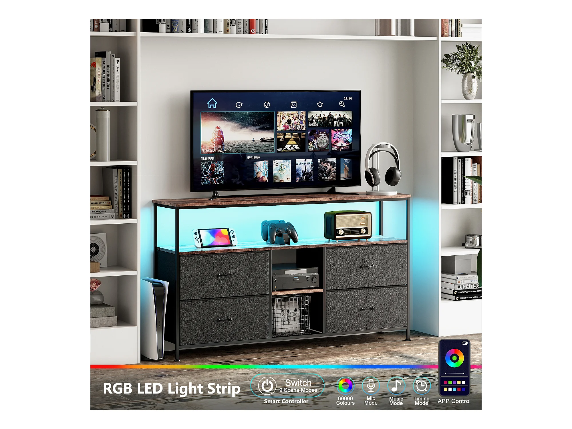 Meuble TV LED avec 4 Tiroirs, Petit Meuble Tele avec Rangement, Banc TV, Support Télé, Commode en Tissu pour Le Salon Chambre à Coucher Entrée Rustique, Noir