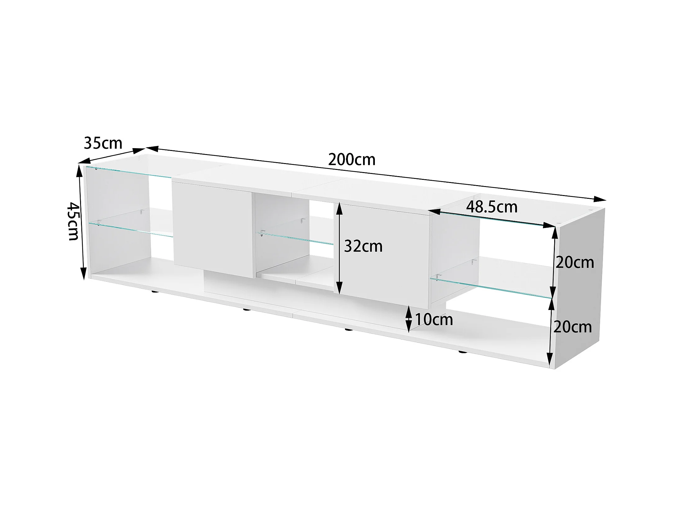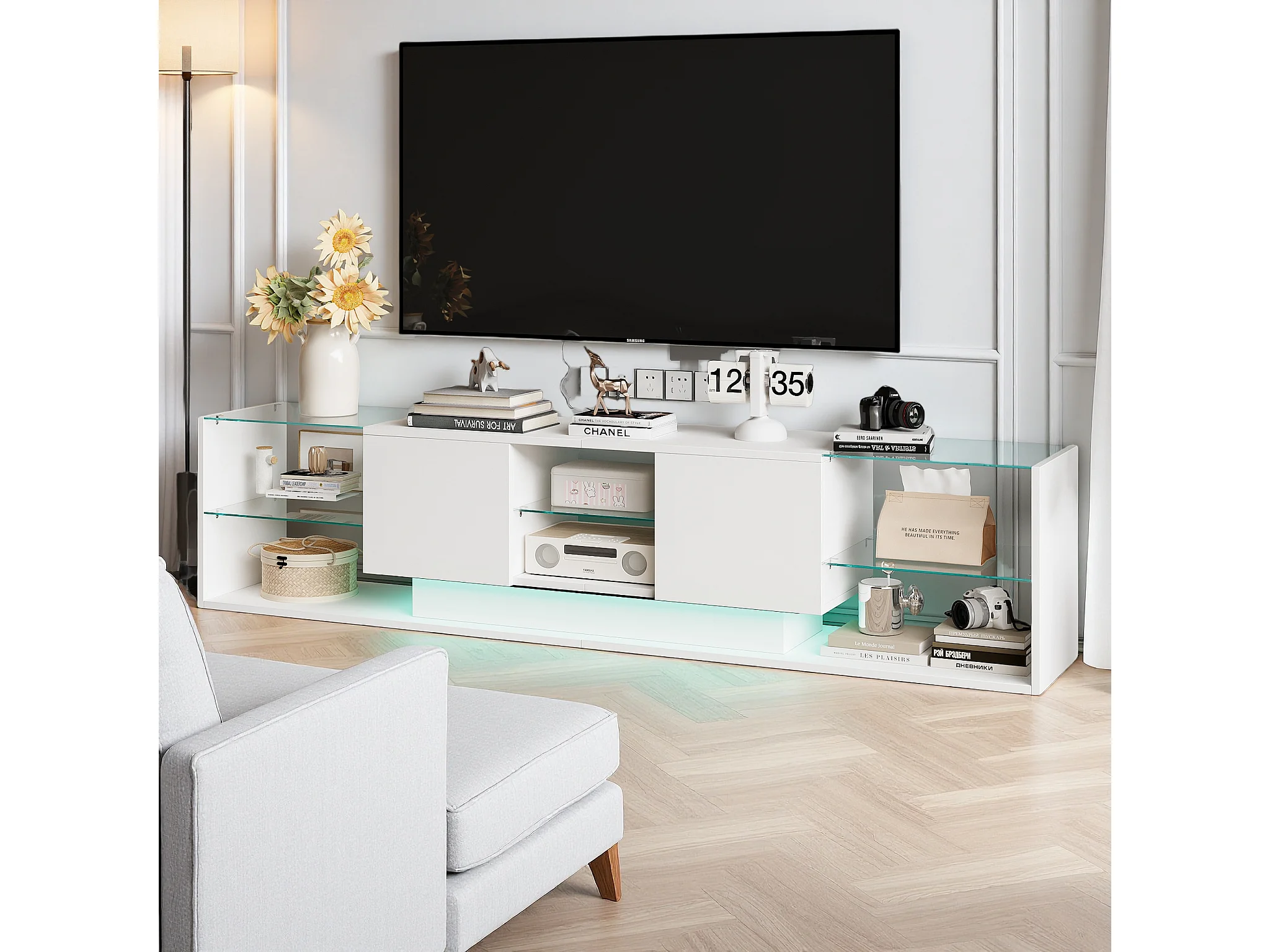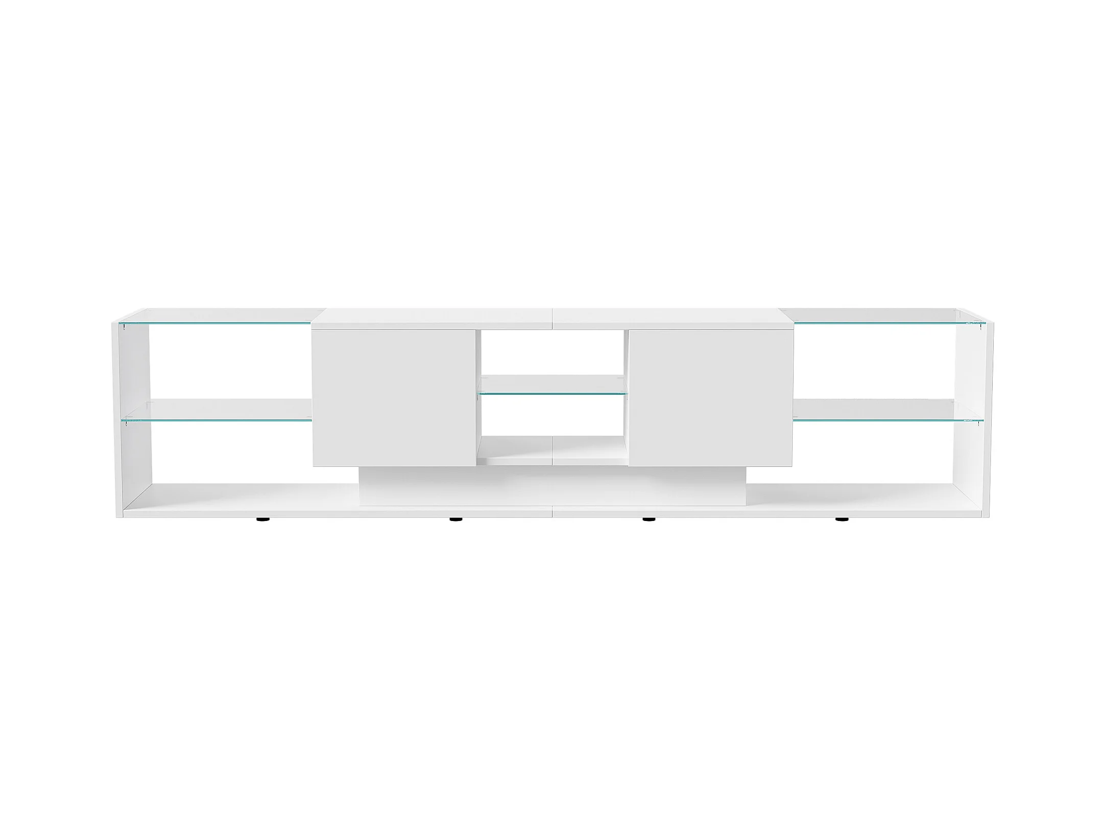 Meuble TV LED, Meuble TV Blanc Brillante, Armoire De Télévision avec 2 Tiroirs, Étagères Ouvertes en Verre, Meuble Tele, 200x35x45cm