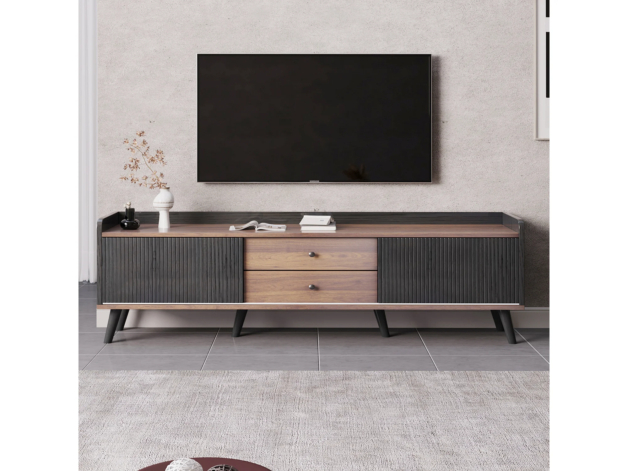 Meuble TV Lowboard noir/bois naturel avec 2 tiroirs, 2 portes coulissantes et plaque basse. H58×L160×P40 cm, parfait salon, grand espace de rangement