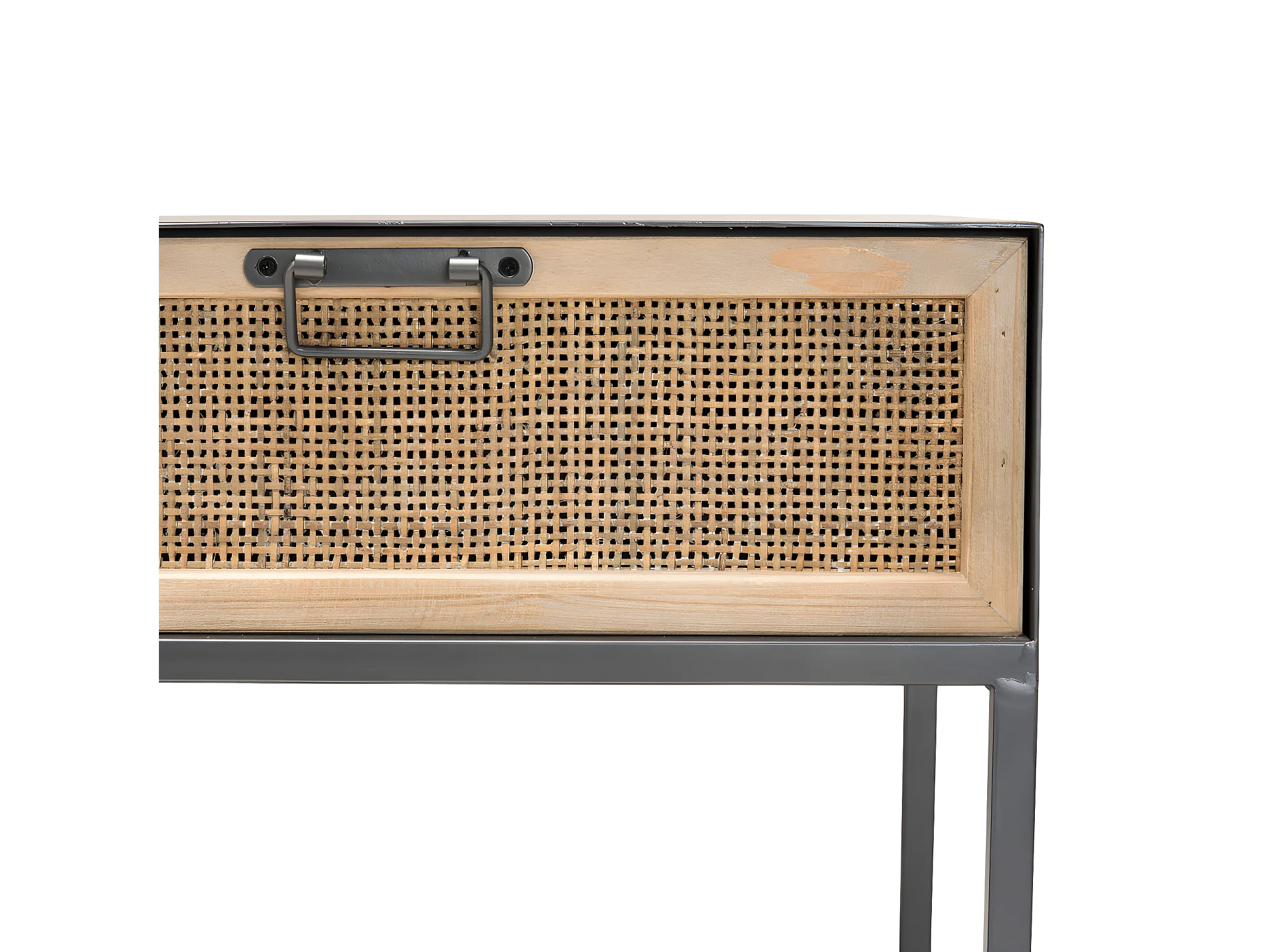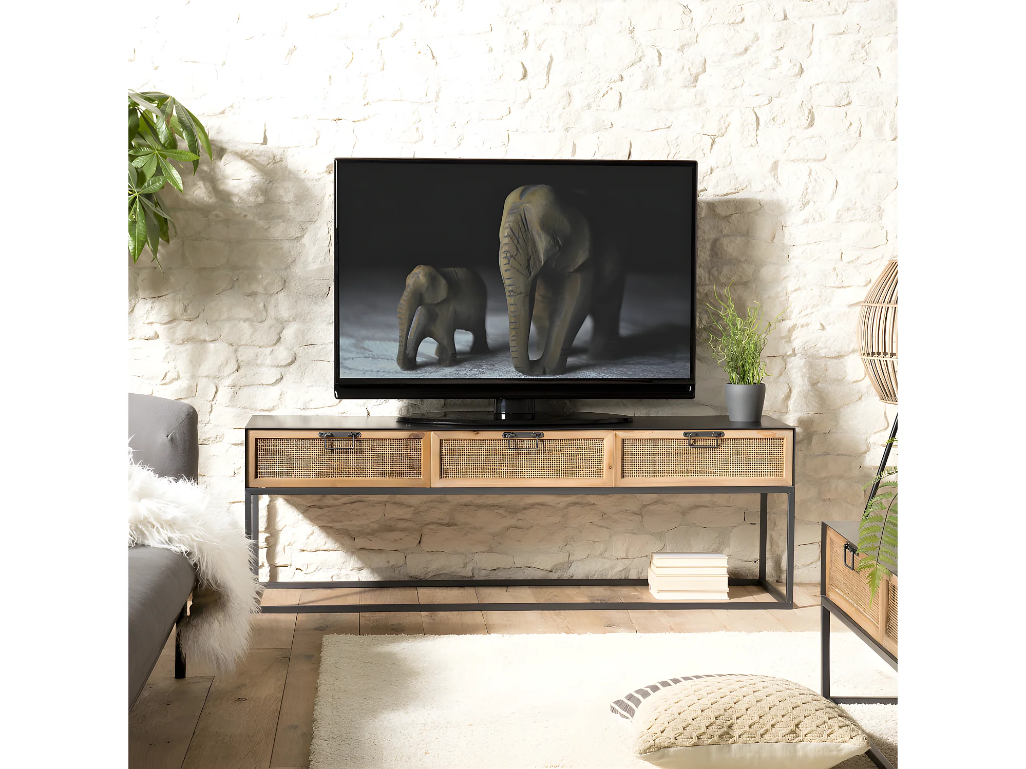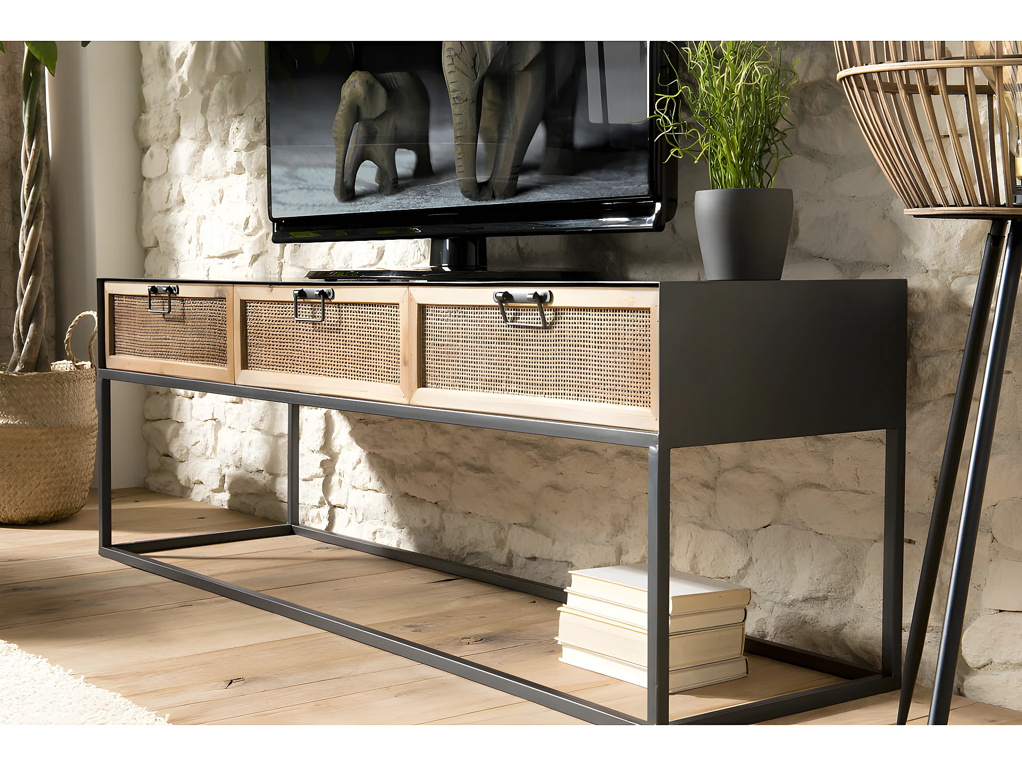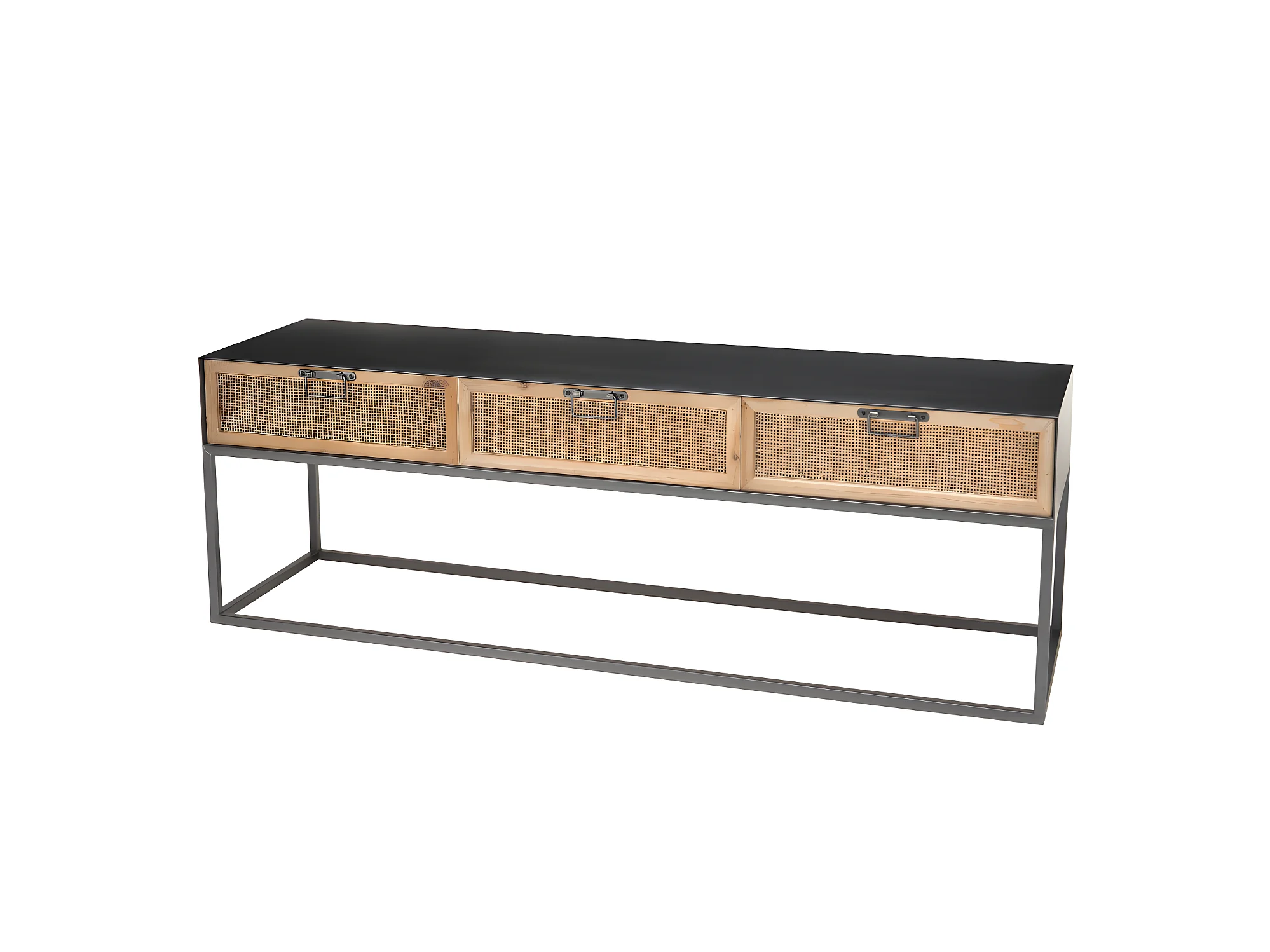 DORIANE - Meuble TV noir métal 3 tiroirs cannage naturel
