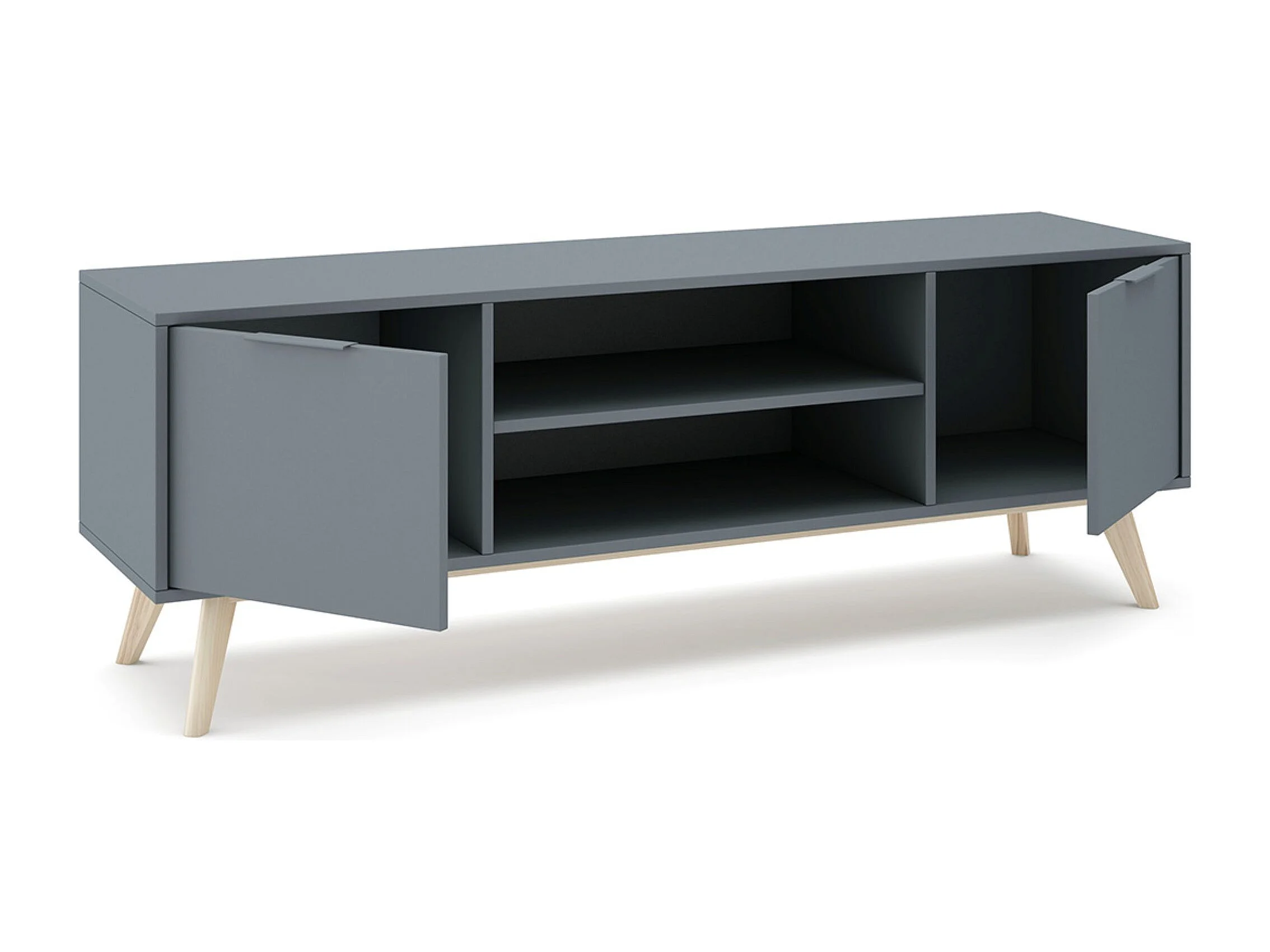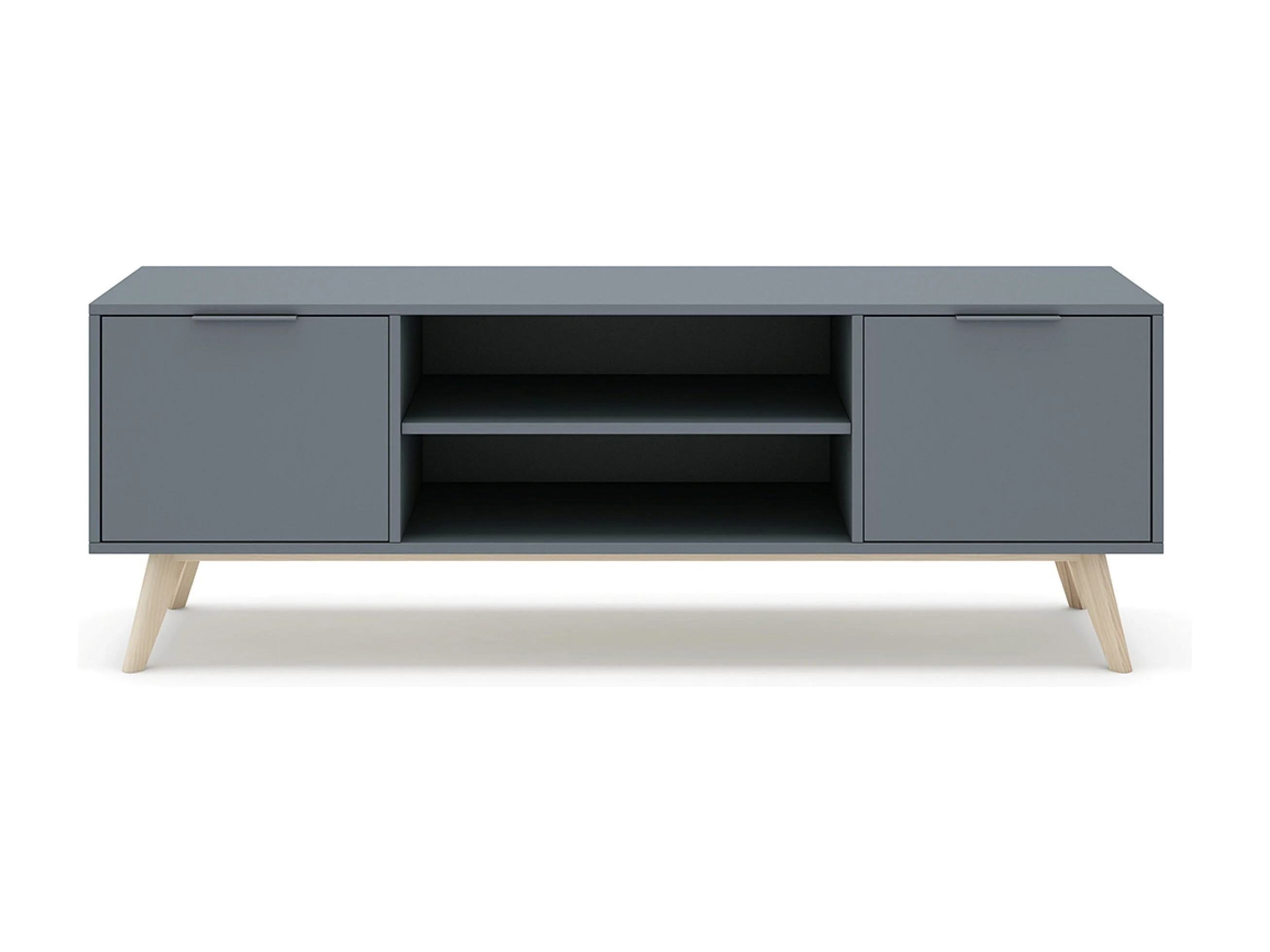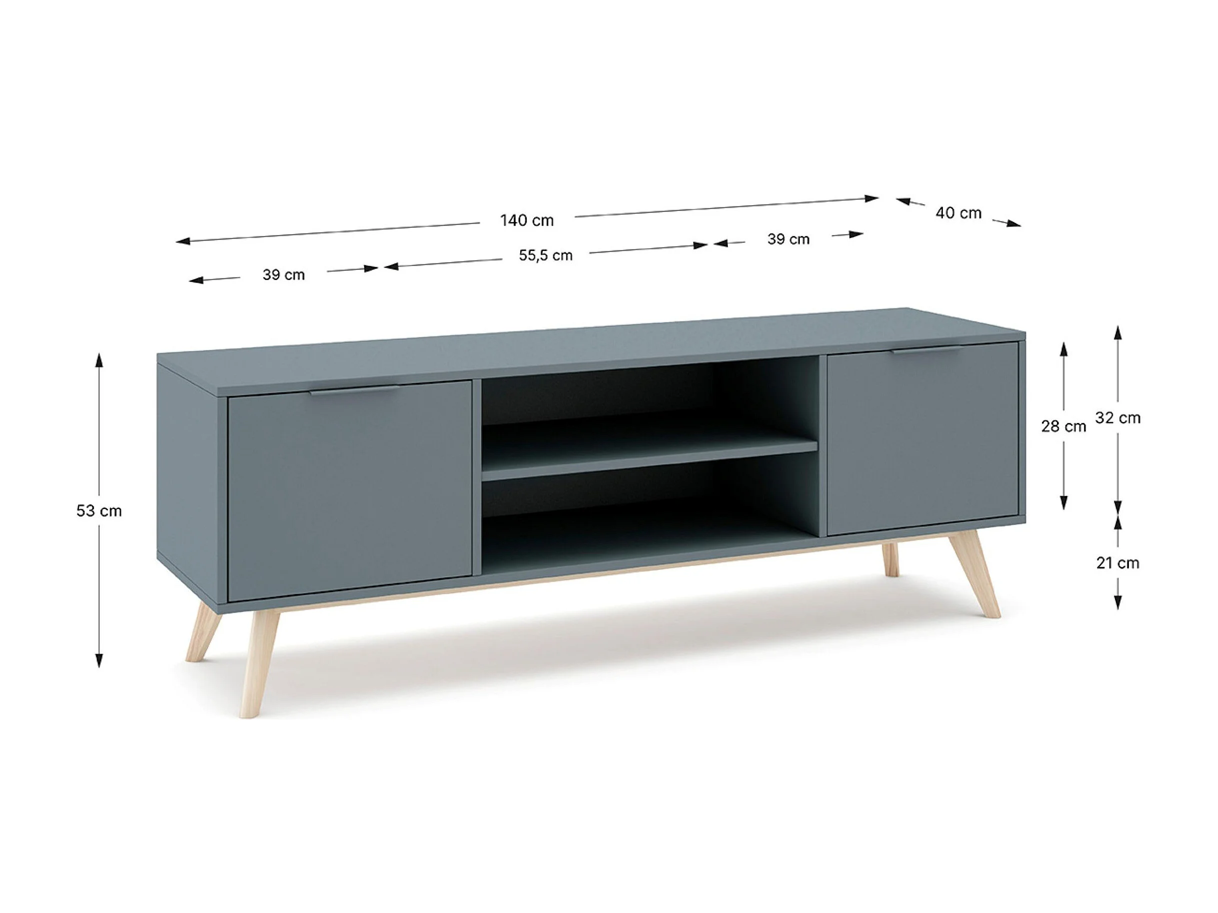 Meuble TV, Meuble de salon aspect bois avec 2 portes et 2 niches coloris Vert Kaki, pieds en pin coloris blanc ciré - Longueur 140 x Profondeur 40 x Hauteur 53 cm