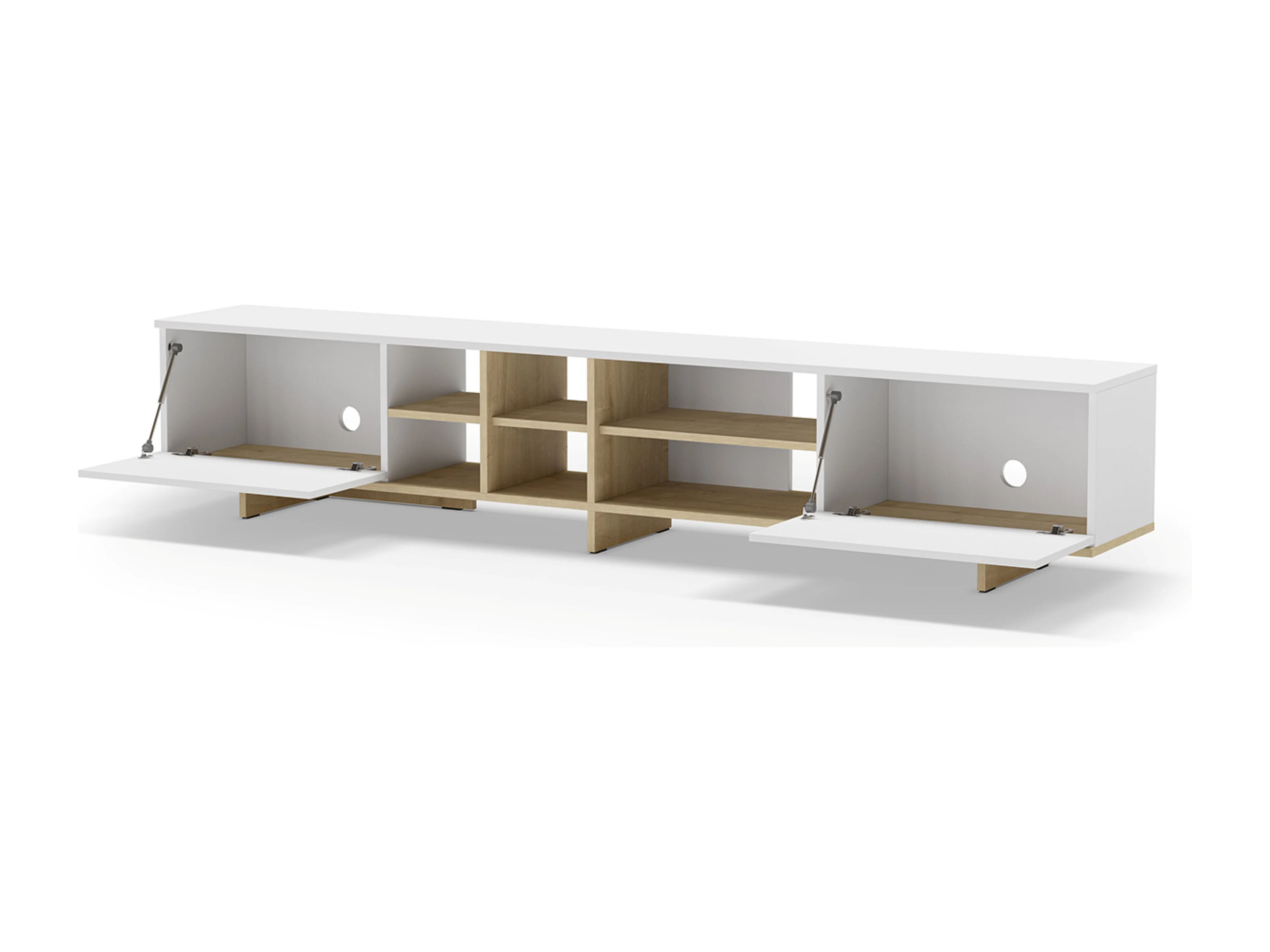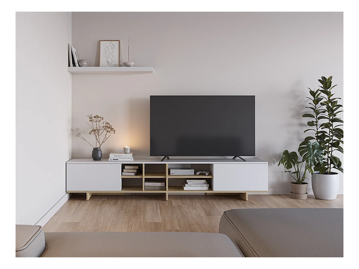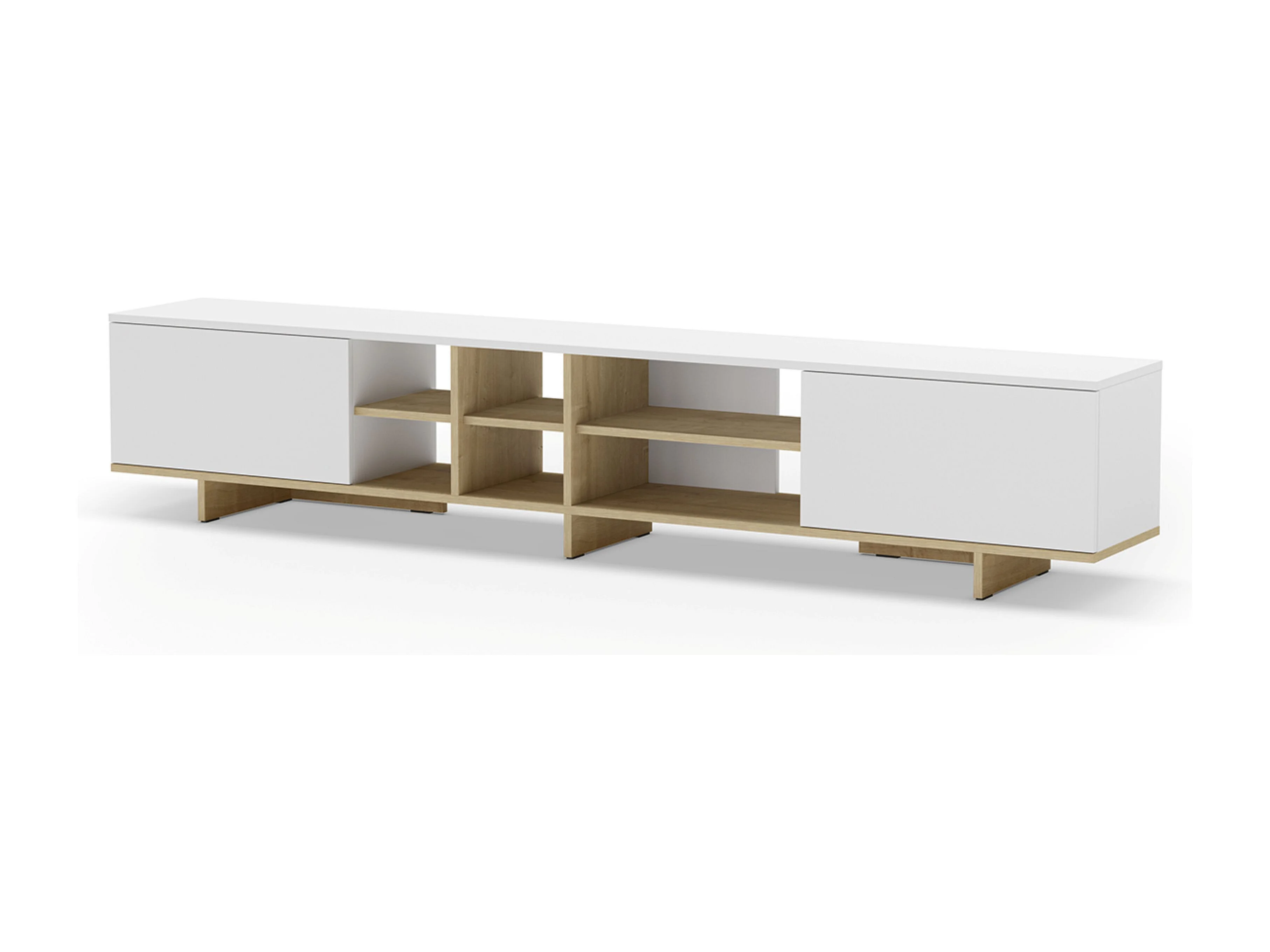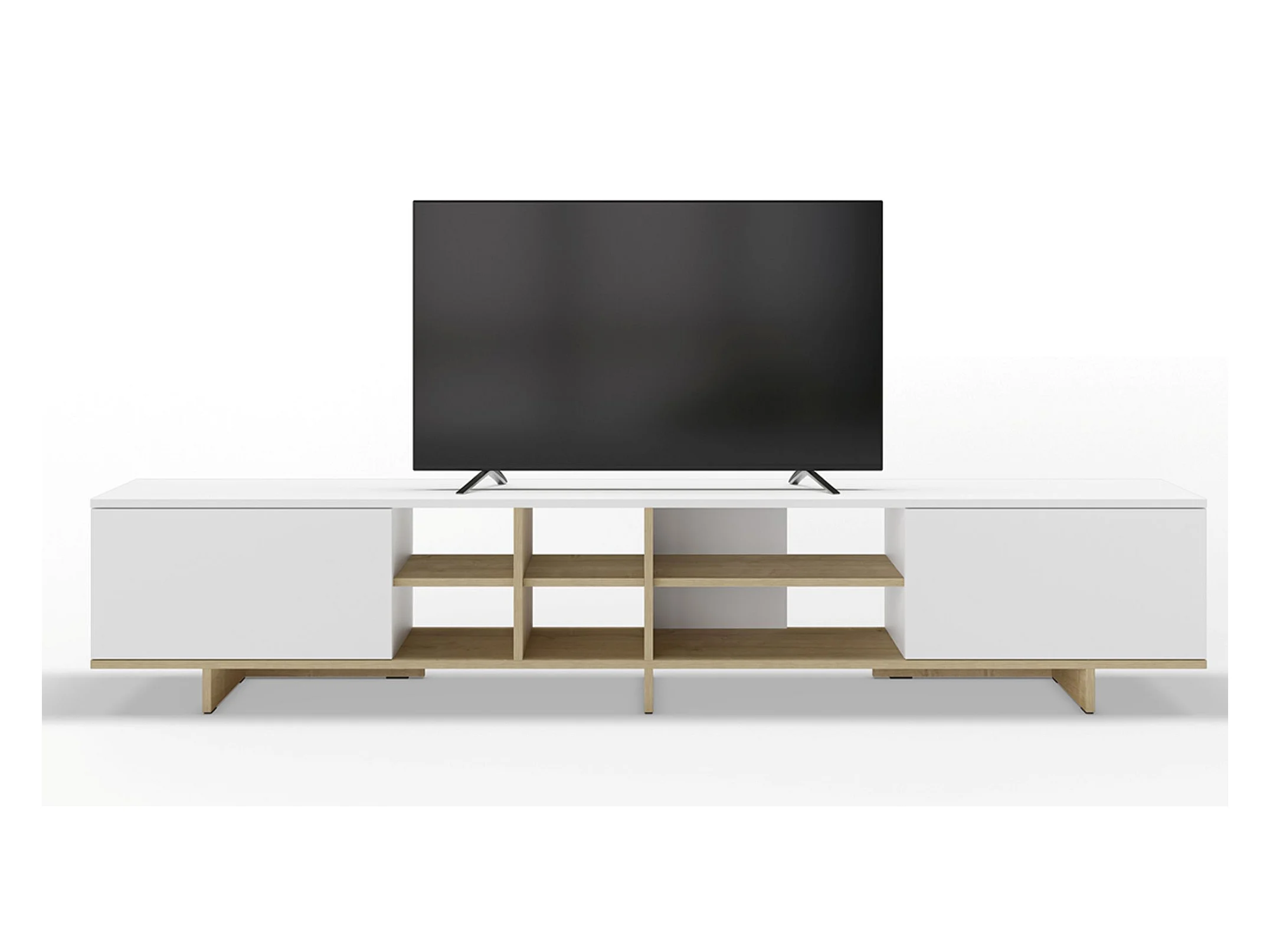 Meuble TV, meuble de salon avec 2 portes aspect bois coloris blanc, chêne - Longueur 230 x Profondeur 35,60 x Hauteur 44 cm