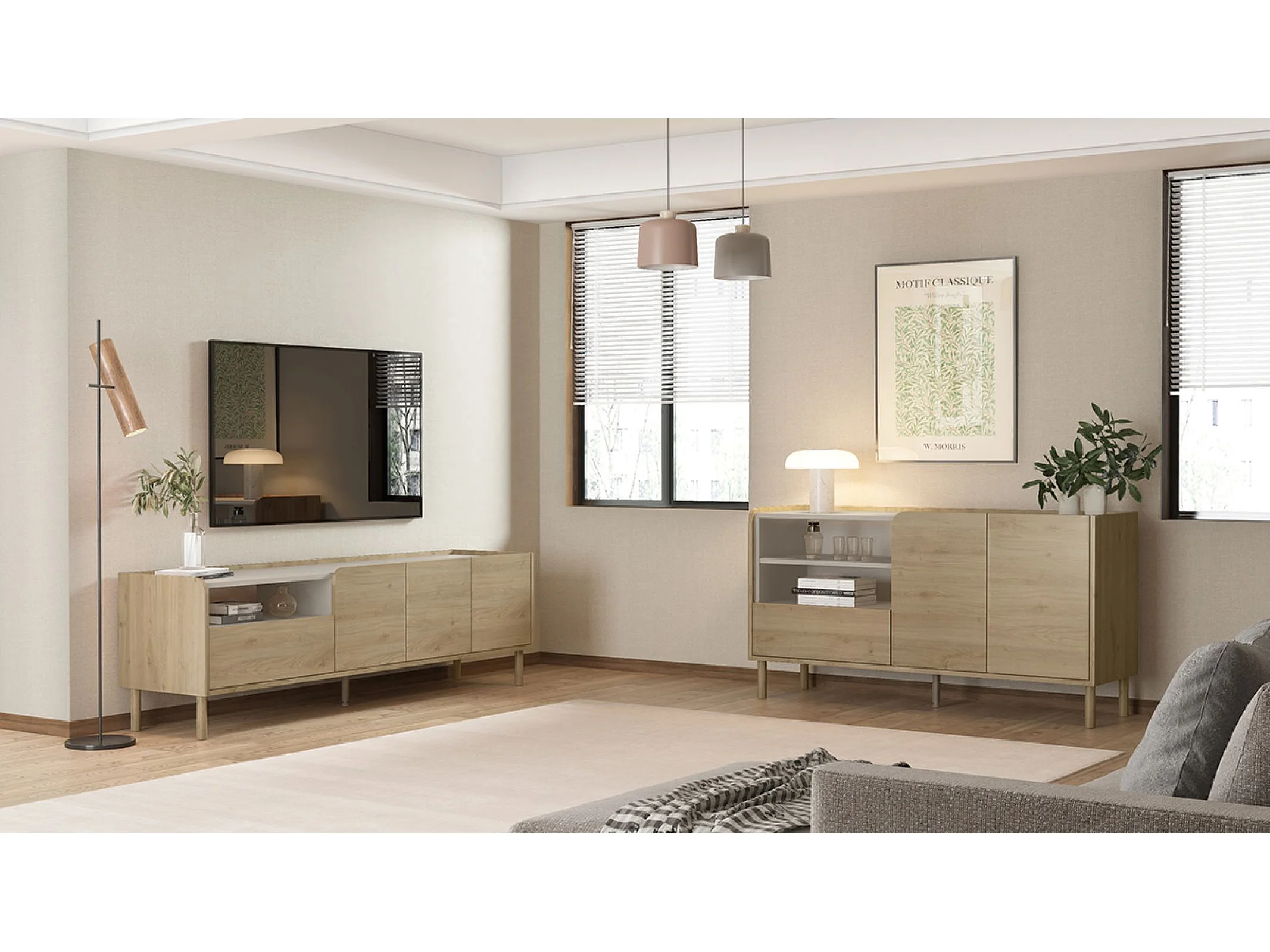 Meuble TV, meuble de salon avec 3 portes et 1 tiroir aspect bois coloris chêne - Longueur 180 x Profondeur 44 x Hauteur 55,50 cm