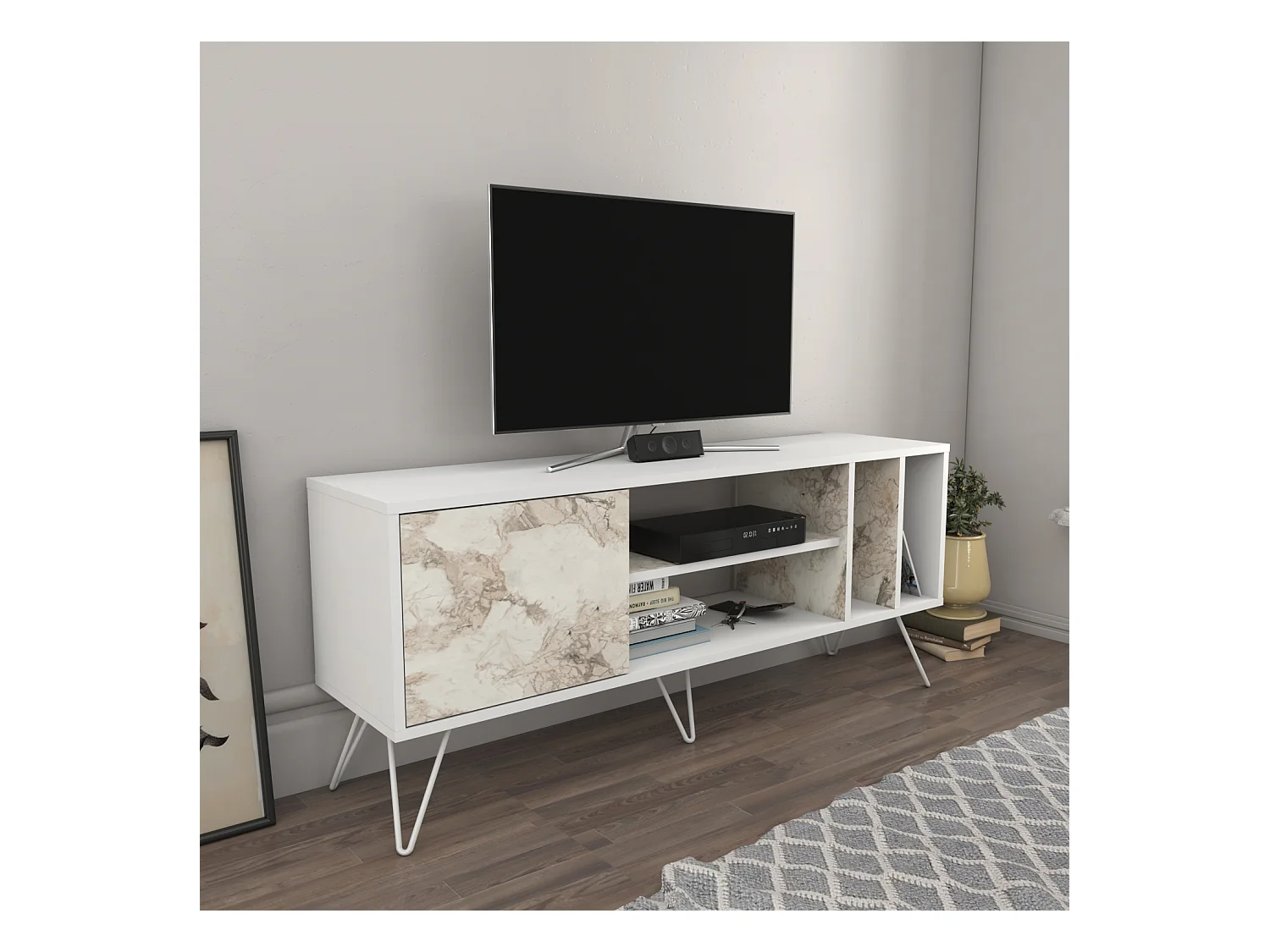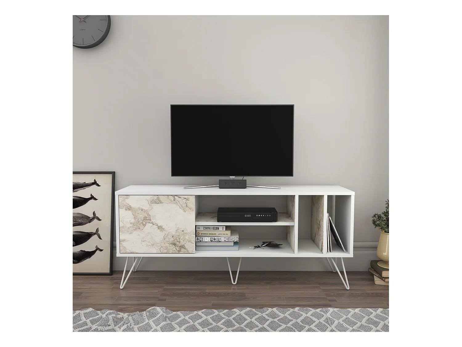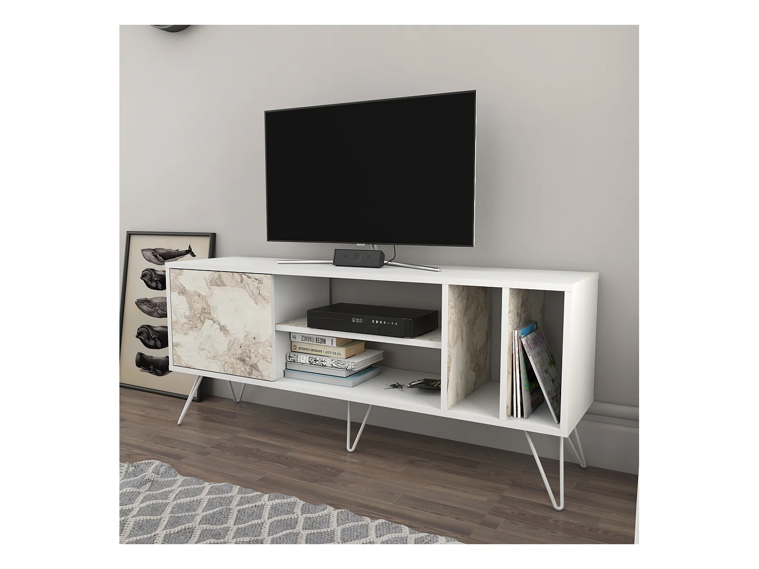 Meuble TV Mistico de 140 cm avec étagères ouvertes et armoire (Blanc et Effet marbre blanc)