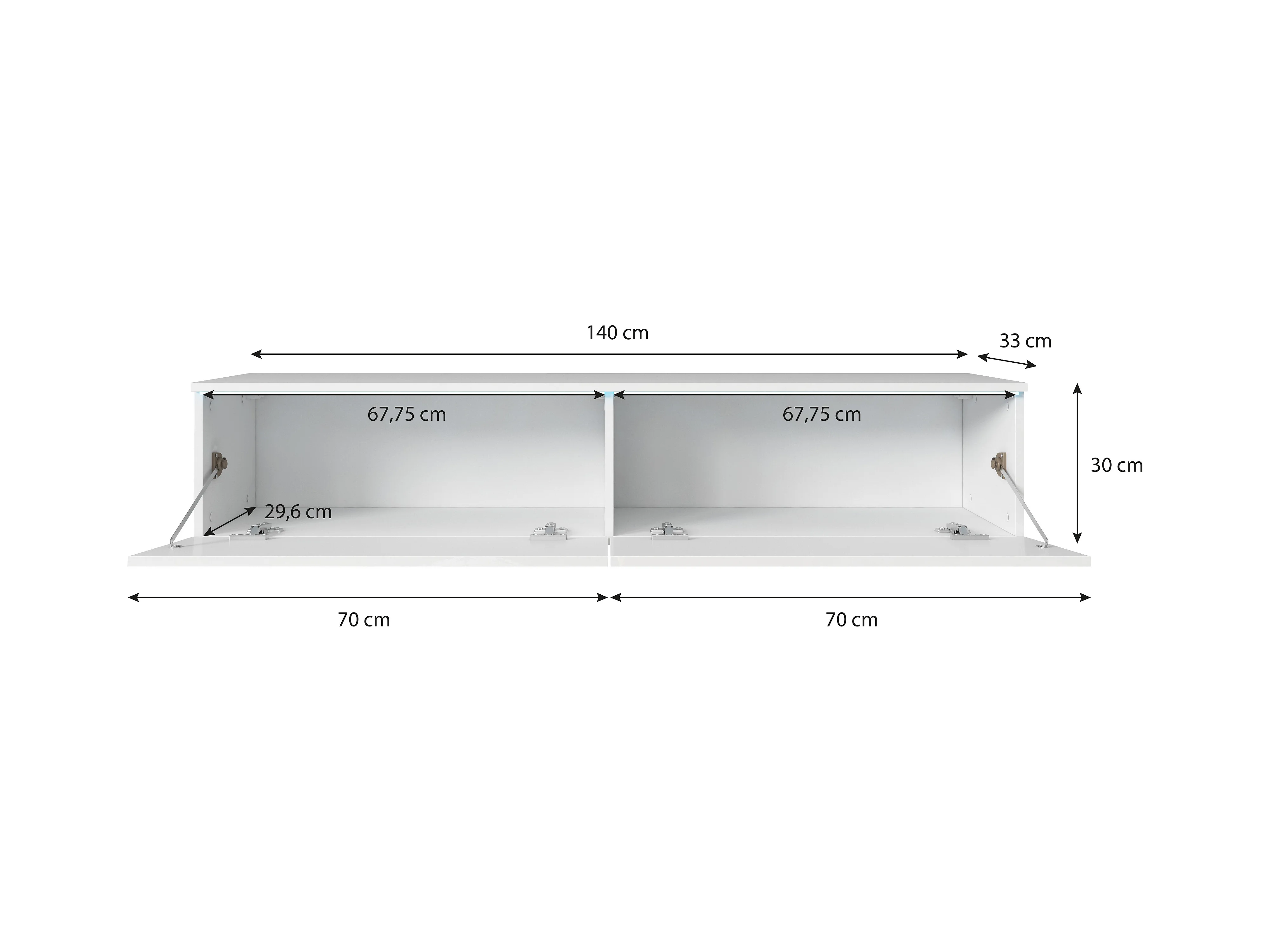 Meuble TV moderne 140 cm avec LED 2 portes, sans poignées, caisson blanc mat, façades blanc brillant, posé ou suspendu