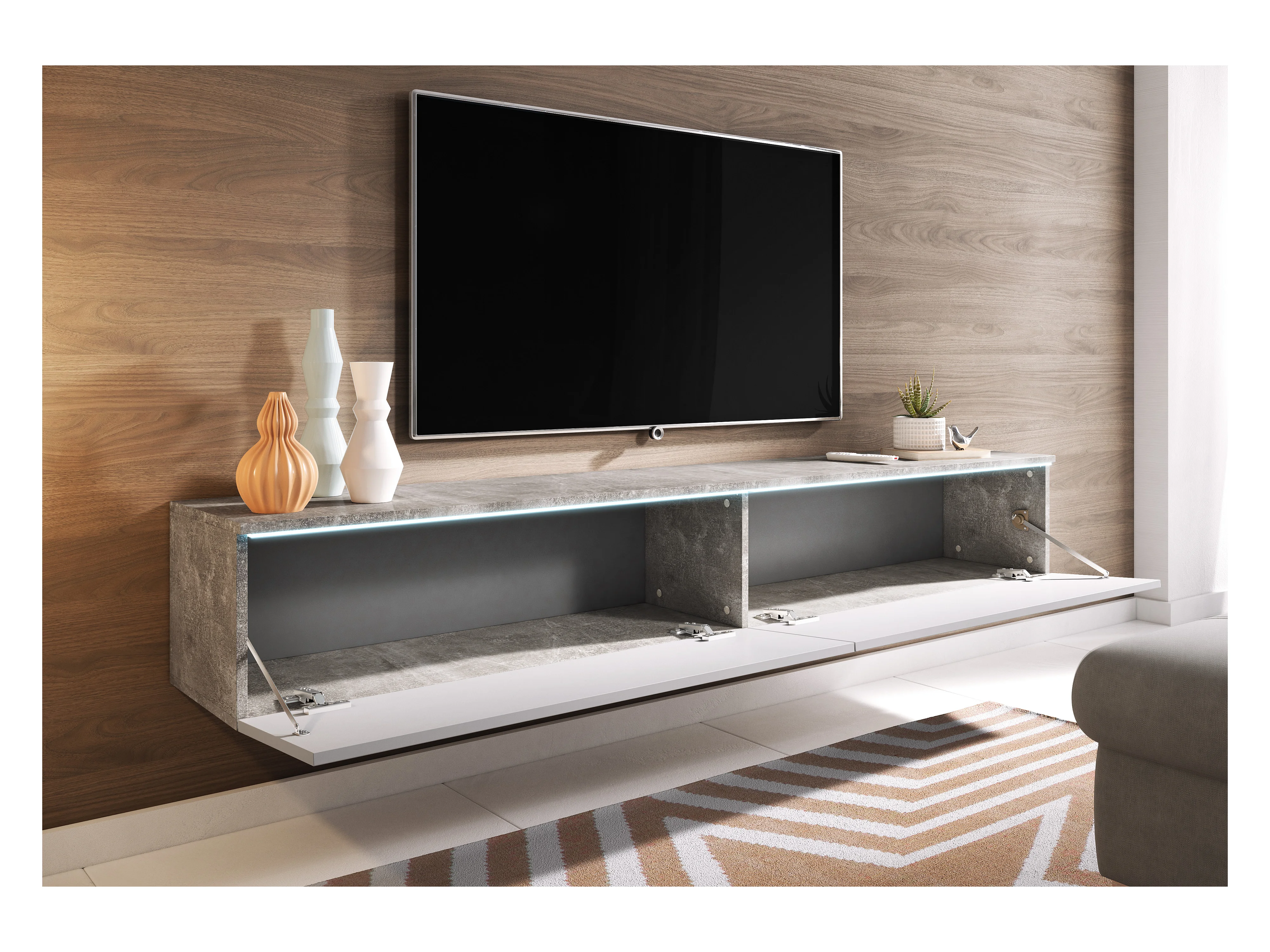 Meuble TV moderne 180 cm pour salon avec LED – 2 portes, sans poignées, caisson béton mat, façades blanc brillant, à poser ou à suspendre