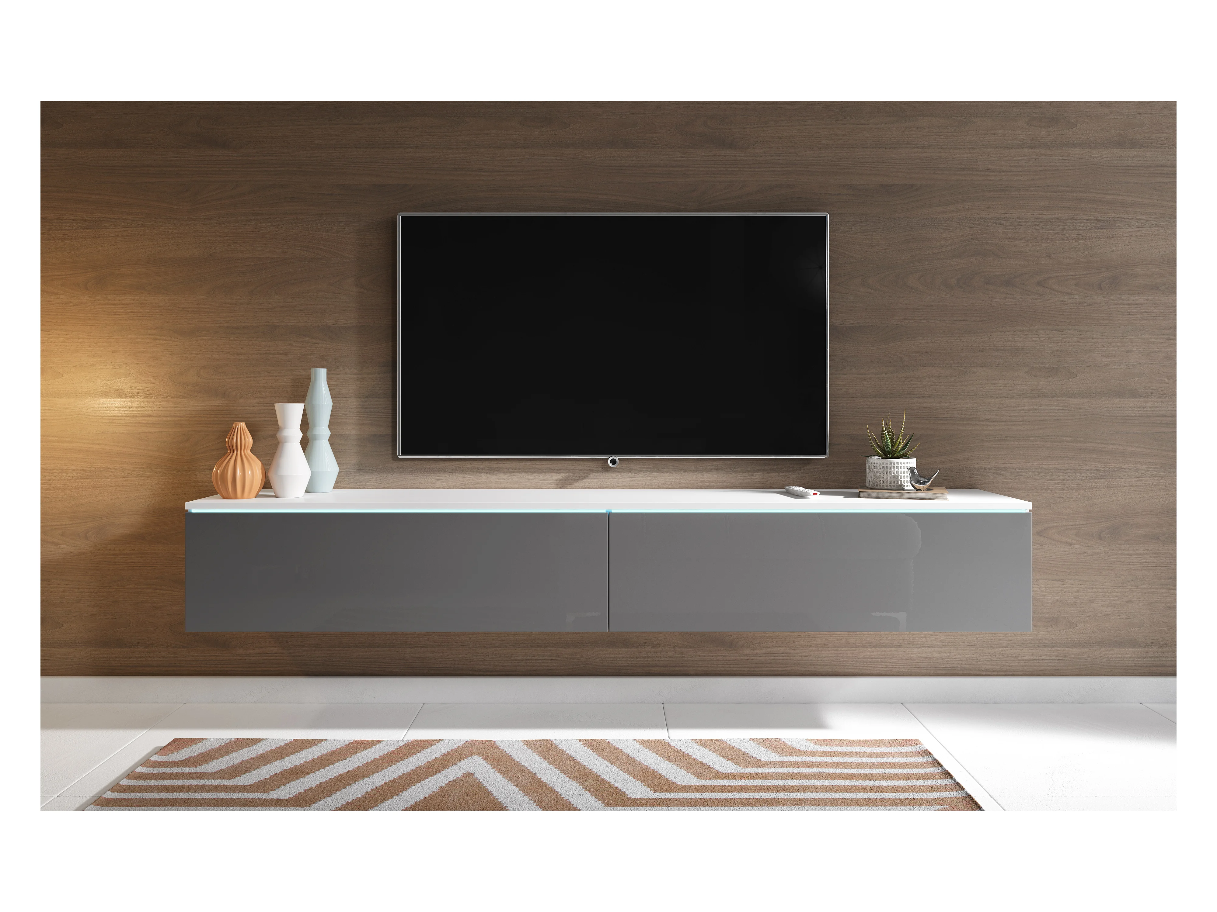 Meuble TV moderne 180 cm pour salon avec LED – 2 portes, sans poignées, caisson blanc mat, façades gris brillant, à poser ou à suspendre