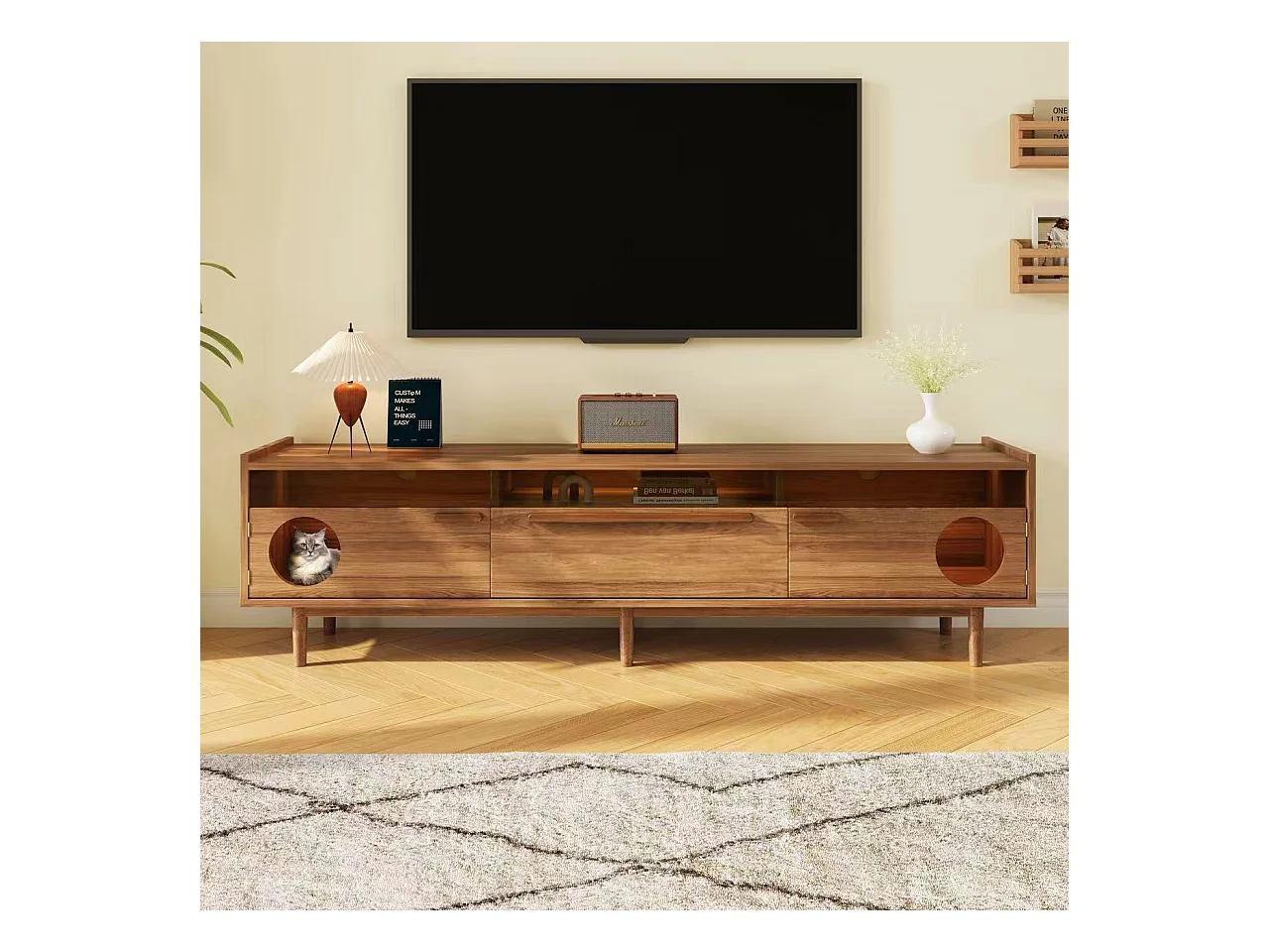 Meuble TV moderne 180x40x50cm - espace de repos pour animaux - avec éclairage LED - 1 tiroir et 2 portes - naturel