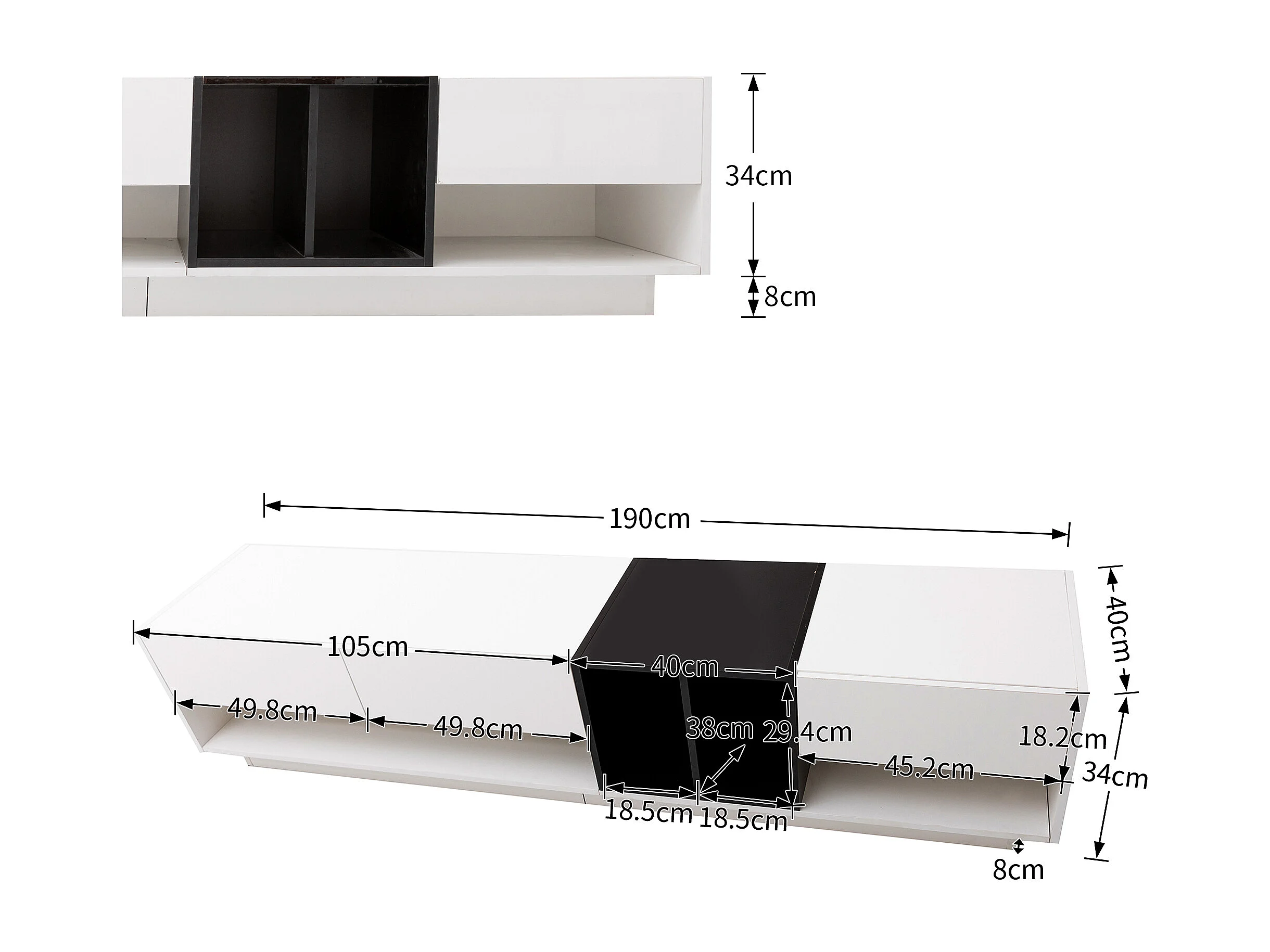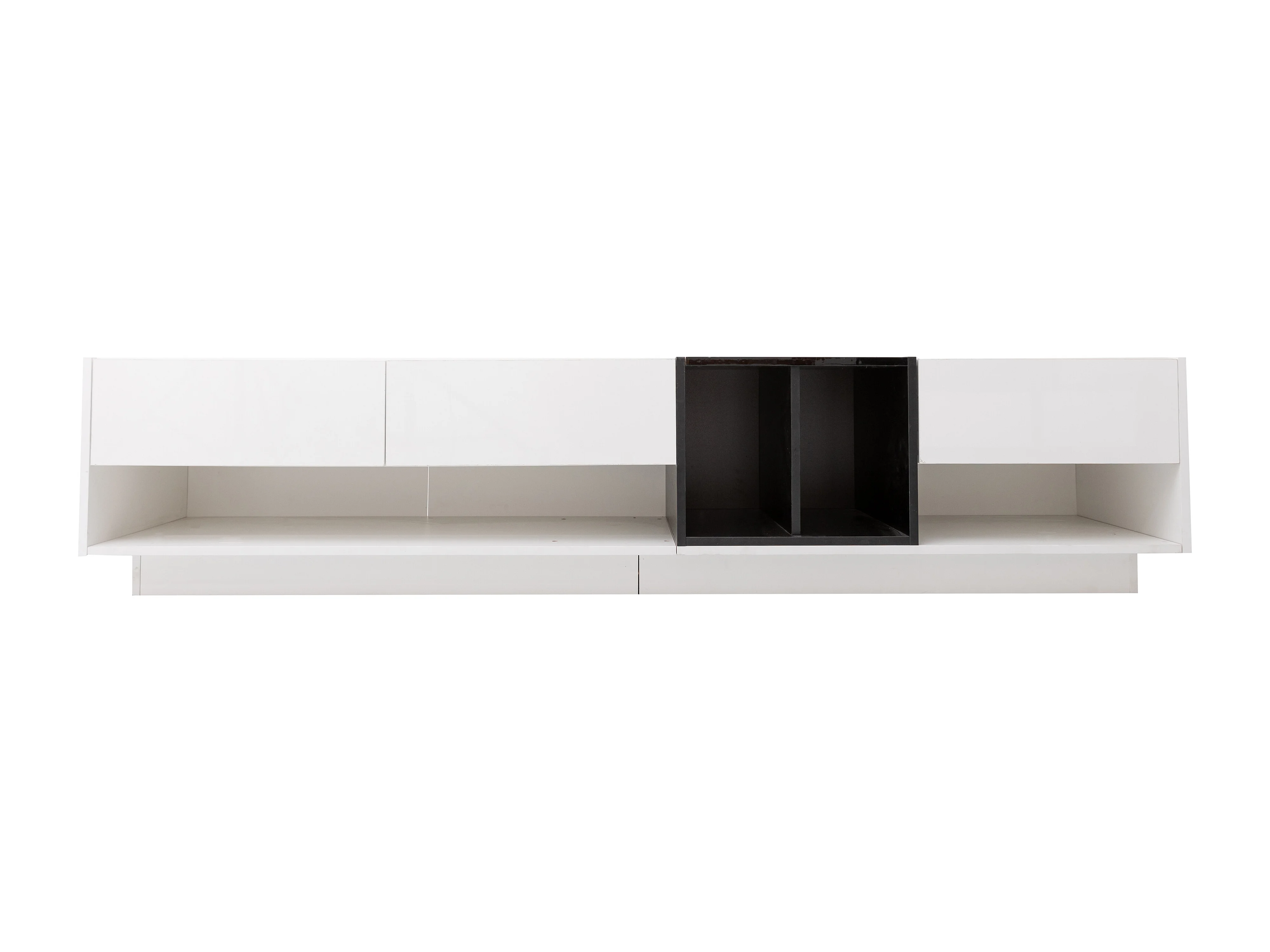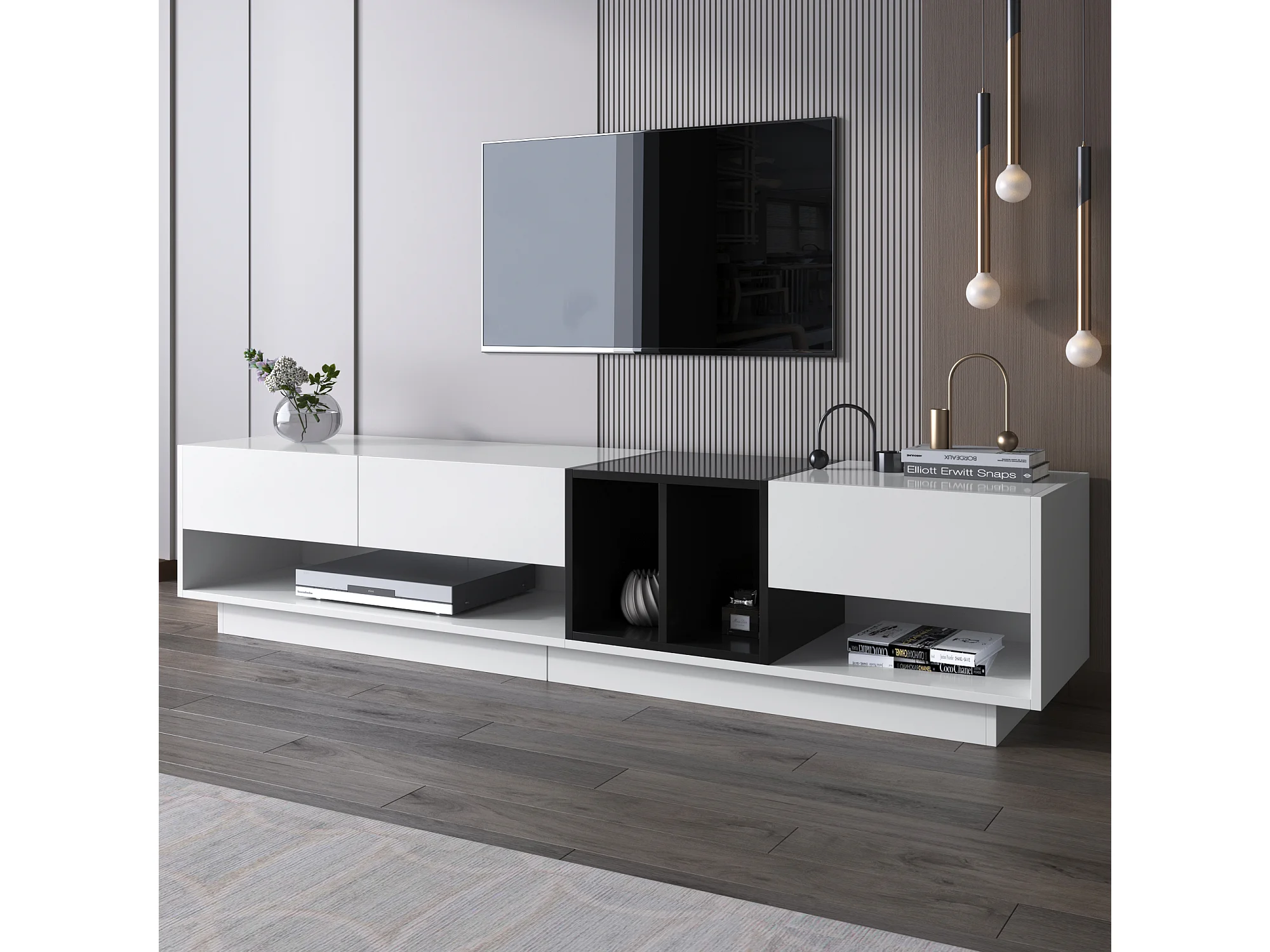 Meuble TV noir et blanc avec 3 tiroirs et compartiments de rangement ouverts - pour salon et chambre