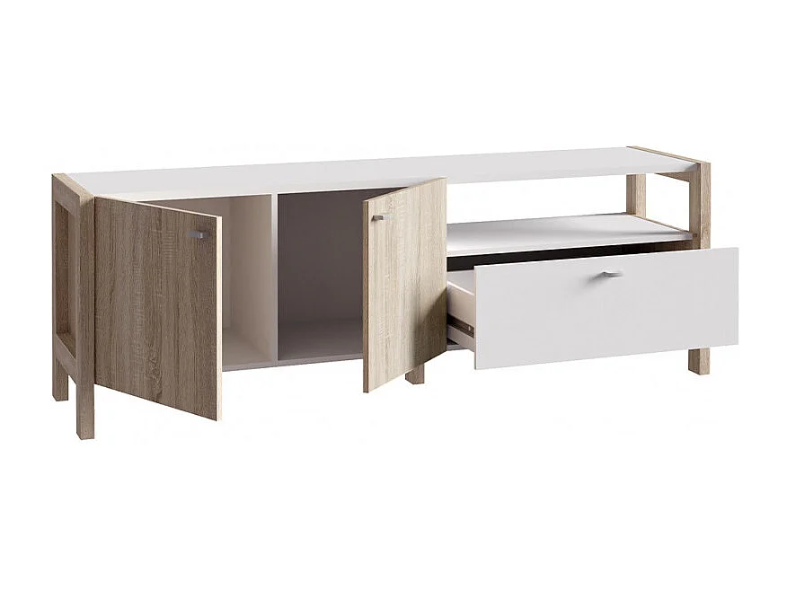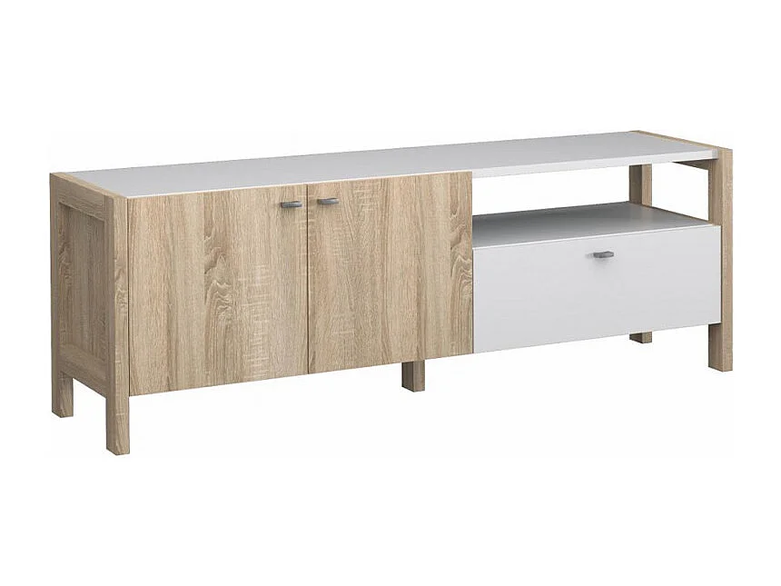 Meuble TV moderne 2 portes et 1 tiroir décor blanc et chêne - NORWAY