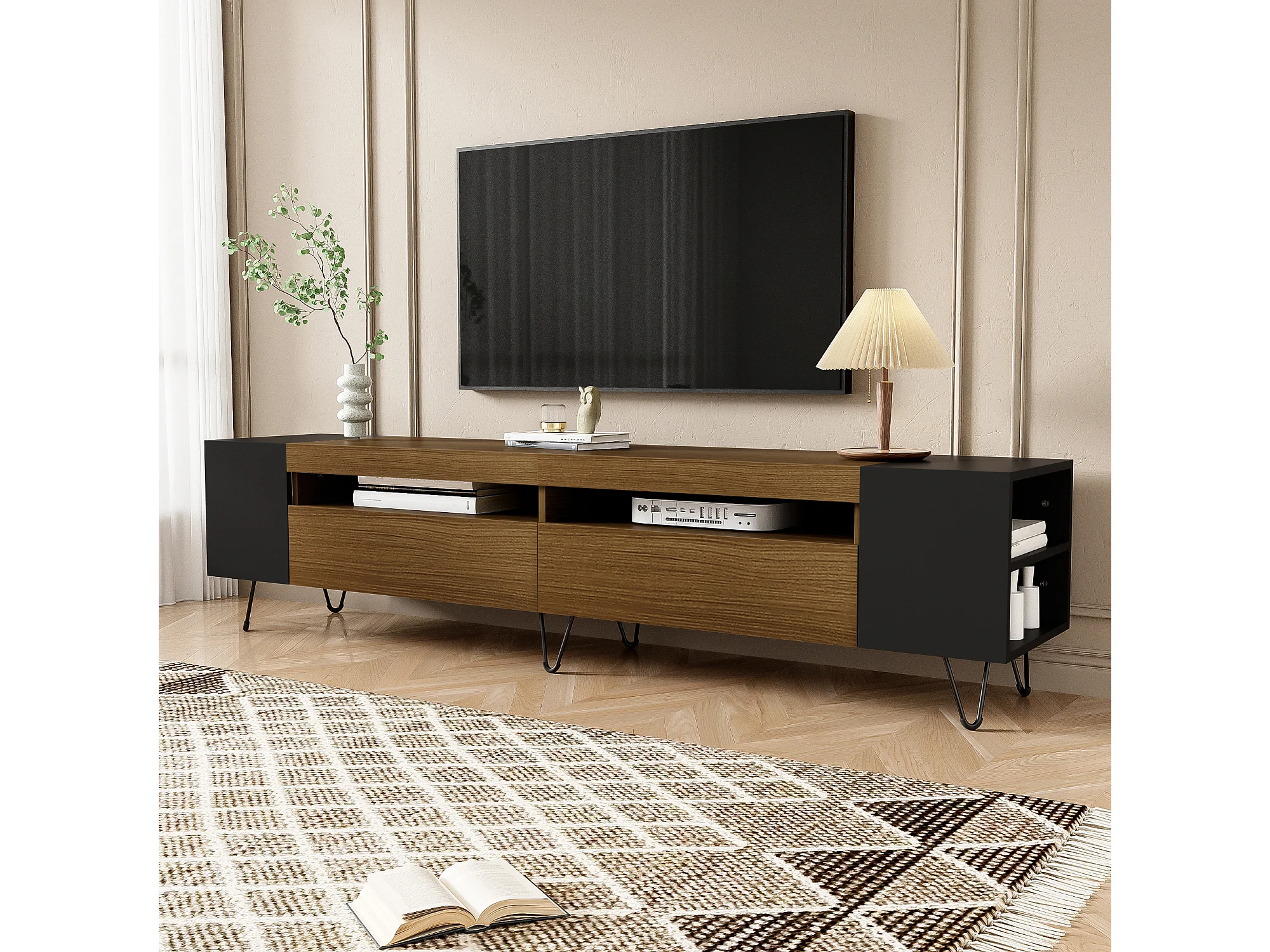 Meuble TV bas de style industriel rétro 180 cm, banc TV avec 2 portes et 2 tiroirs, noir+bois