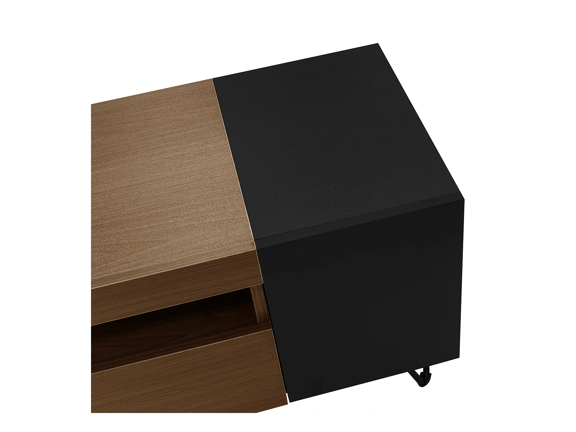 Meuble TV bas avec tiroirs, Meuble TV moderne avec deux portes coulissantes, noir et couleur bois